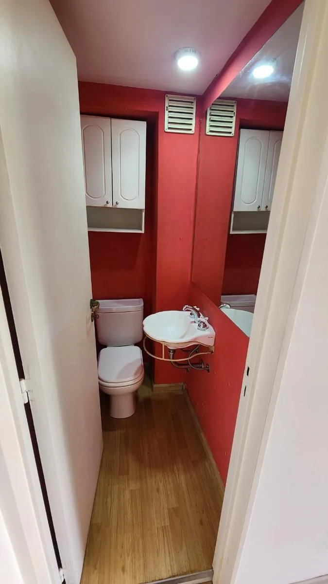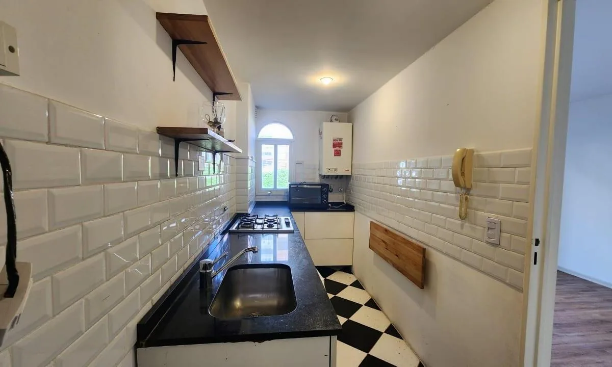 Apartamento de 3 ambientes com 2 dormitórios, 1 banheiro completo e lavabo, no primeiro andar de fundos (contrafrente). Inclui vaga de garagem coberta no primeiro subsolo e elevador no prédio. Sala de estar e jantar com saída para varanda de 3 m²; cozinha independente com conexão para lavadora (lavarropas). Aquecimento com radiadores e caldeira individual; ar-condicionado frio e quente no living. Condomínio em abril: ARS 200.000; IPTU (ABL) em abril: ARS 44.000.