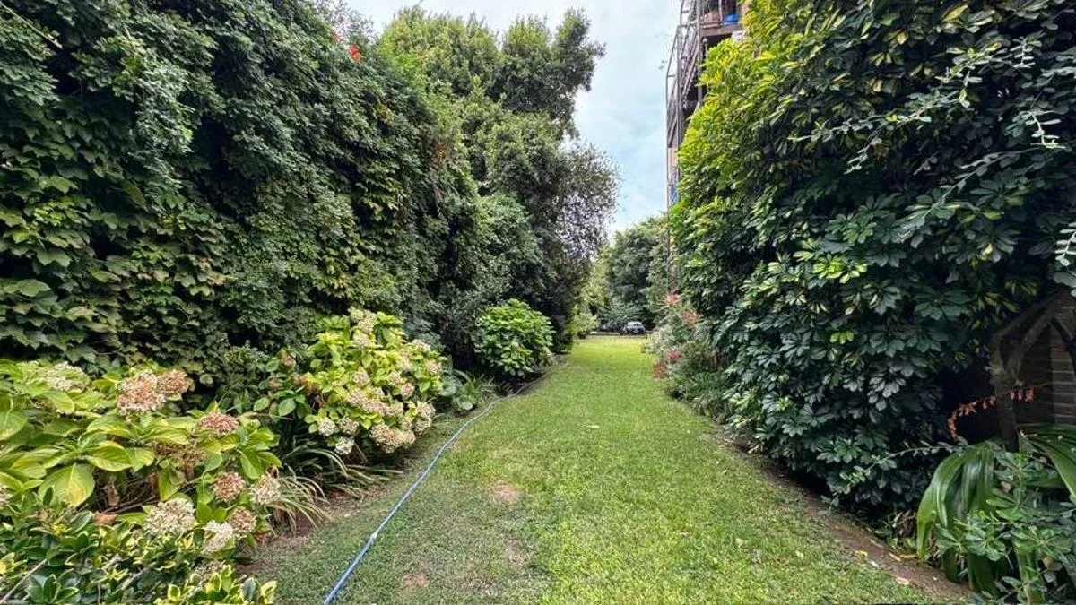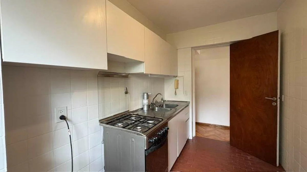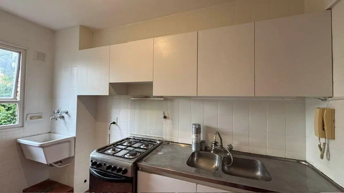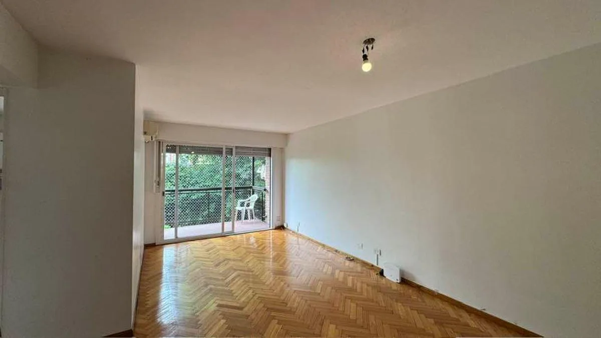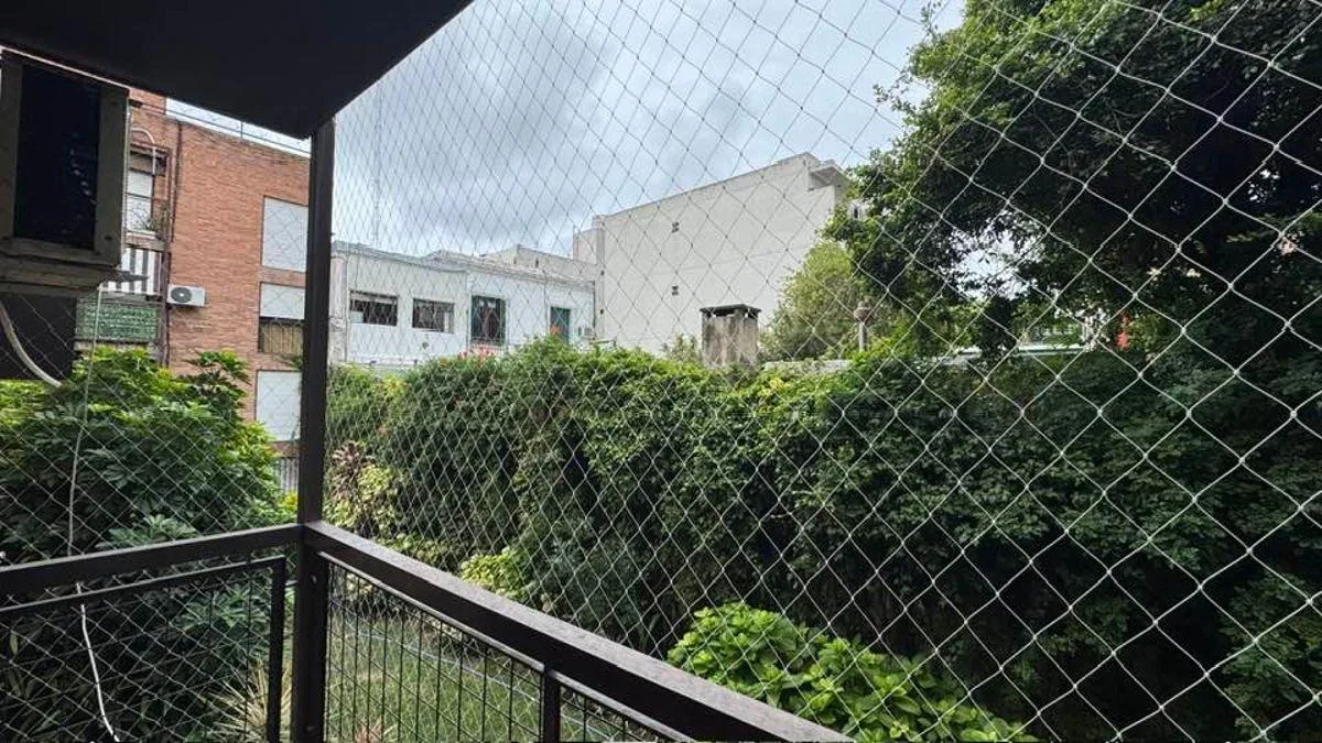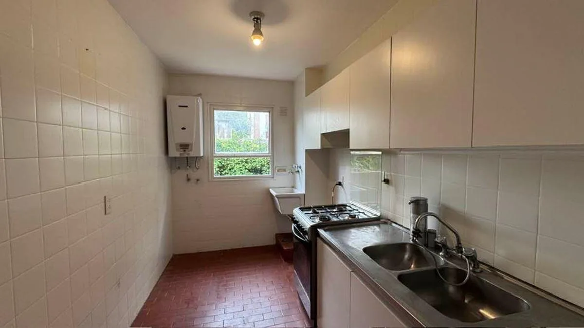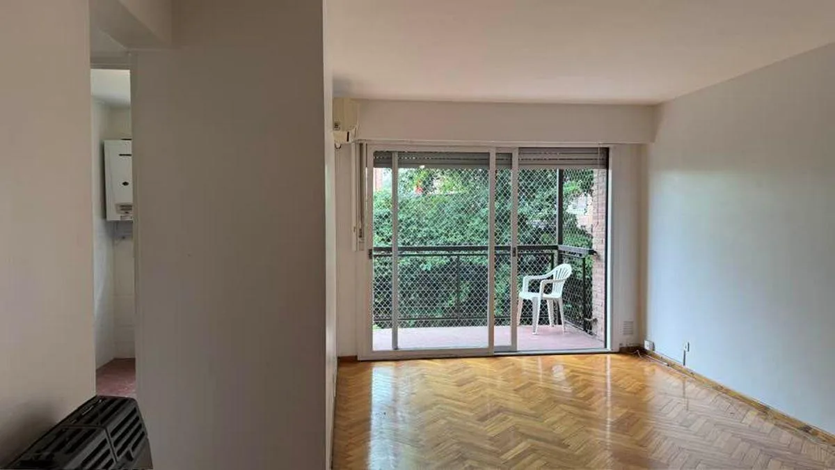 Apartamento de três ambientes com 2 dormitórios, 1 banheiro completo e varanda em edifício de tijolos à vista em San Isidro. A unidade fica no segundo corpo, com vista para o jardim interno e parcialmente lateral; inclui pisos de madeira, persianas em todos os ambientes e ar-condicionado (3 unidades, nos dormitórios e na sala). Há aquecimento por estufa a gás, cozinha com área de armazenamento acima e abaixo da bancada e conexão para lavadora; portão elétrico e vaga de garagem descoberta. O edif