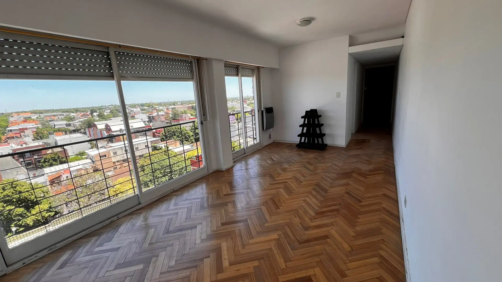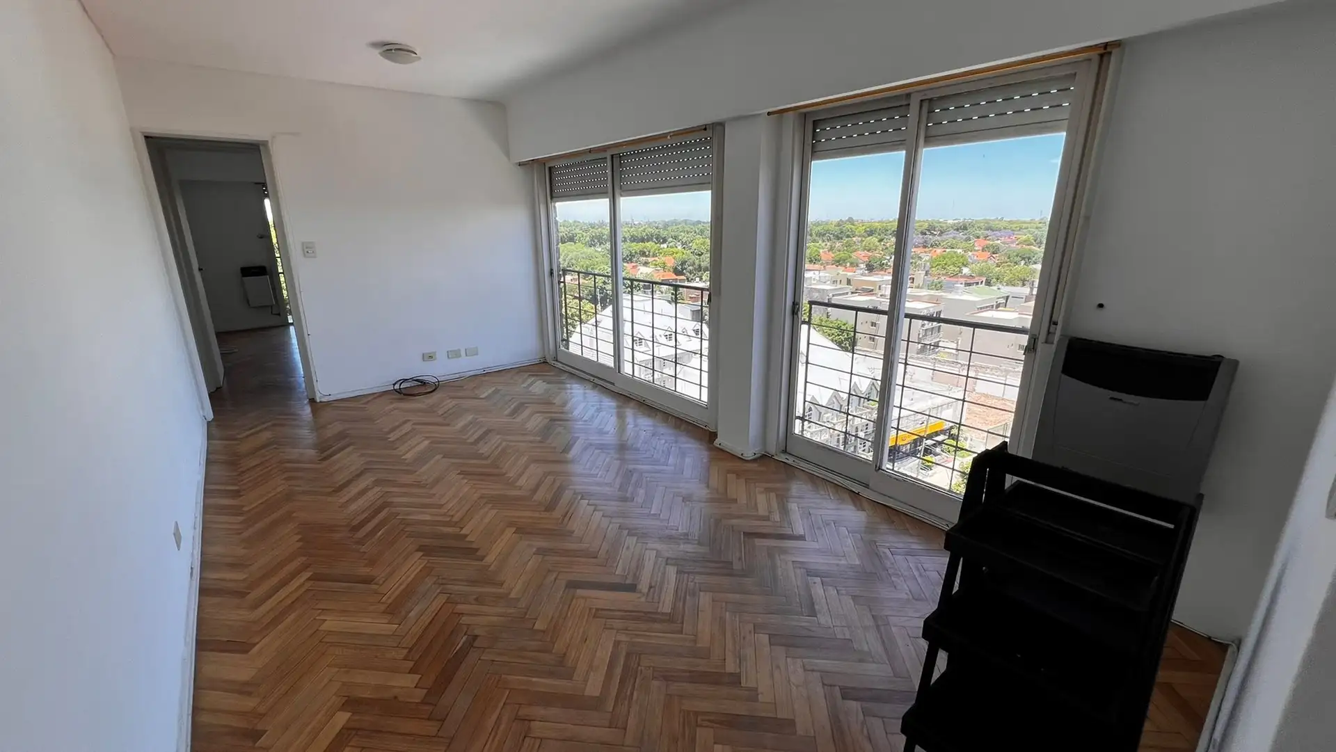 Apartamento de 3 ambientes em San Isidro, com 2 quartos e 1 banheiro. A cozinha tem espaço de lavanderia; há um ambiente de escritório ou área de armazenamento após a lavanderia. O living tem balcão francês e os quartos contam com armários embutidos e saída para um balcão corrido. O imóvel é entregue pintado e com estufas instaladas no living e em um dos quartos. A unidade fica no primeiro corpo e inclui vaga de garagem coberta; o contrato é de 2 anos com atualização trimestral pelo IPC, com pag