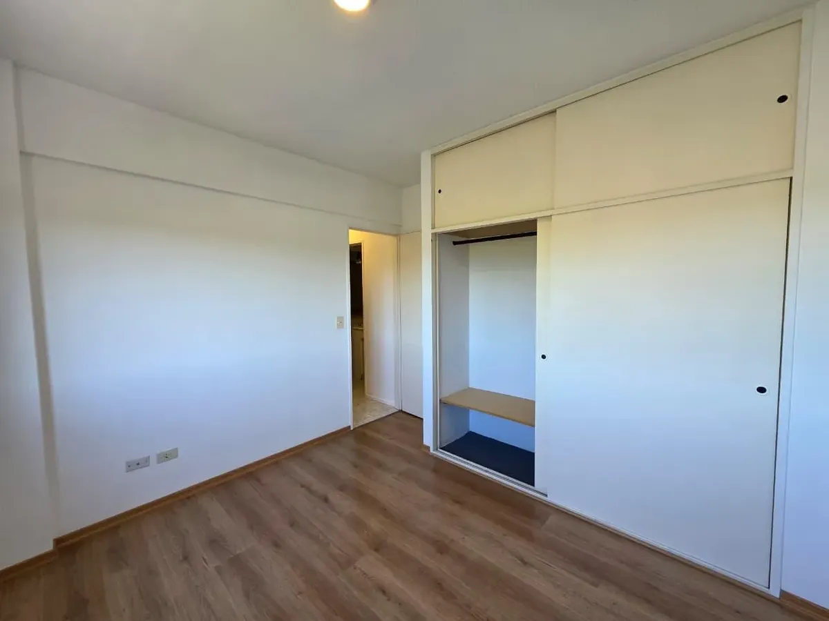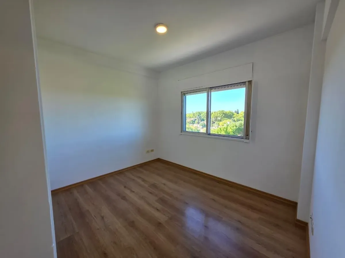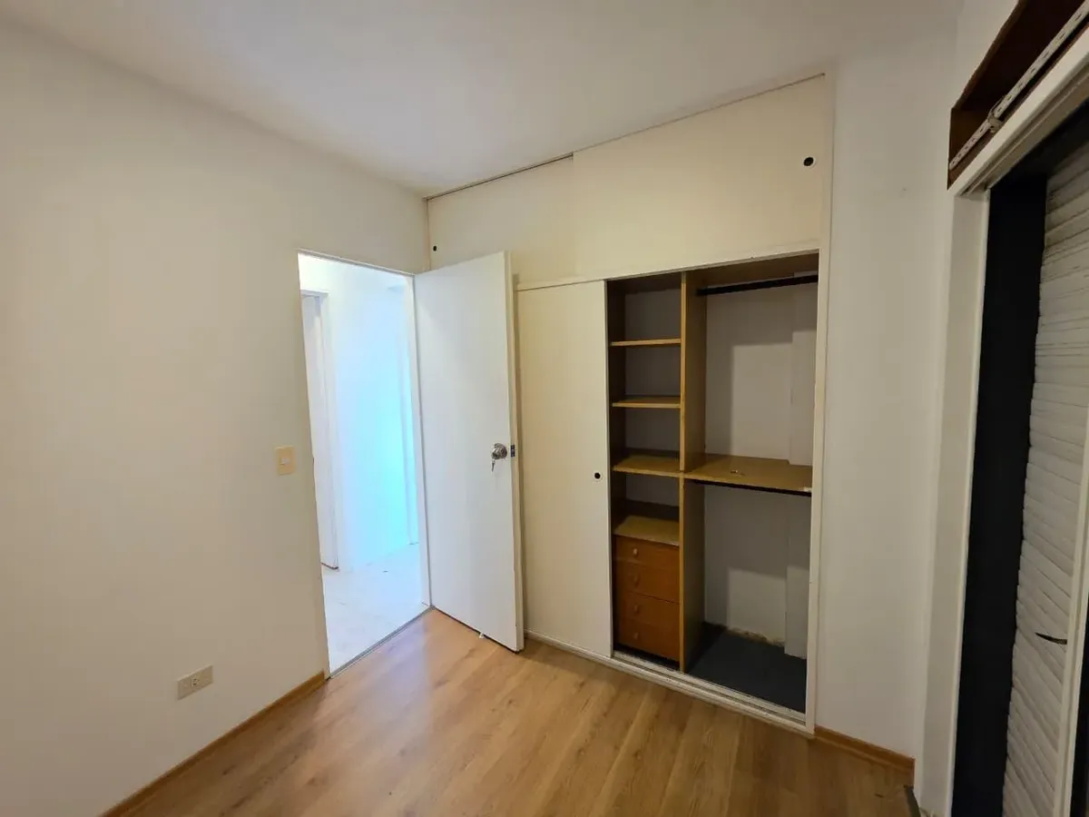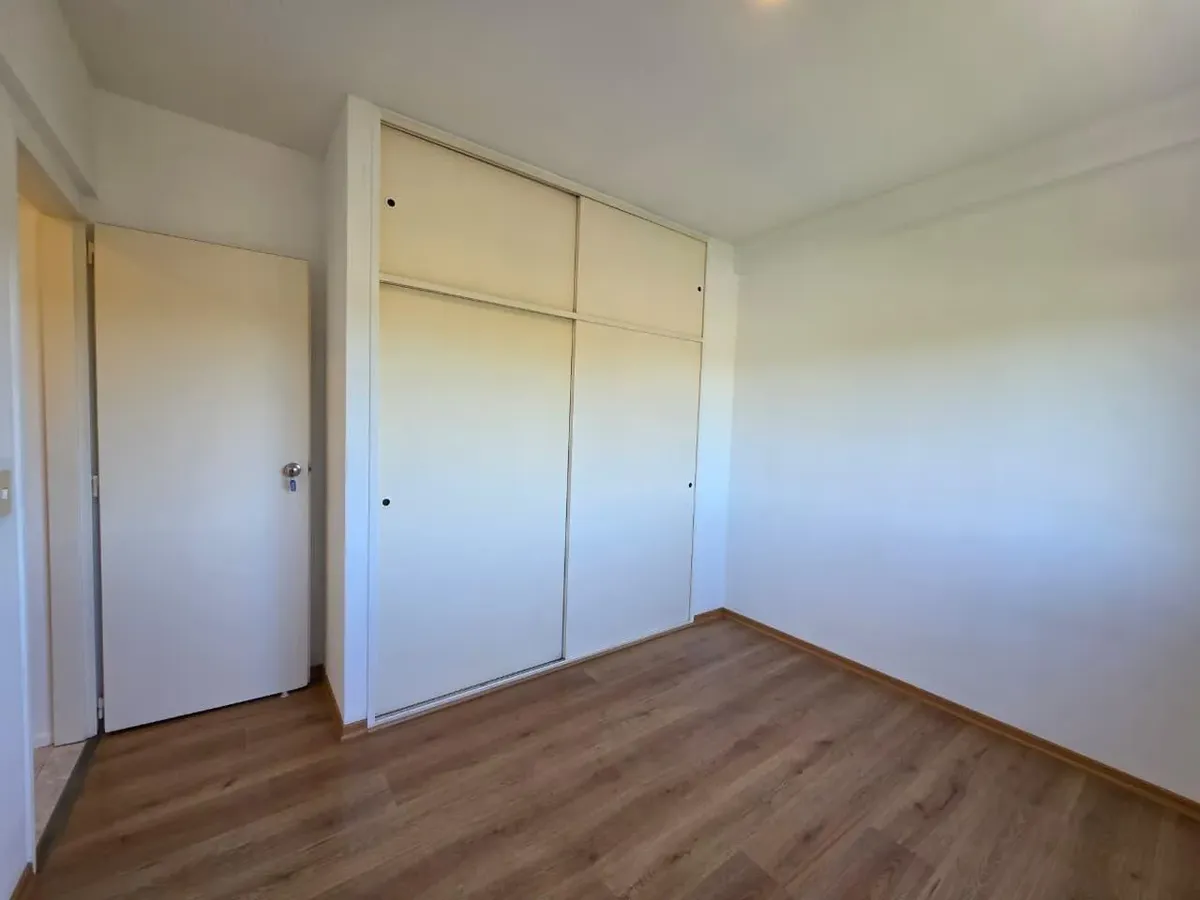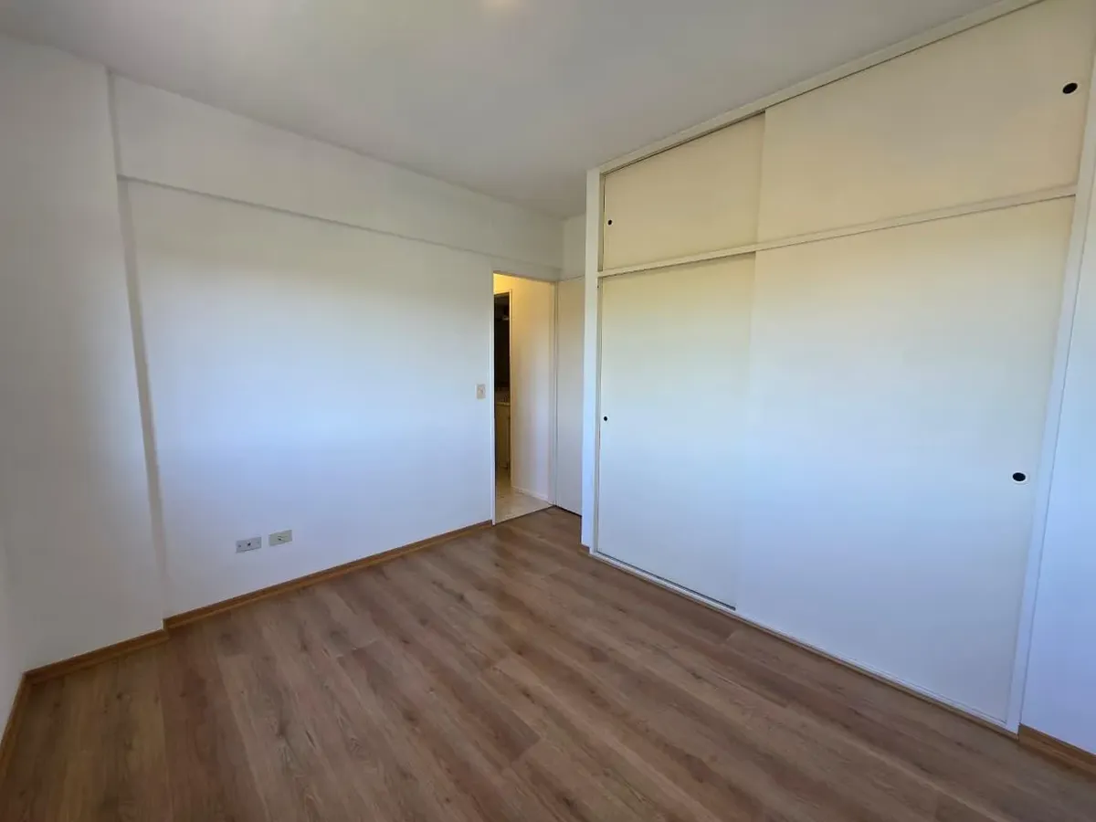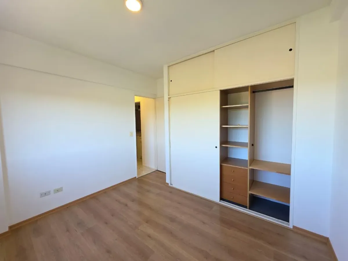 Apartamento de 3 ambientes com 2 dormitórios, varanda corrida e vista aberta, em San Isidro. O living-comedor tem saída para a varanda. Há dois banheiros? Não: o imóvel tem 1 banheiro completo com banheira. Os dormitórios têm armários embutidos, com o principal medindo 3,20 x 3,20 m e o segundo 2,31 x 2,32 m, também com saída para a varanda. O piso é tipo flutuante (simil madeira) e há persianas; a cozinha é independente e tem ventilação natural. A vaga de garagem é fixa e descoberta. O contrato