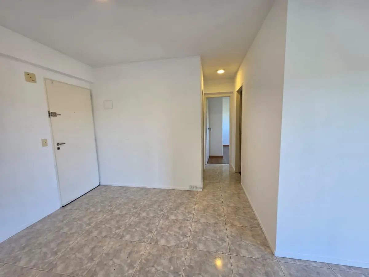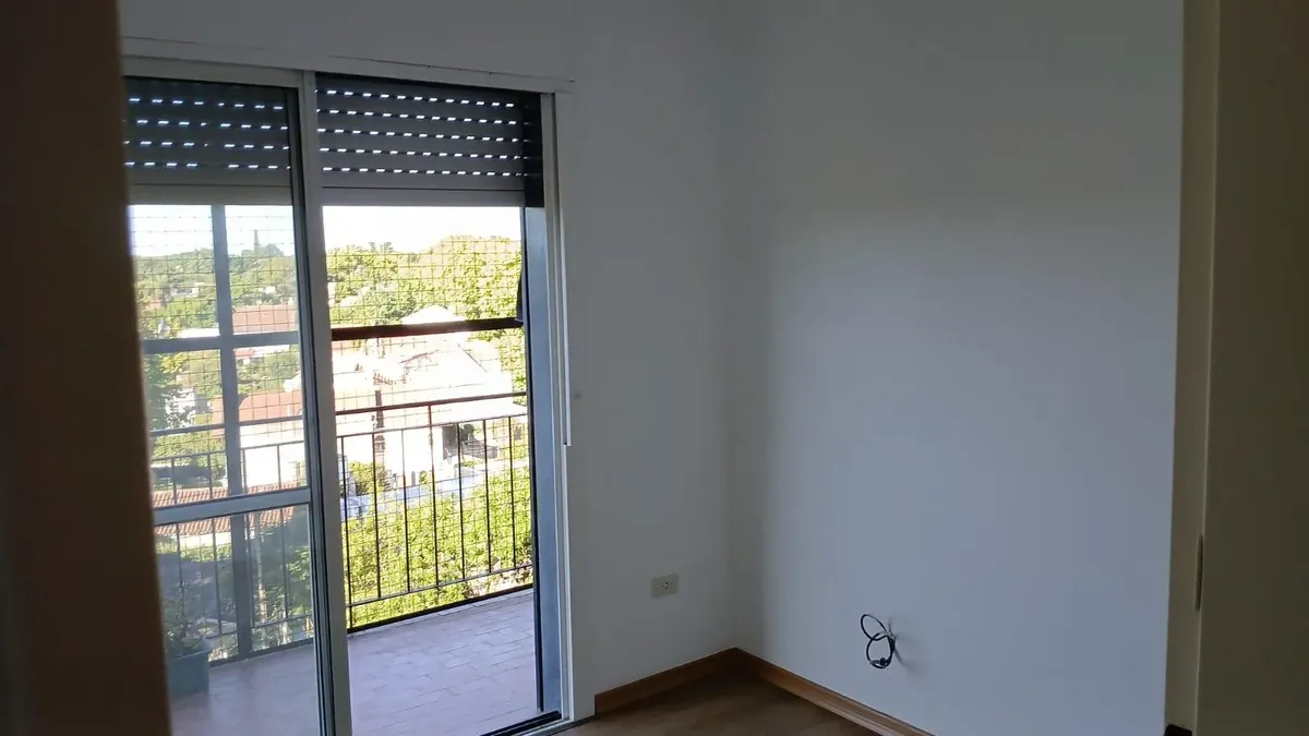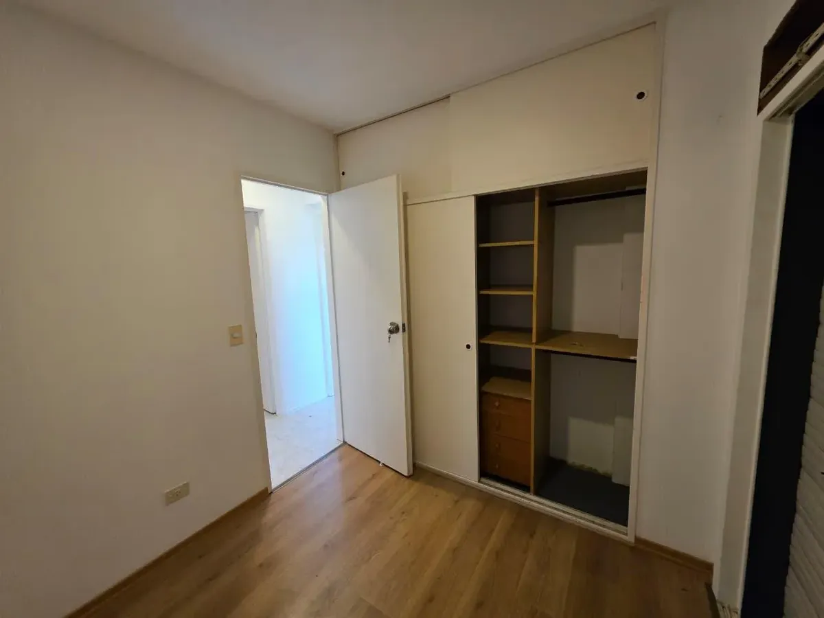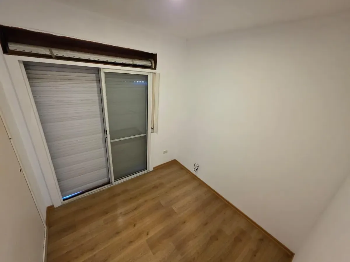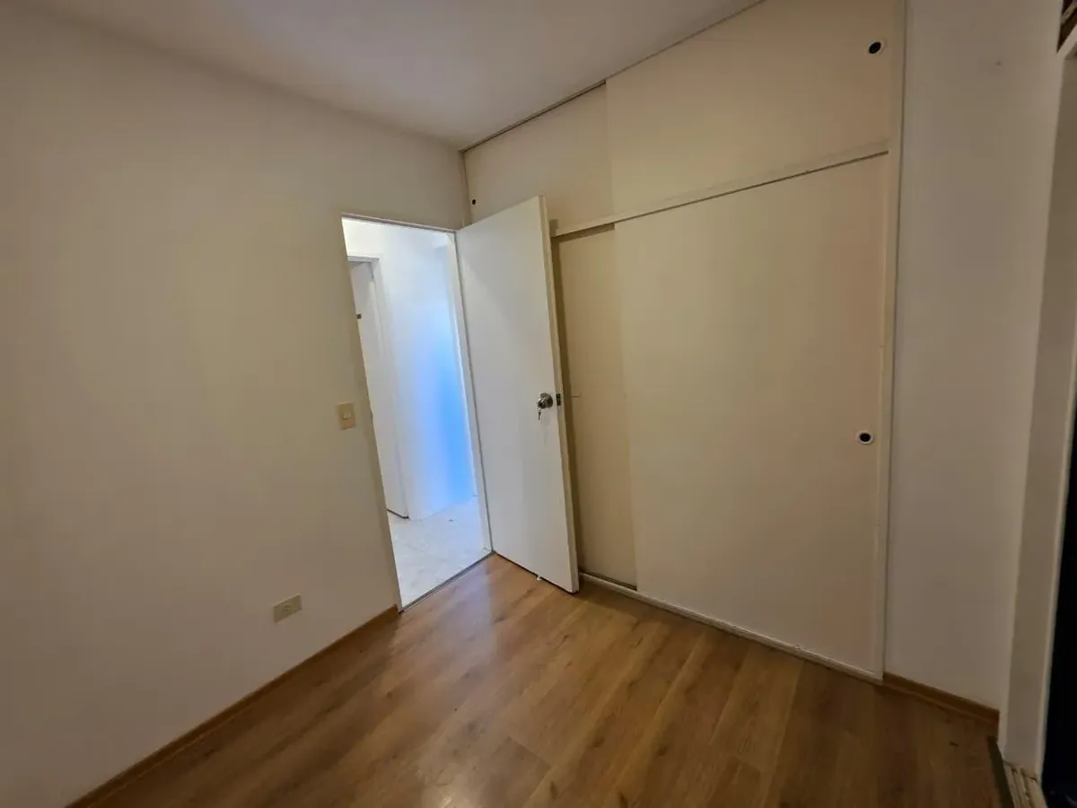 Apartamento de 3 ambientes com 2 dormitórios, varanda corrida e vista aberta, em San Isidro. O living-comedor tem saída para a varanda. Há dois banheiros? Não: o imóvel tem 1 banheiro completo com banheira. Os dormitórios têm armários embutidos, com o principal medindo 3,20 x 3,20 m e o segundo 2,31 x 2,32 m, também com saída para a varanda. O piso é tipo flutuante (simil madeira) e há persianas; a cozinha é independente e tem ventilação natural. A vaga de garagem é fixa e descoberta. O contrato