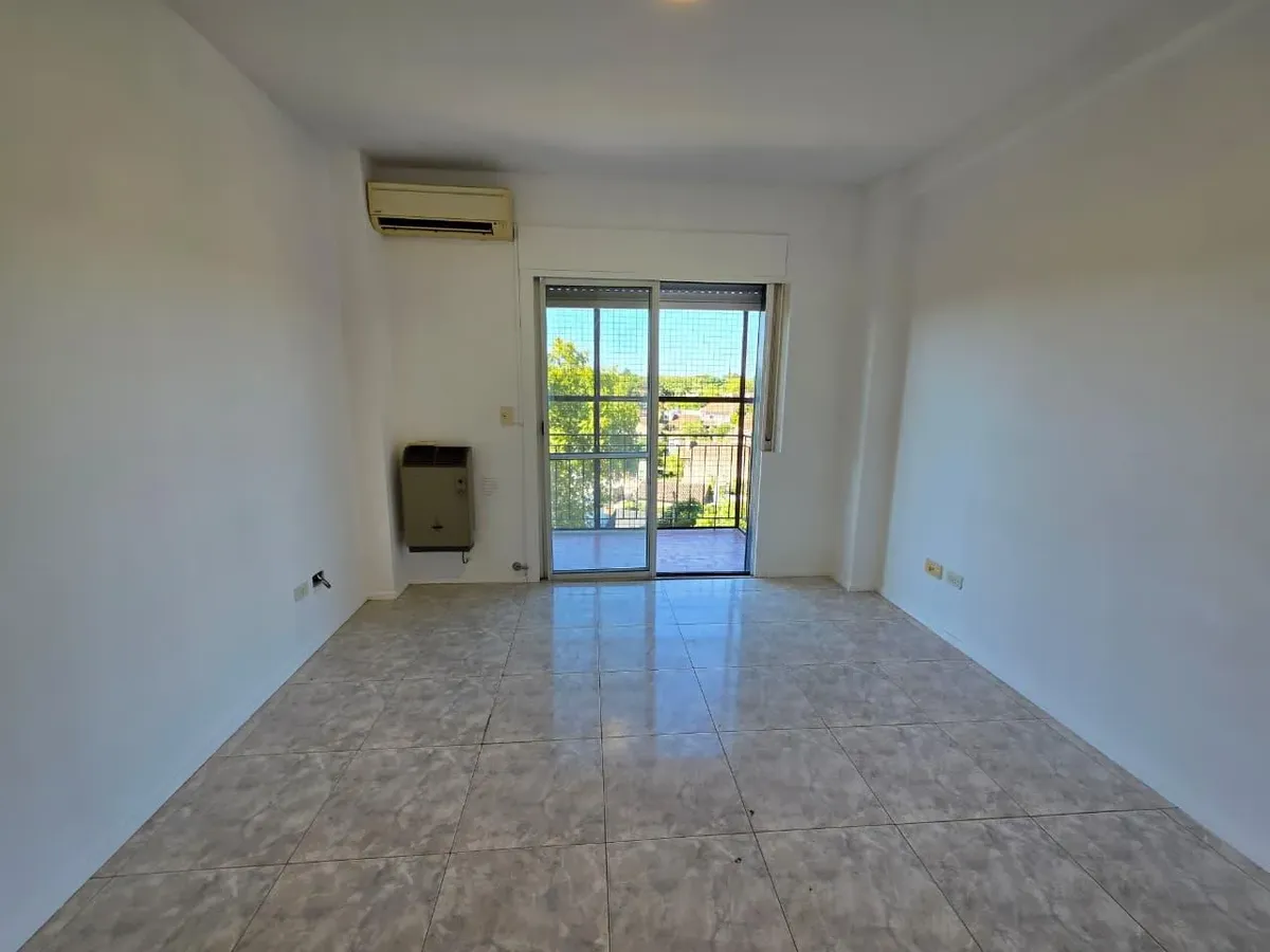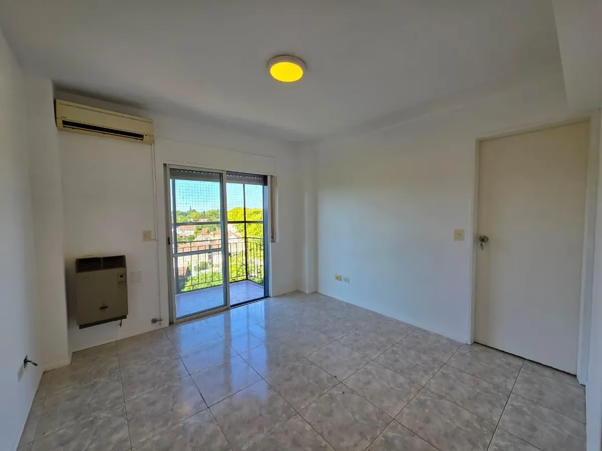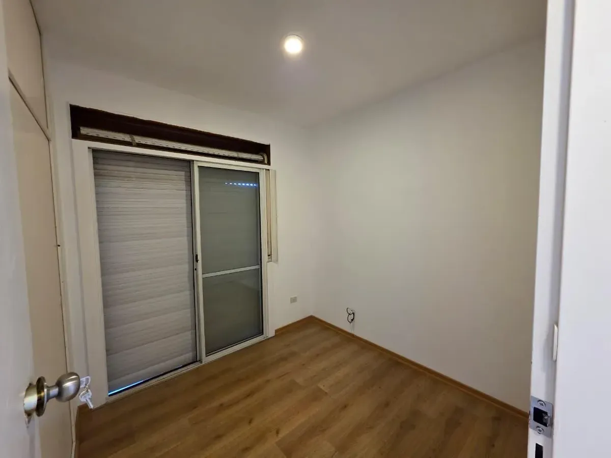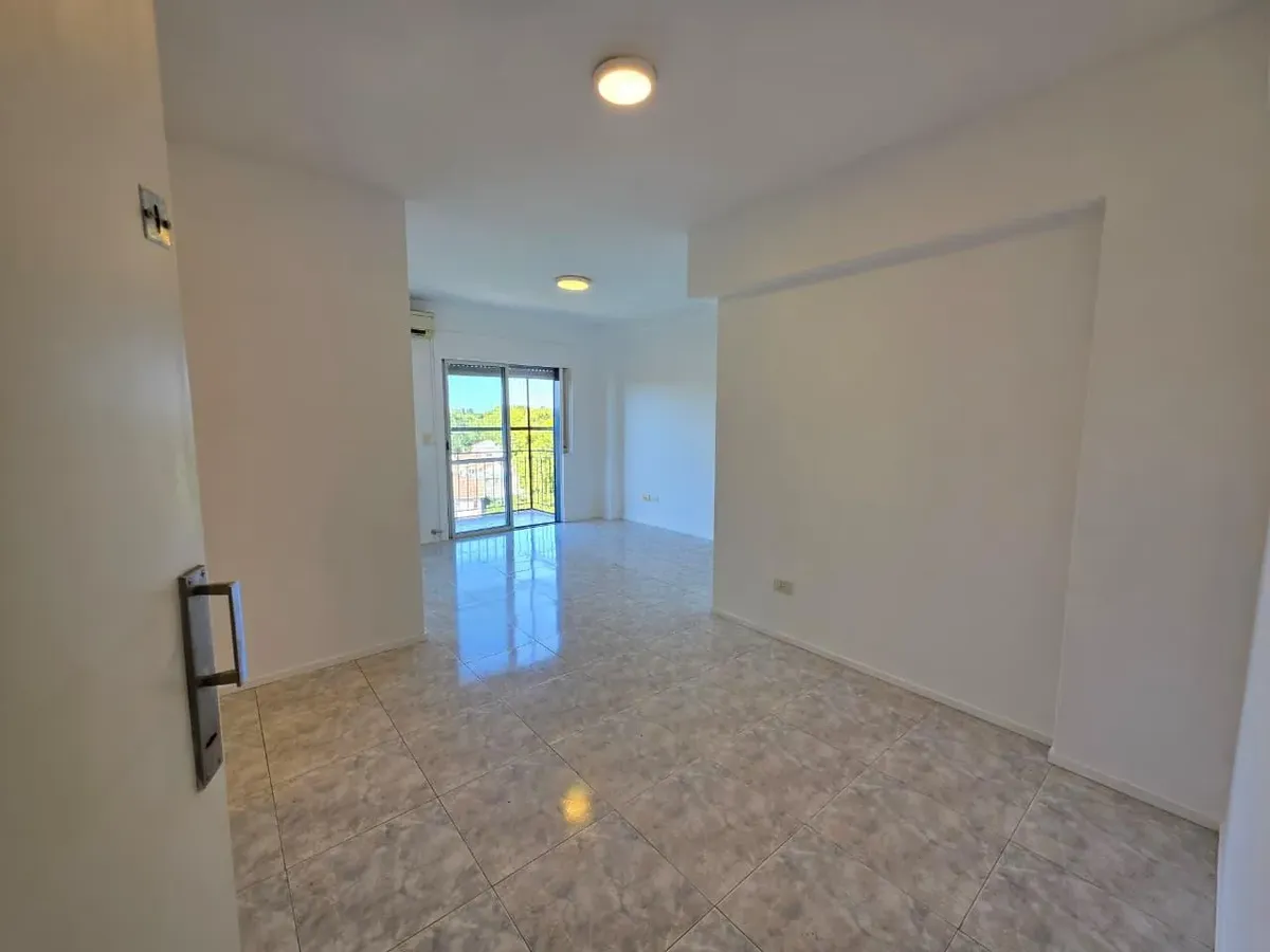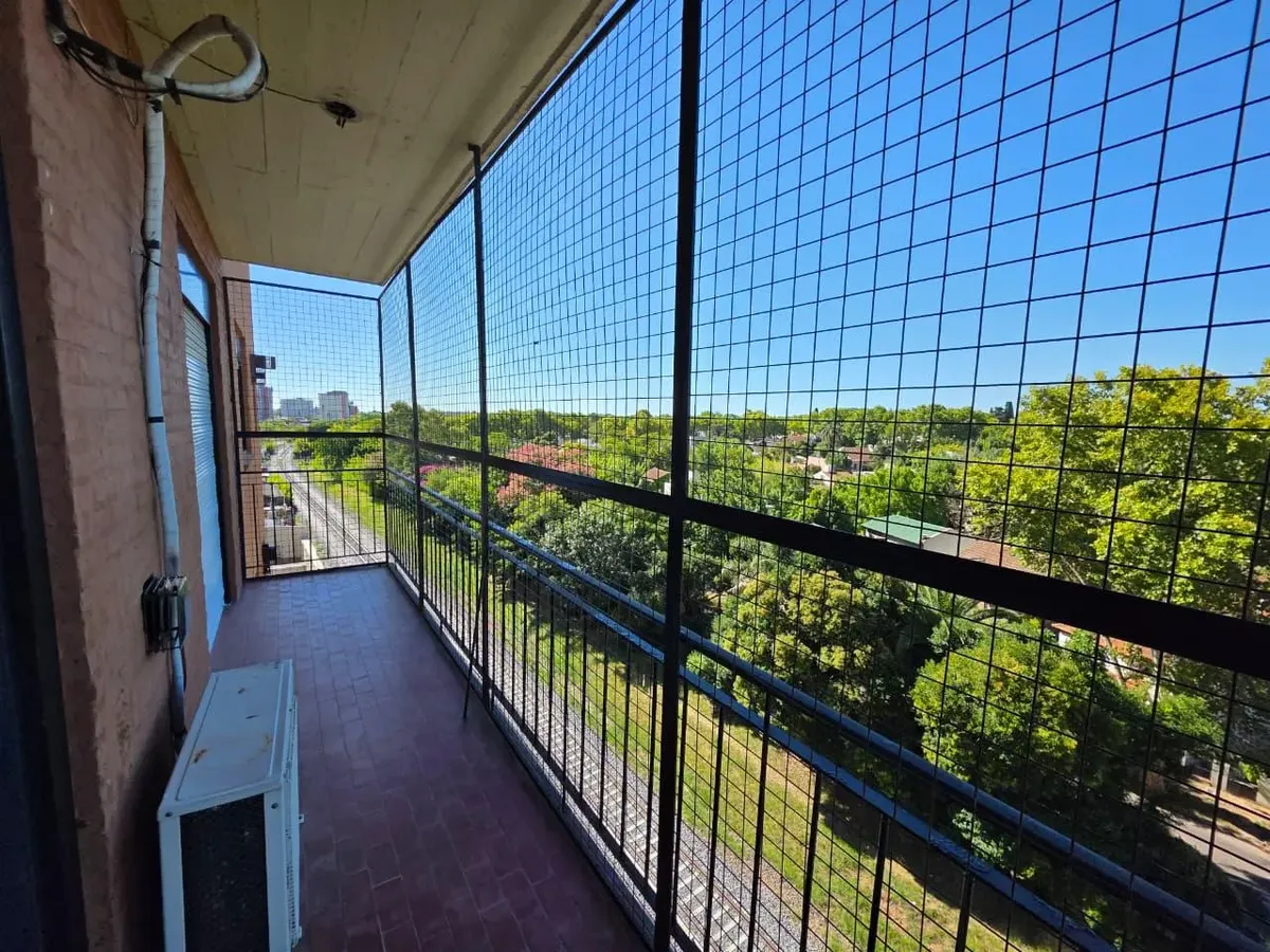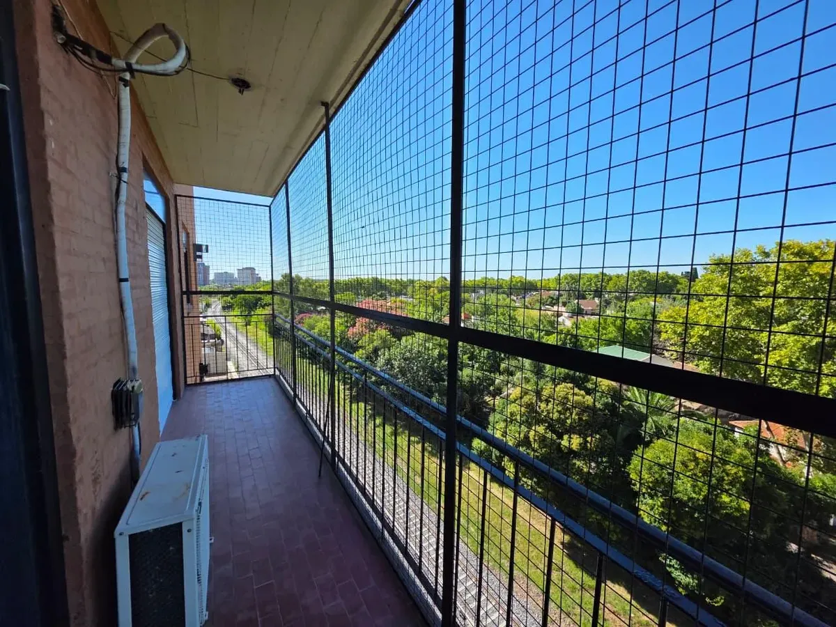 Apartamento de 3 ambientes com 2 dormitórios, varanda corrida e vista aberta, em San Isidro. O living-comedor tem saída para a varanda. Há dois banheiros? Não: o imóvel tem 1 banheiro completo com banheira. Os dormitórios têm armários embutidos, com o principal medindo 3,20 x 3,20 m e o segundo 2,31 x 2,32 m, também com saída para a varanda. O piso é tipo flutuante (simil madeira) e há persianas; a cozinha é independente e tem ventilação natural. A vaga de garagem é fixa e descoberta. O contrato