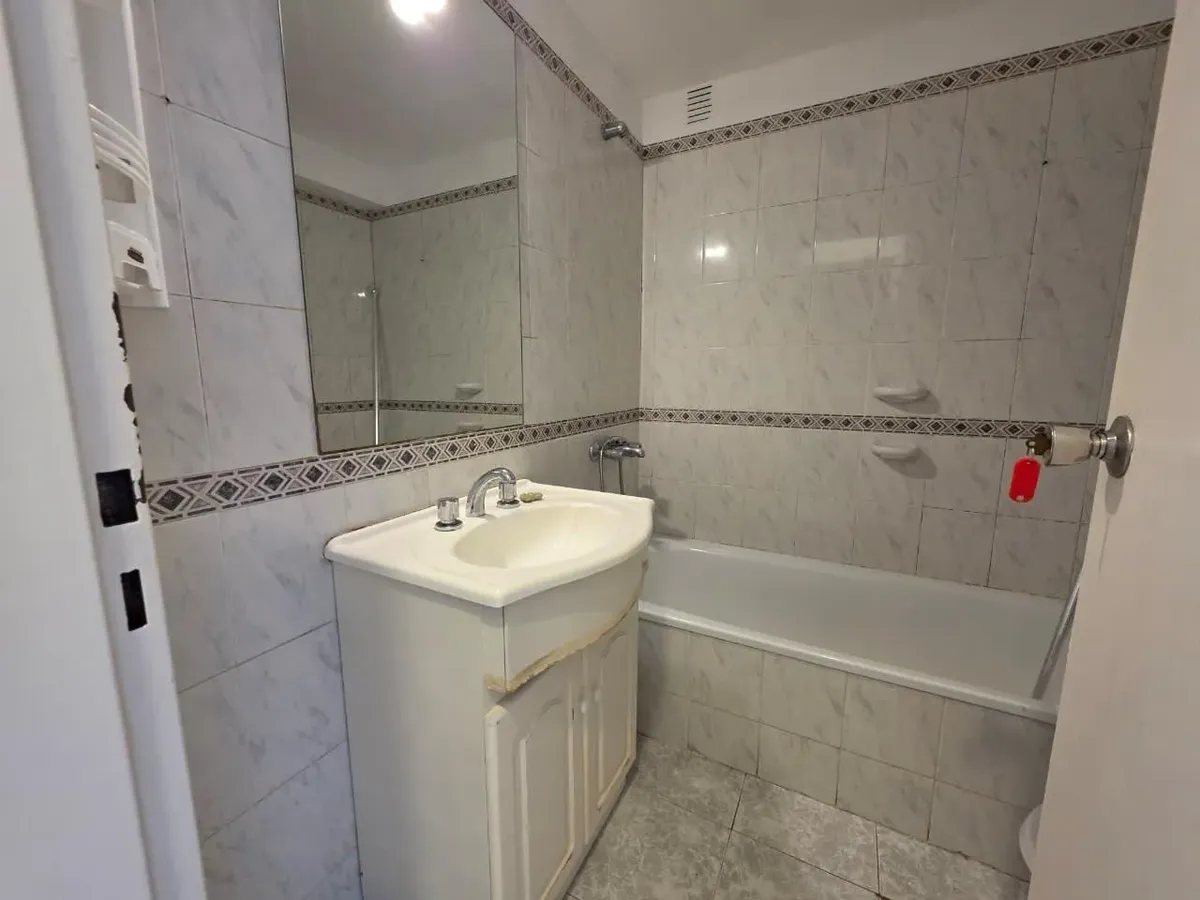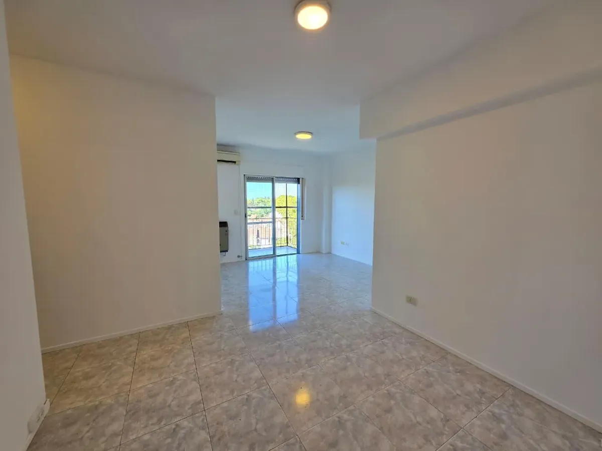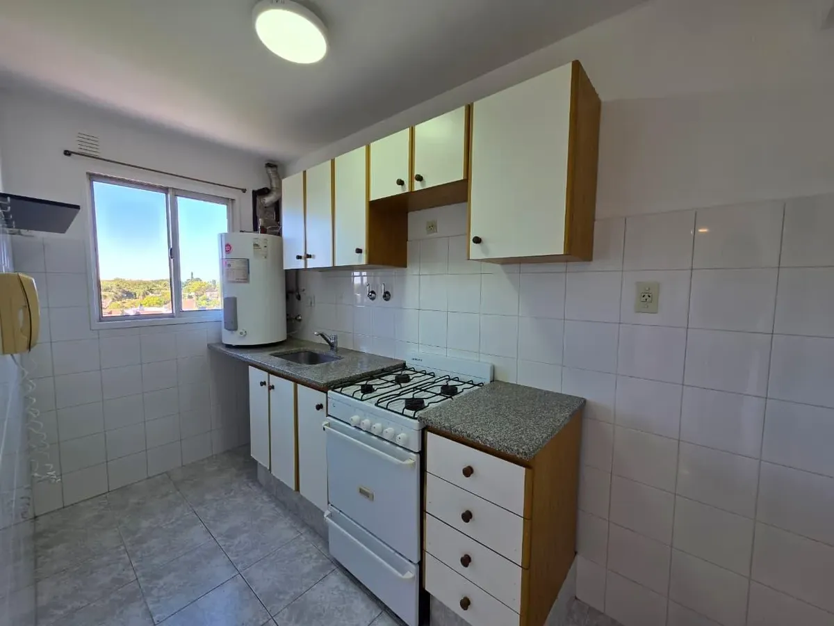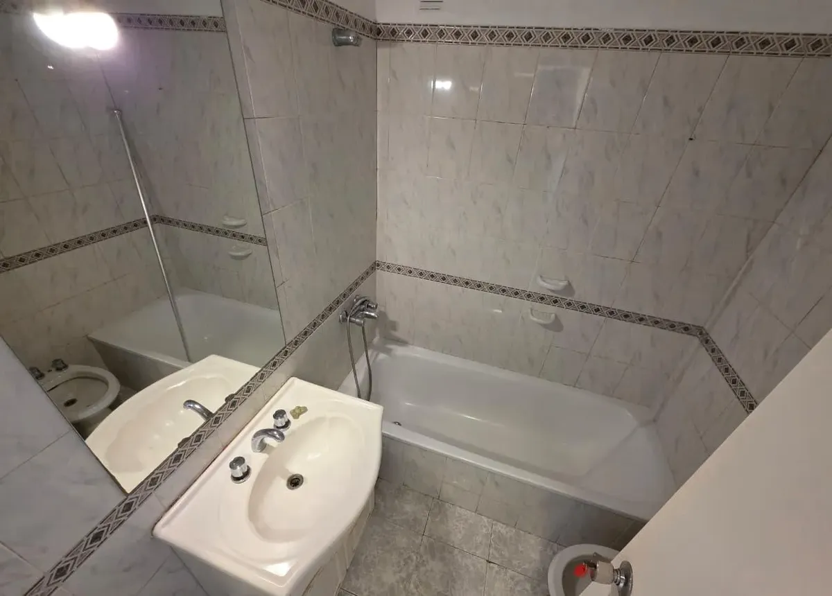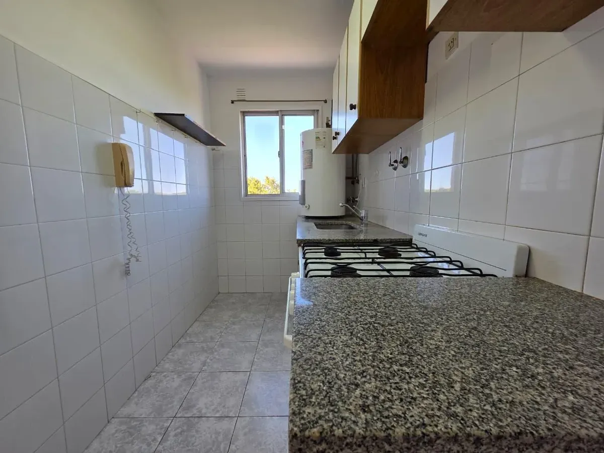 Apartamento de 3 ambientes com 2 dormitórios, varanda corrida e vista aberta, em San Isidro. O living-comedor tem saída para a varanda. Há dois banheiros? Não: o imóvel tem 1 banheiro completo com banheira. Os dormitórios têm armários embutidos, com o principal medindo 3,20 x 3,20 m e o segundo 2,31 x 2,32 m, também com saída para a varanda. O piso é tipo flutuante (simil madeira) e há persianas; a cozinha é independente e tem ventilação natural. A vaga de garagem é fixa e descoberta. O contrato