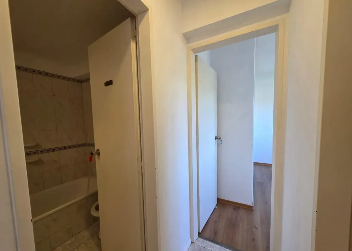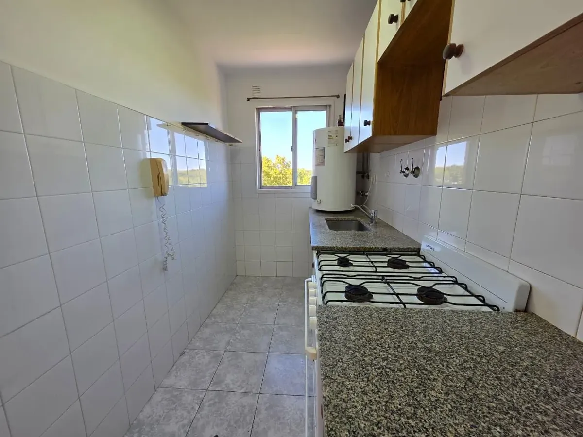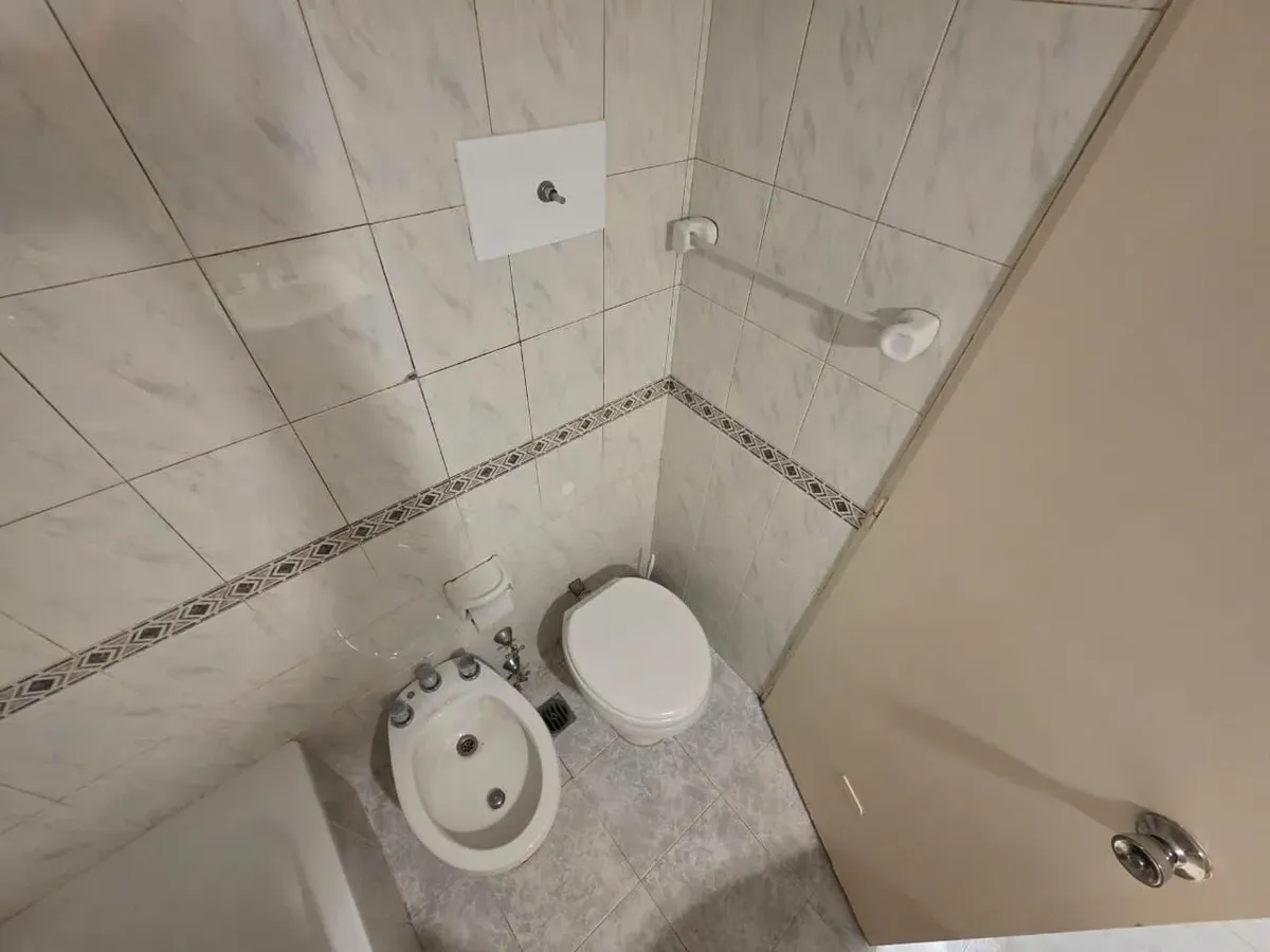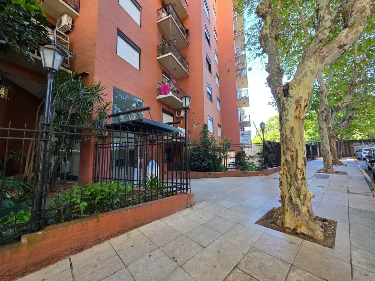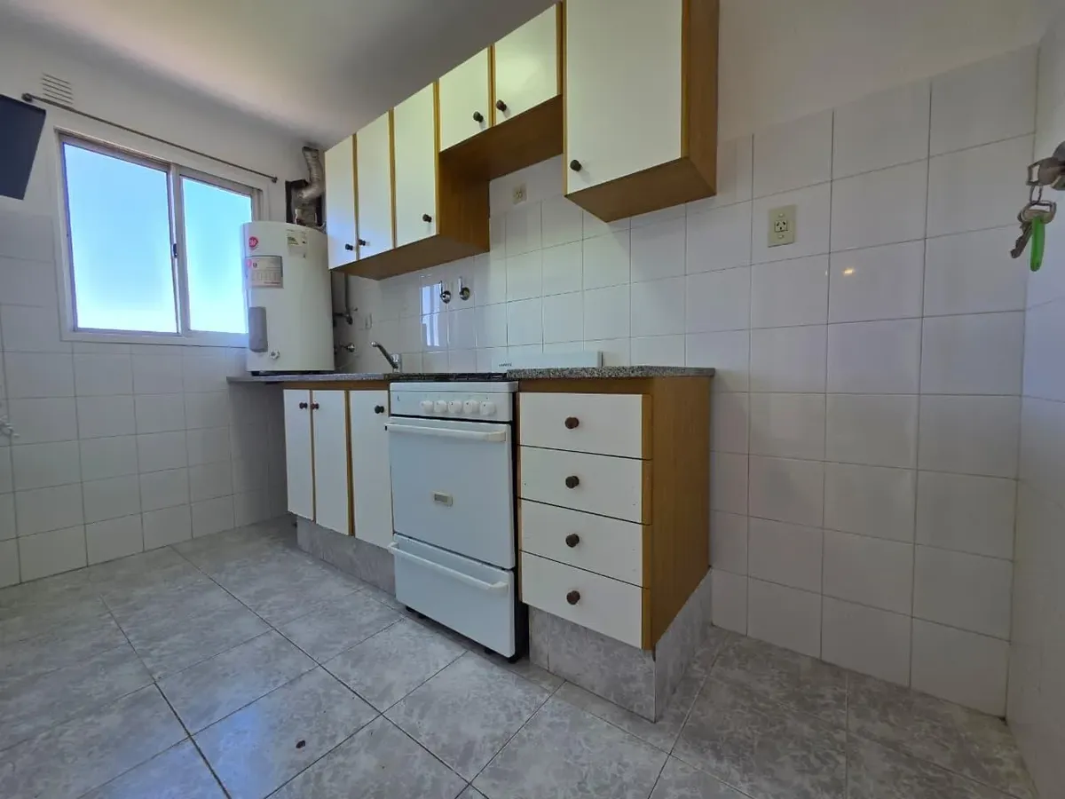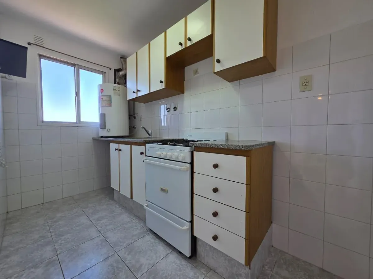 Apartamento de 3 ambientes com 2 dormitórios, varanda corrida e vista aberta, em San Isidro. O living-comedor tem saída para a varanda. Há dois banheiros? Não: o imóvel tem 1 banheiro completo com banheira. Os dormitórios têm armários embutidos, com o principal medindo 3,20 x 3,20 m e o segundo 2,31 x 2,32 m, também com saída para a varanda. O piso é tipo flutuante (simil madeira) e há persianas; a cozinha é independente e tem ventilação natural. A vaga de garagem é fixa e descoberta. O contrato