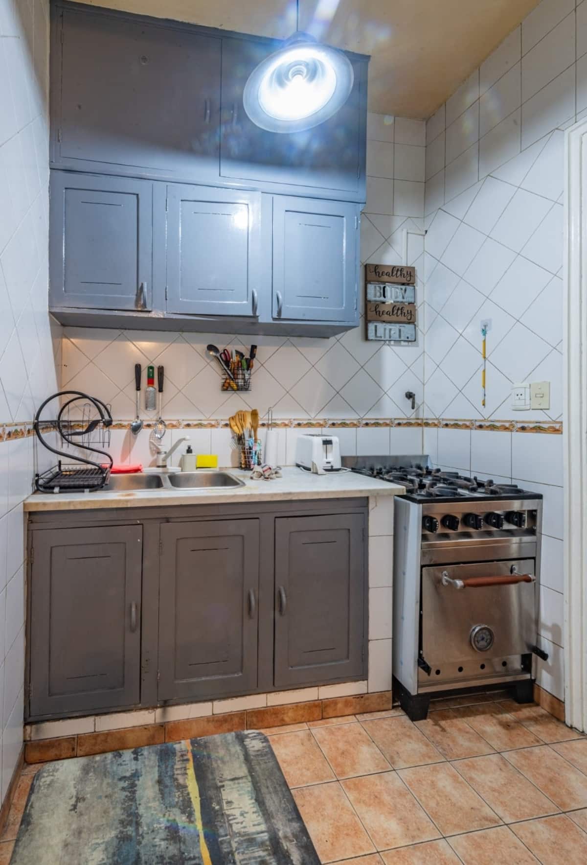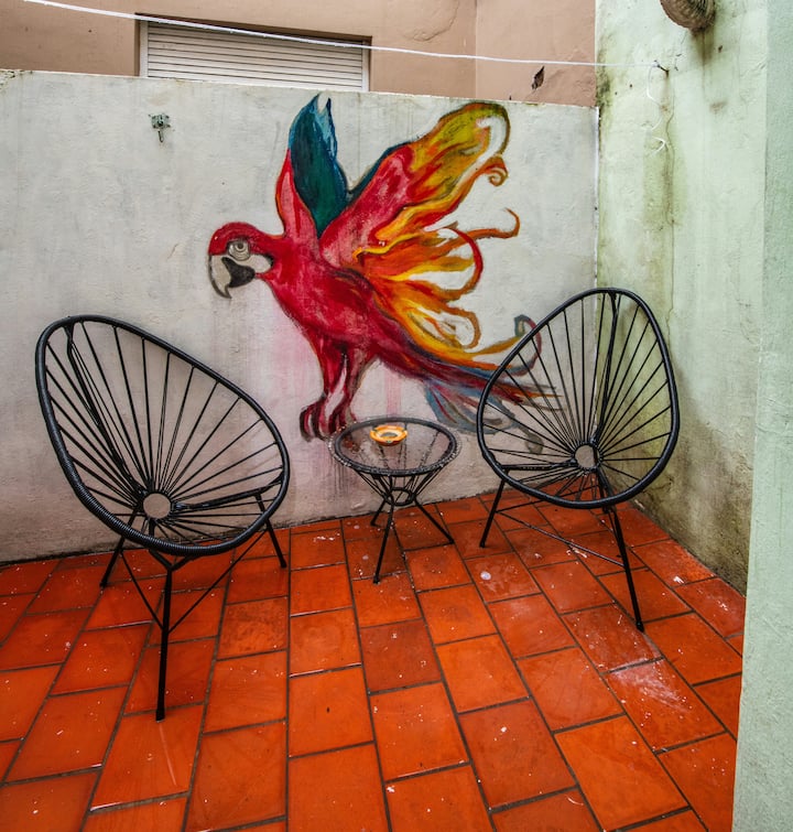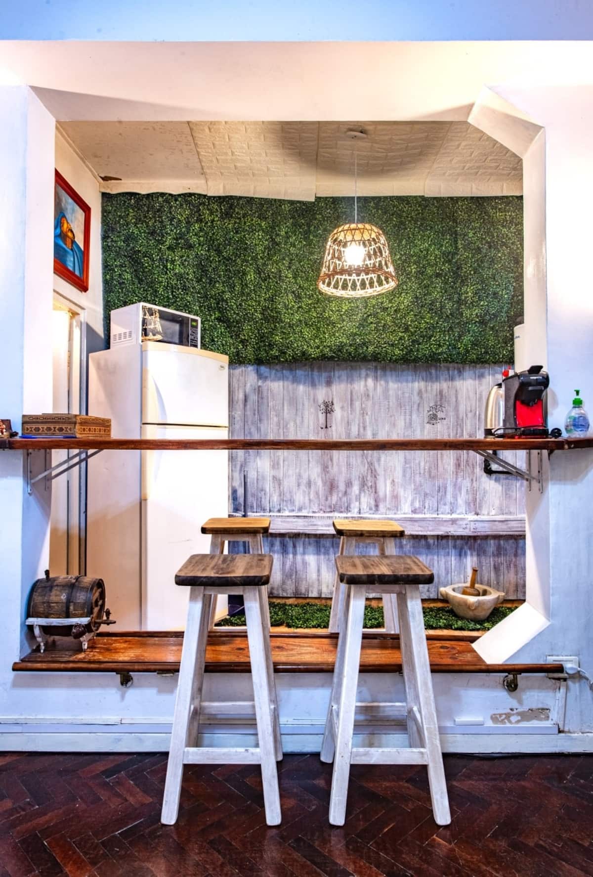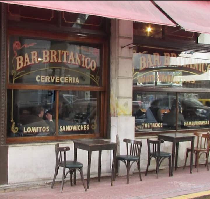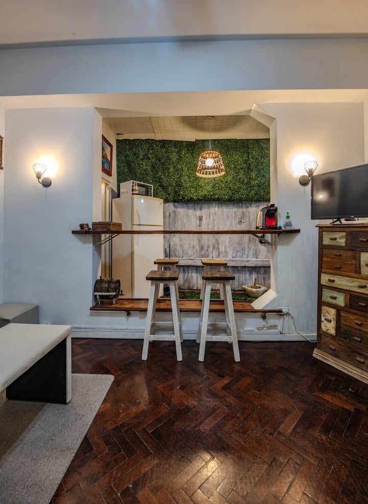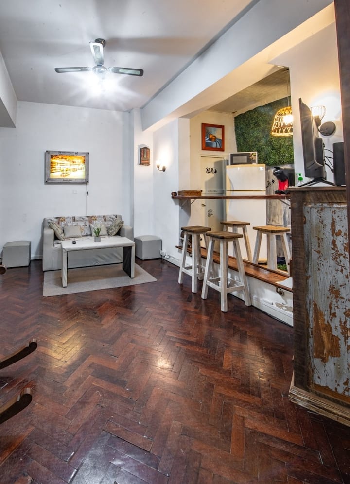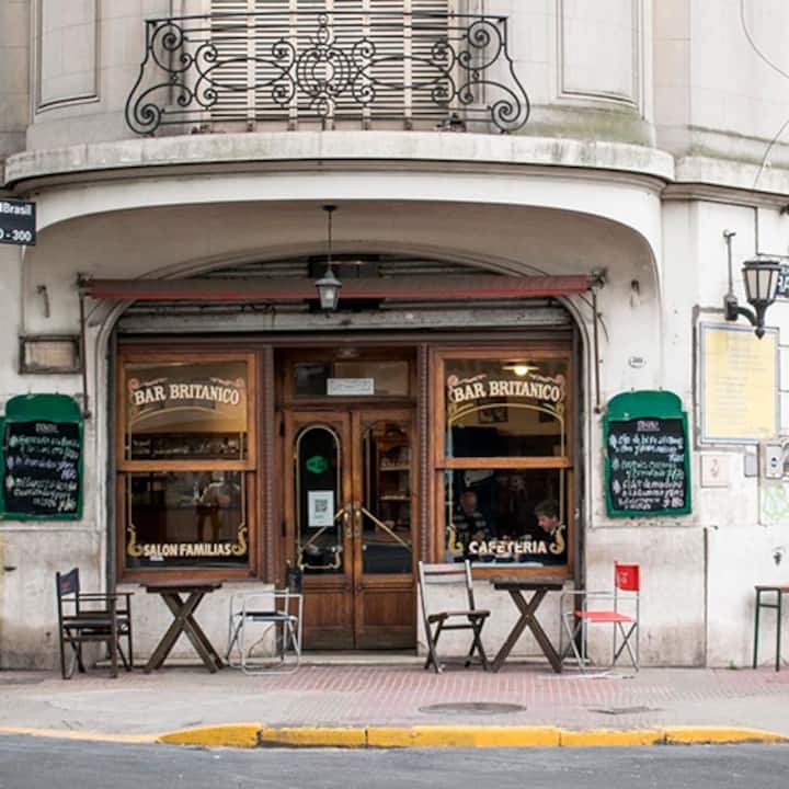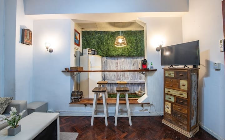 Apartamento em San Telmo com 2 quartos separados, sala com TV e cozinha, reformado mantendo estilo vintage. Há uma área externa privativa (pátio) com permissão para fumar. A cozinha inclui máquina de café de cápsulas. A acomodação fica a cerca de 20 m do Parque Lezama e próxima ao Mercado de San Telmo.