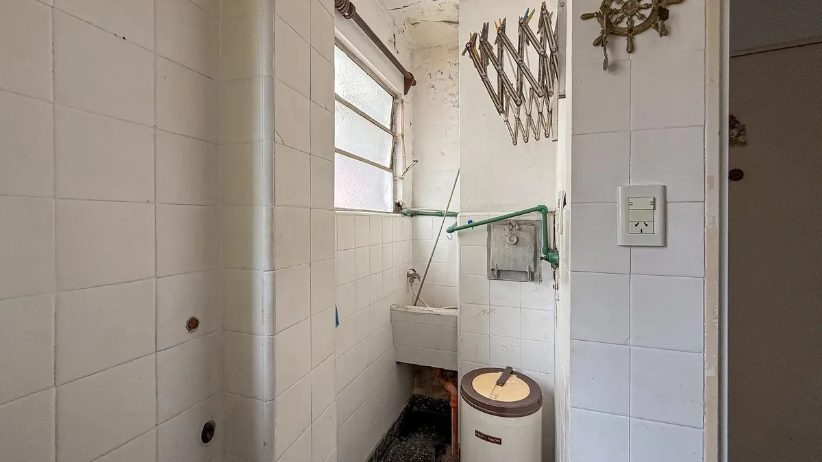 Apartamento de 2 dormitórios com mobília parcial, recémpintado e hall de entrada. Há sala de jantar com mesa, cadeiras e módulo, ventilador de teto e cozinha elétrica nova com aquecedor de água (termotanque), móveis sob bancada e armários superiores. O dormitório principal tem cama de casal, cômoda e mesas de luz, e o segundo dormitório tem cama de solteiro; ambos possuem guarda-roupa. O imóvel tem área de serviço independente e banheiro completo com armário/espelho, gabinete (vanitory) e banhei