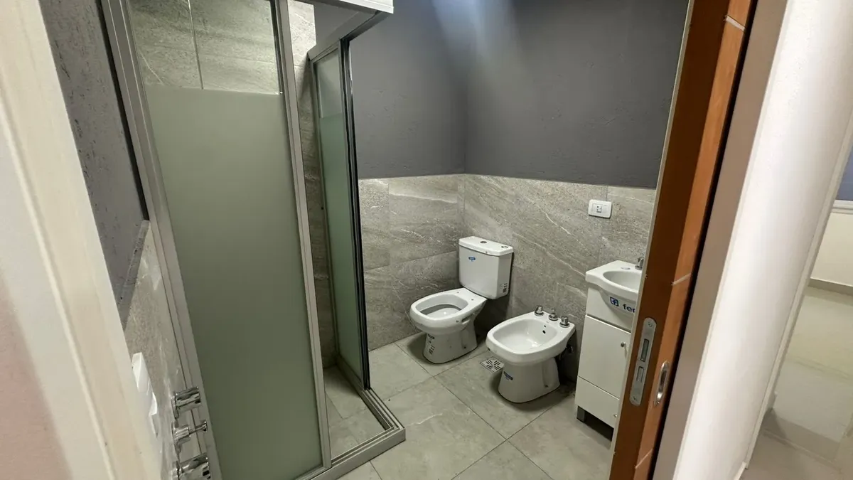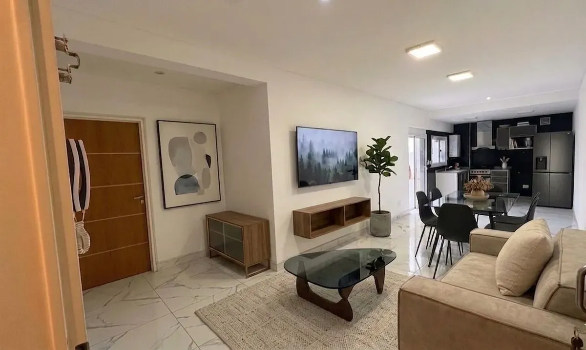 Apartamento de 3 ambientes com 95 m² cobertos e 10 m² de varanda própria, com conceito open space integrando cozinha, sala de jantar e living com saída direta para a varanda. Tem 2 dormitórios independentes e 1 banheiro completo. O edifício tem terraço compartilhado e área de churrasco. O aluguel menciona contratos com renovação a cada 6 meses, sem garantia de caução imobiliária, e expensas a cargo do inquilino, além de serviços individuais; para entrada, são solicitados 2 meses de depósito em d