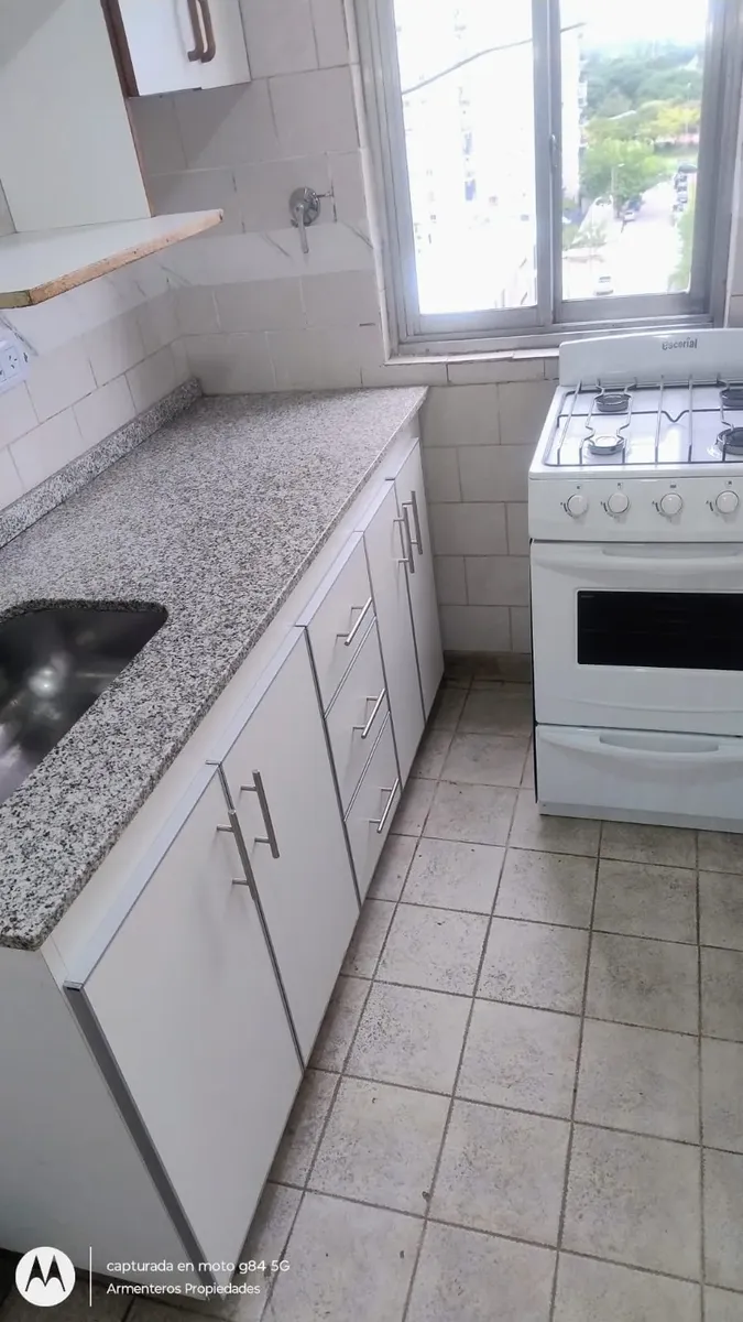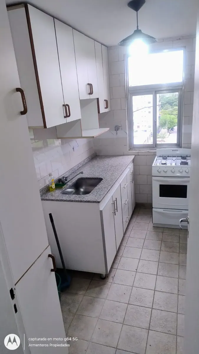 Apartamento de 55 m² de área total e coberta, com 2 dormitórios e 1 banheiro completo. A cozinha tem móveis planejados na parte inferior e alacena, além de fogão instalado. Os dormitórios contam com armários embutidos e piso de cerâmica, assim como o comedor diário. O prédio permite animais de estimação.
