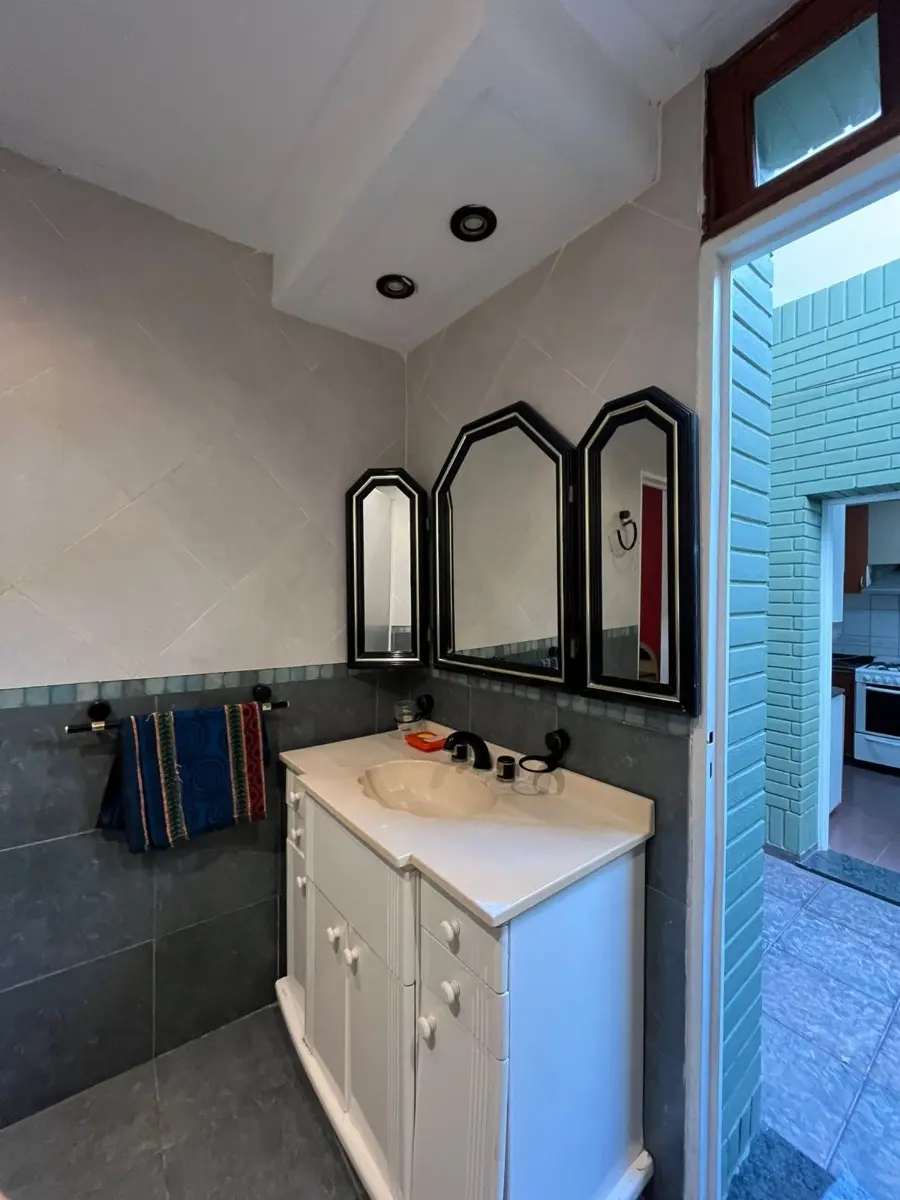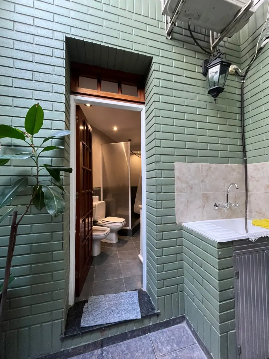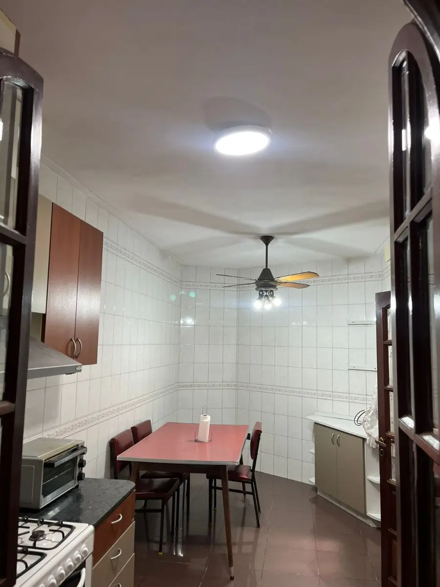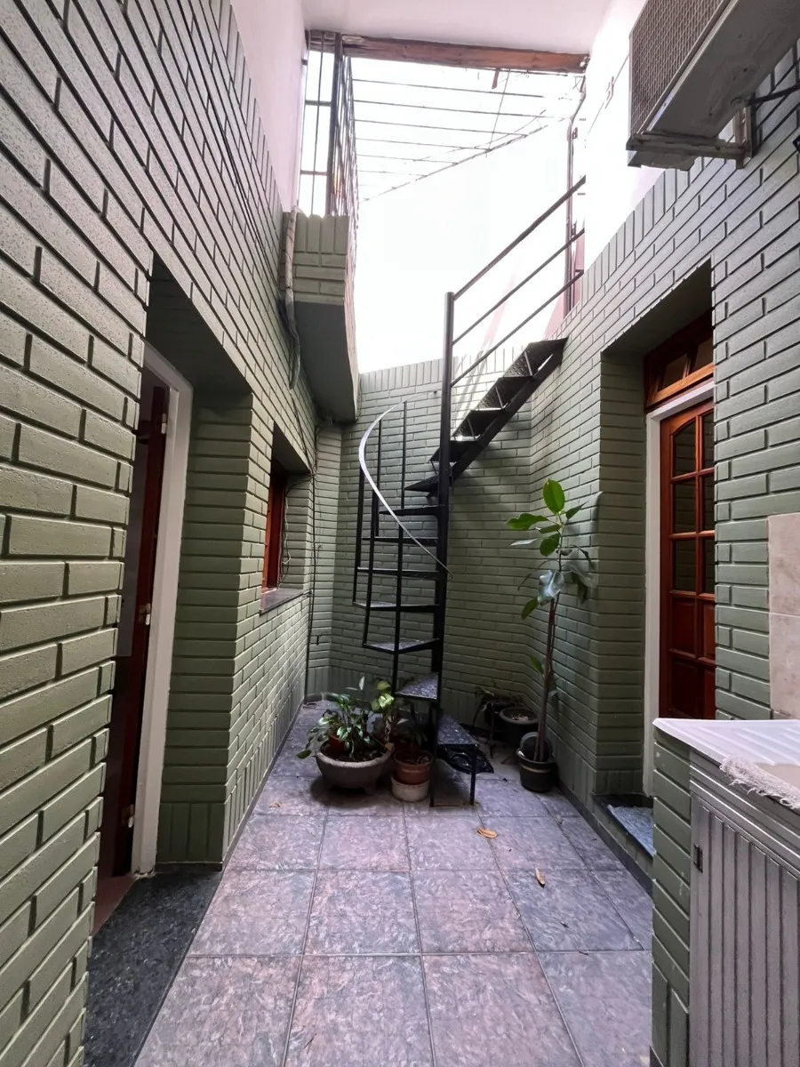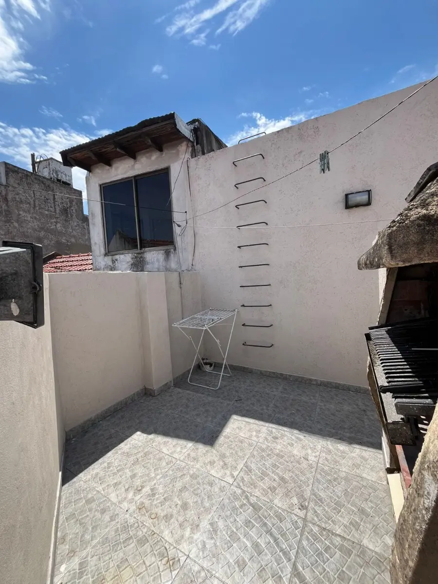 Apartamento tipo casa de 3 ambientes com pátio, terraço e área de churrasco, com entrada independente a partir da rua. No térreo: hall de entrada (4x1,10), living grande (8x4), cozinha com área para refeições (5,5x2,5) e banheiro com dupla circulação, reformado (3,5x2,1). Há 2 dormitórios (cada um 4x4), ambos com ventilador de teto. O pátio no térreo mede 3x2 e dá acesso a um espaço comum com a unidade do andar superior, com depósito (3x3), lavandaria (3x2) e terraço com área de churrasco, acess