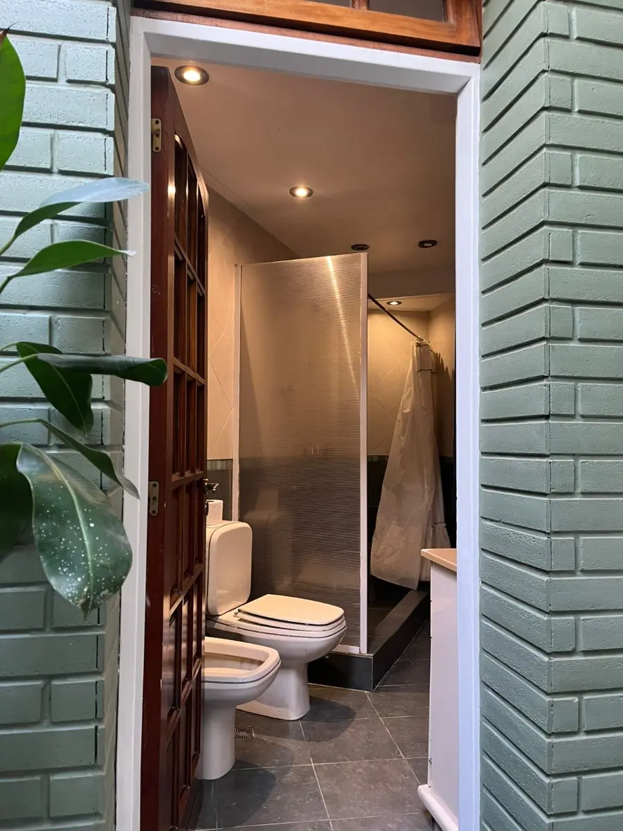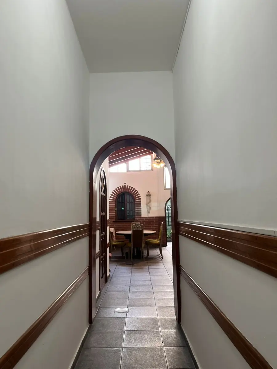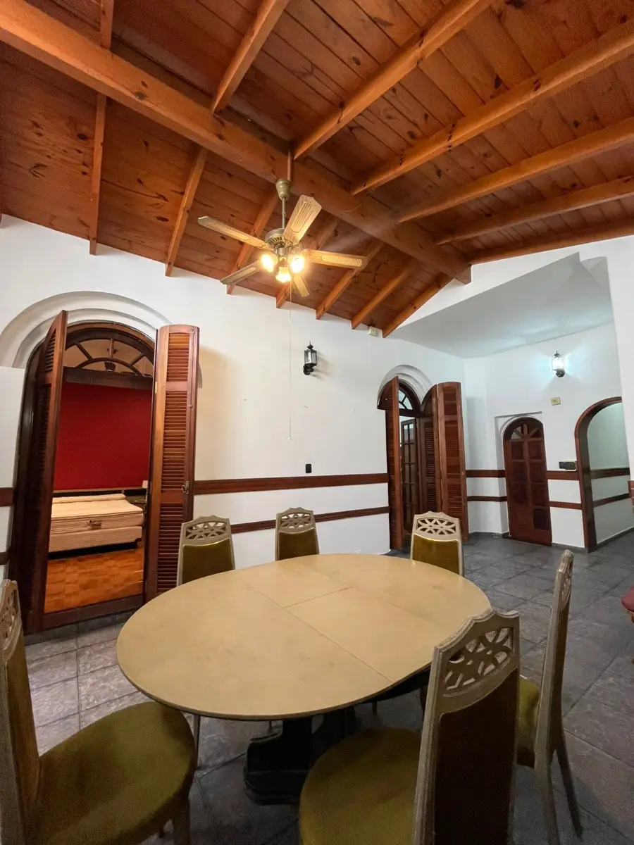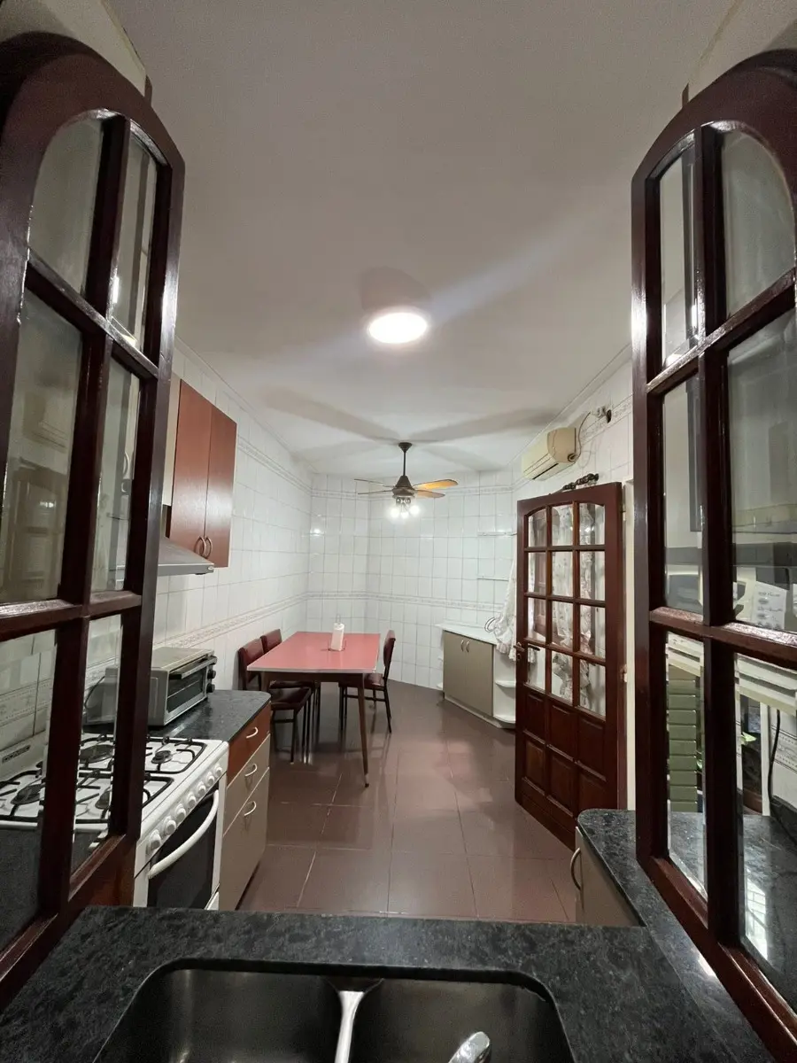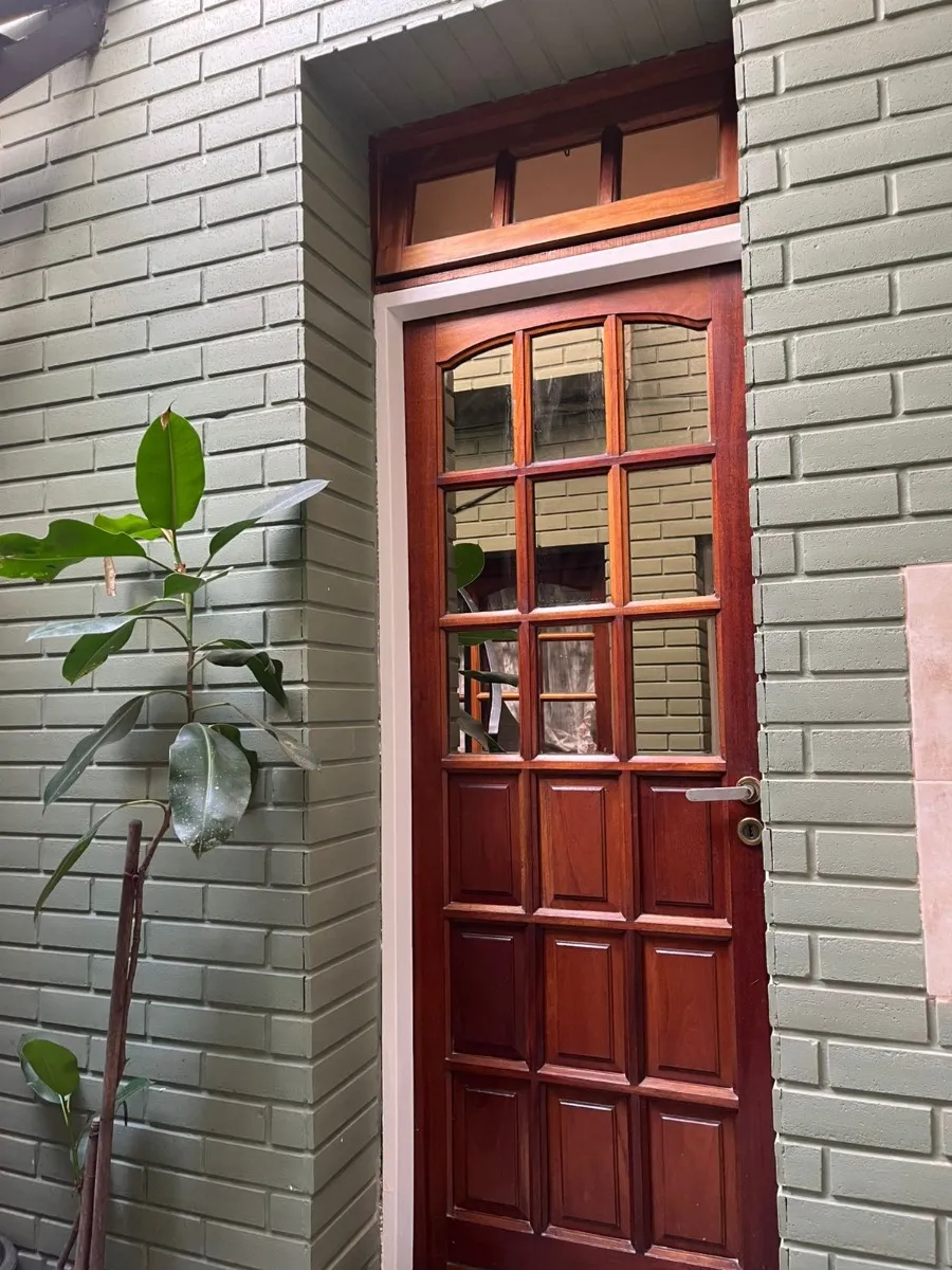 Apartamento tipo casa de 3 ambientes com pátio, terraço e área de churrasco, com entrada independente a partir da rua. No térreo: hall de entrada (4x1,10), living grande (8x4), cozinha com área para refeições (5,5x2,5) e banheiro com dupla circulação, reformado (3,5x2,1). Há 2 dormitórios (cada um 4x4), ambos com ventilador de teto. O pátio no térreo mede 3x2 e dá acesso a um espaço comum com a unidade do andar superior, com depósito (3x3), lavandaria (3x2) e terraço com área de churrasco, acess