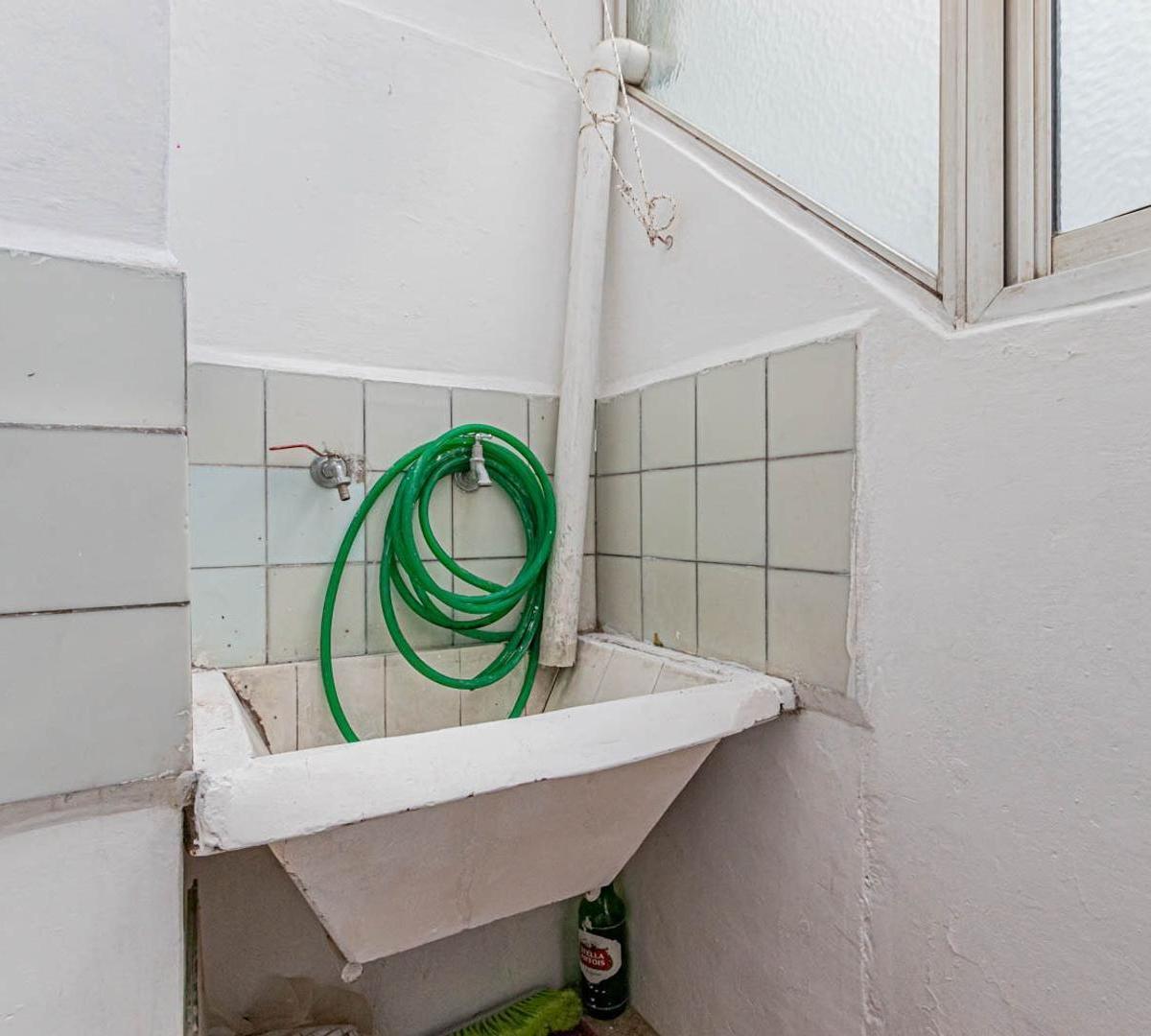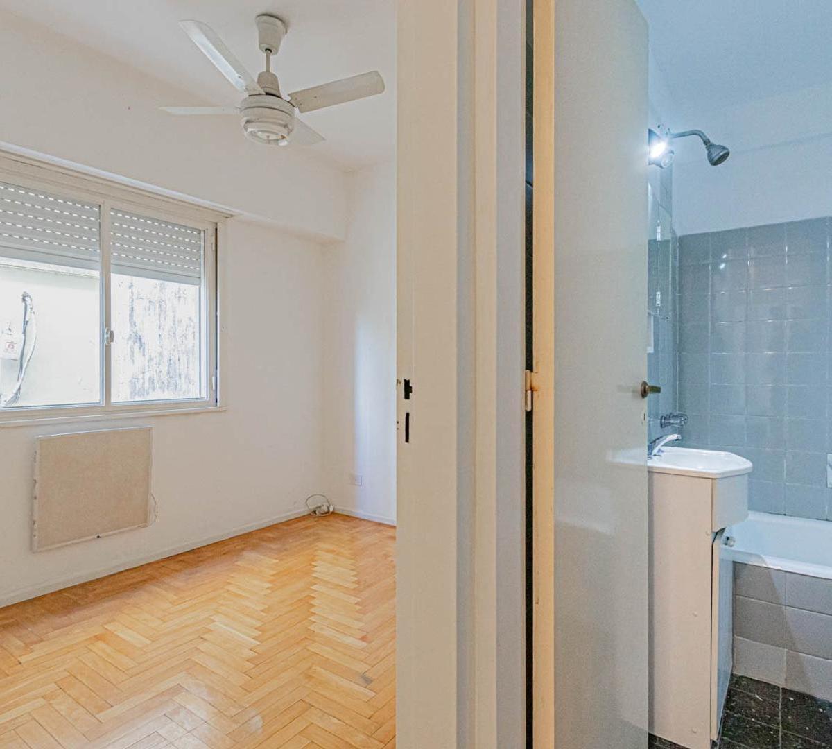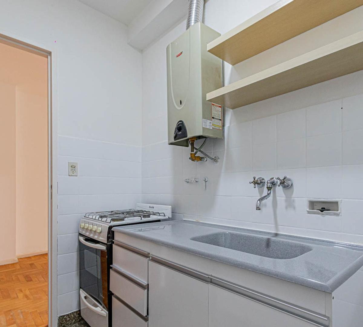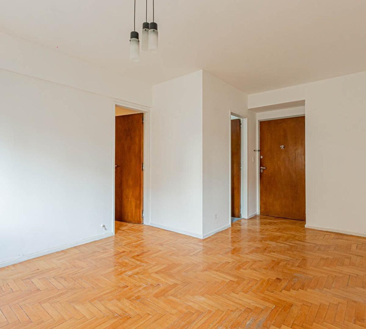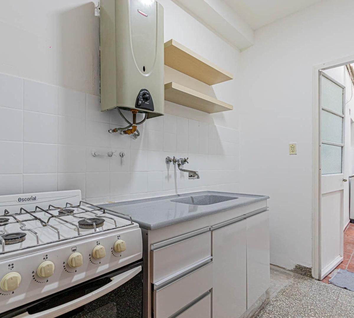 Apartamento de 3 ambientes em Villa Urquiza. Conta com 2 dormitórios, banheiro completo e cozinha independente. O imóvel tem área de serviço integrada e armários nos corredores dos dormitórios.