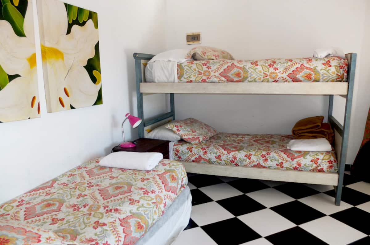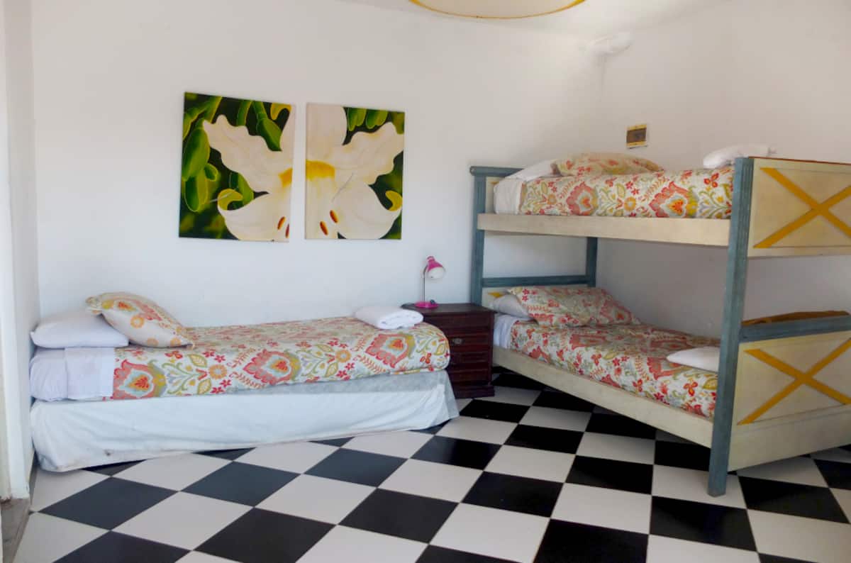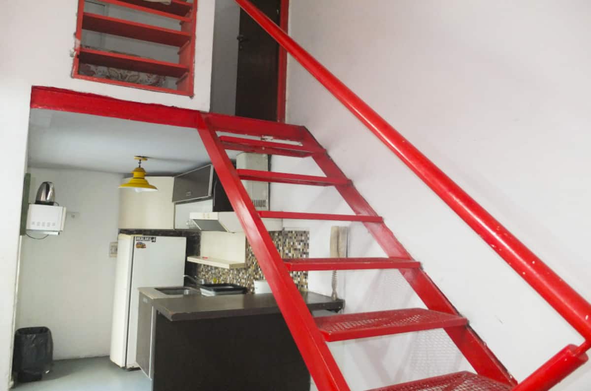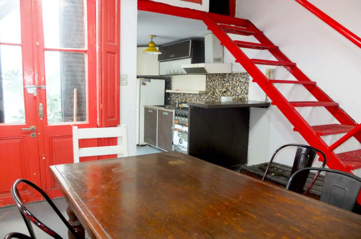 Apartamento de 3 dormitórios com reforma, entrando por um pátio com mesa e cadeiras de ferro. Sala de estar e jantar, com pé-direito alto, sofá e ar-condicionado. A cozinha é totalmente equipada. Há banheiro da suíte com banheira. O segundo dormitório fica acima da cozinha e tem 1 cama de solteiro. O terraço dá acesso ao terceiro dormitório, com 3 camas de solteiro, além de banheiro completo com box.