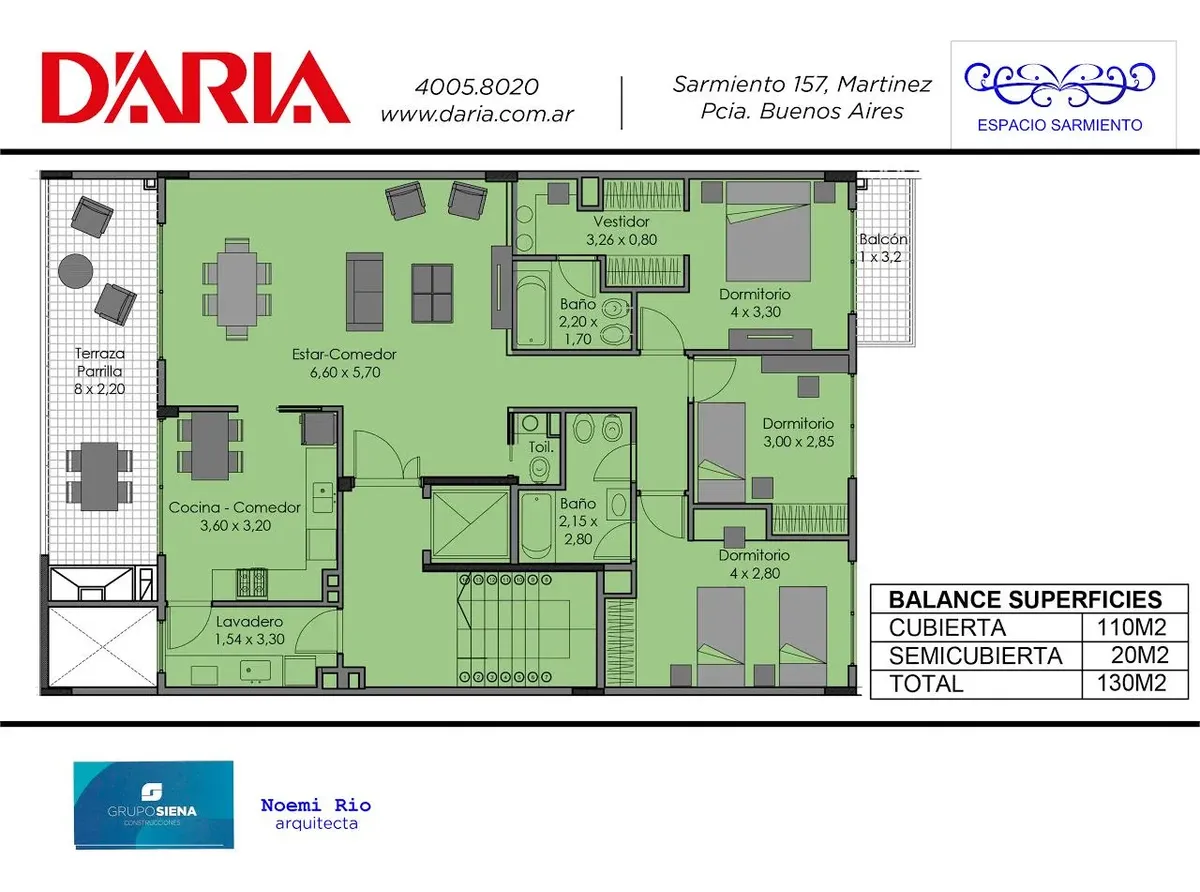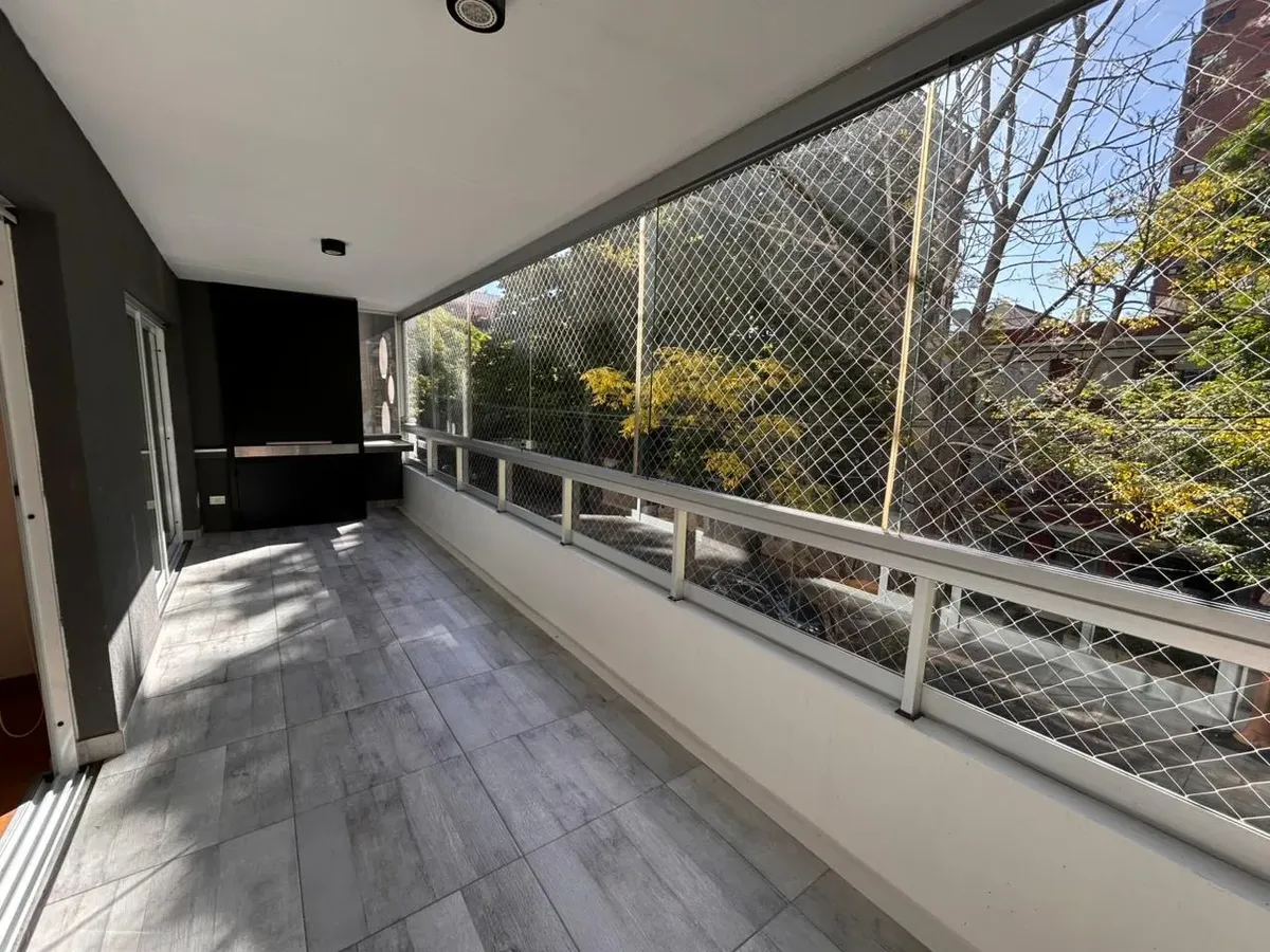 Apartamento de 4 ambientes em Martínez, com dupla orientação de frente e de fundos e vista para árvores. Possui entrada pelo hall privativo, living para sala de jantar com janelas contínuas para a frente e saída para varanda-terraço com churrasqueira individual, além de ampla cozinha com espaço para refeições diárias e aparelhos a gás. Inclui área de serviço com lavadero independente pela entrada de serviço, lavabo social, 3 dormitórios sendo o principal em suíte com closet e mais 2 dormitórios