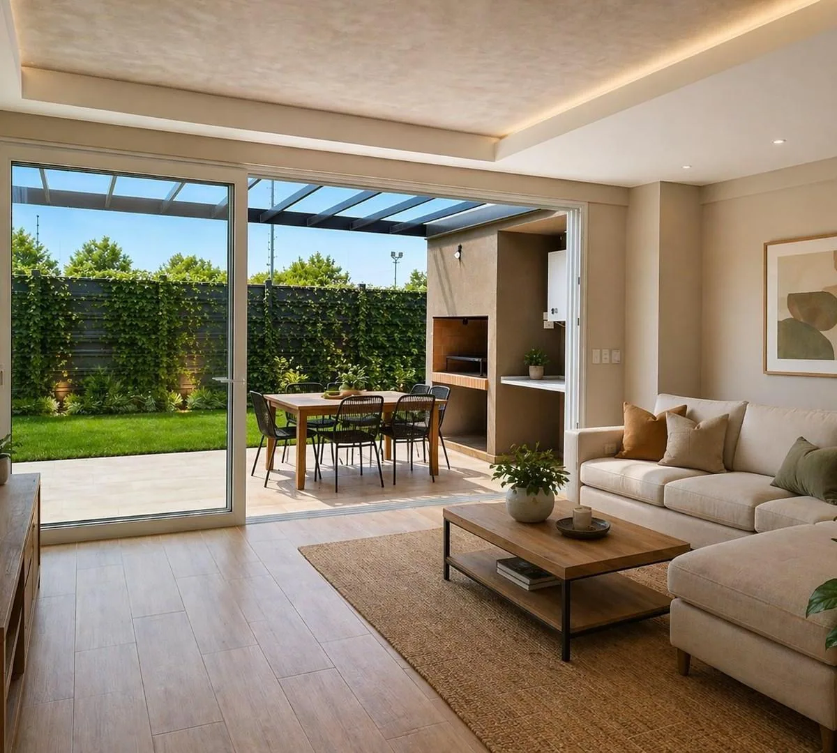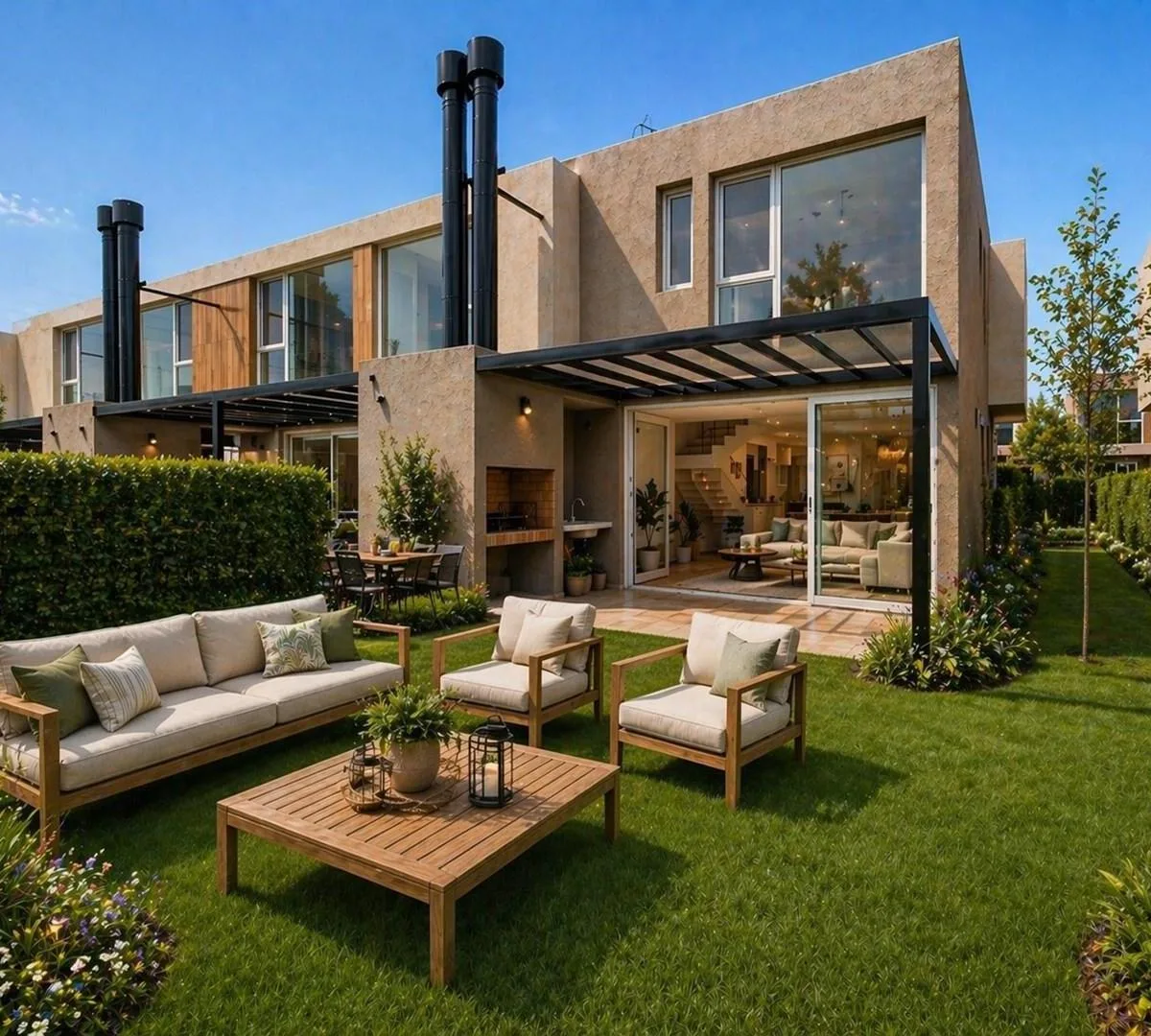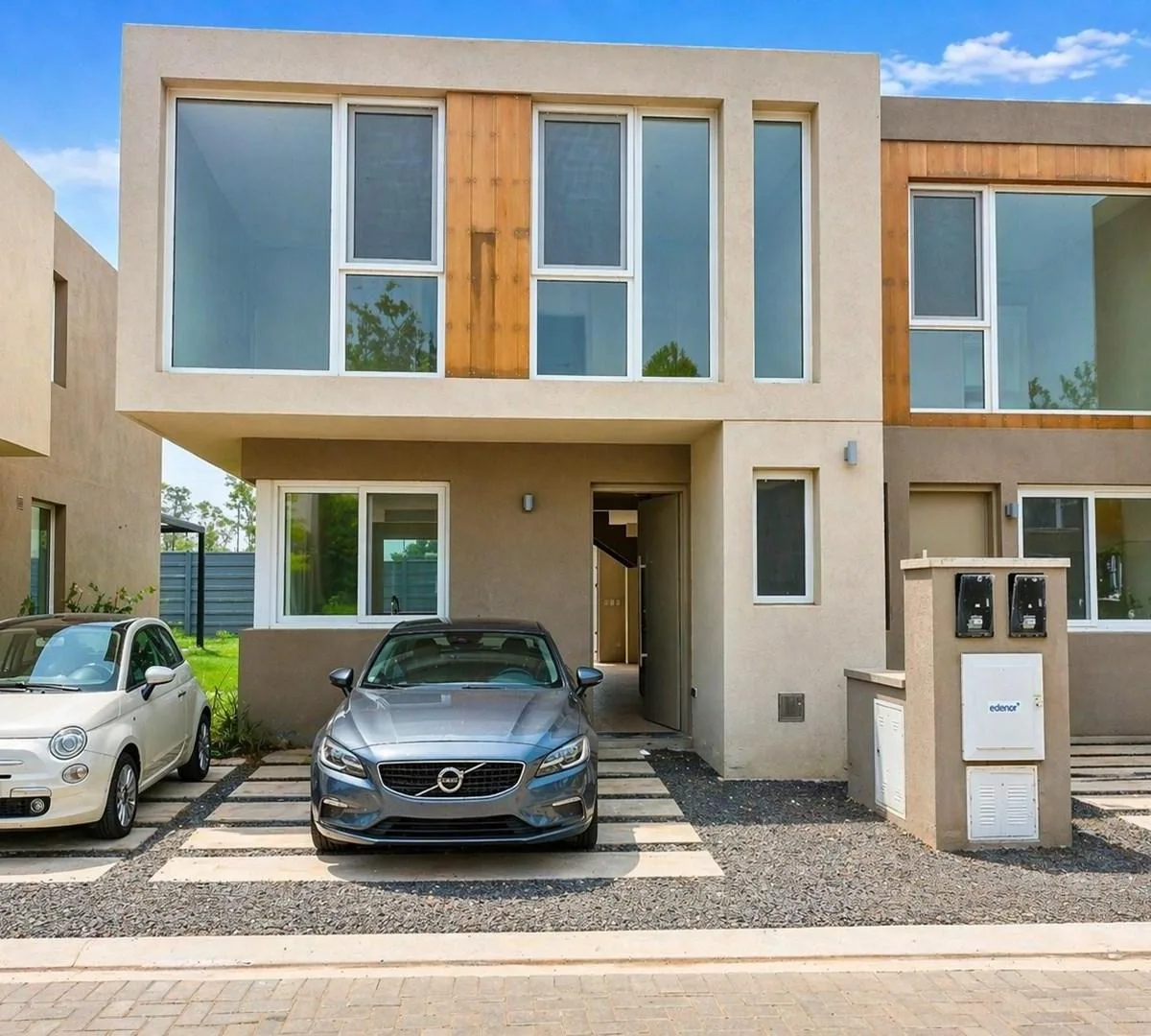 Casa tipo townhouse em aluguel, em duas plantas, com 112 m² cobertos e 18 m² de galeria. No piso térreo há living e sala de jantar com cozinha integrada, lavabo, galeria com área de churrasco e jardim privativo de cerca de 50 m². No piso superior ficam 3 dormitórios, com suíte e mais 2 quartos que compartilham um segundo banheiro completo; a unidade tem espaço para 2 veículos, iluminação, ar-condicionado e trilhos para cortinas. O aquecimento é por piso radiante e a água quente é fornecida por c