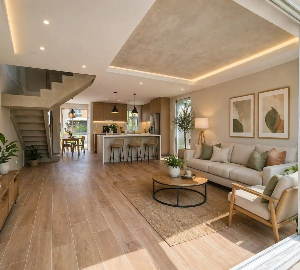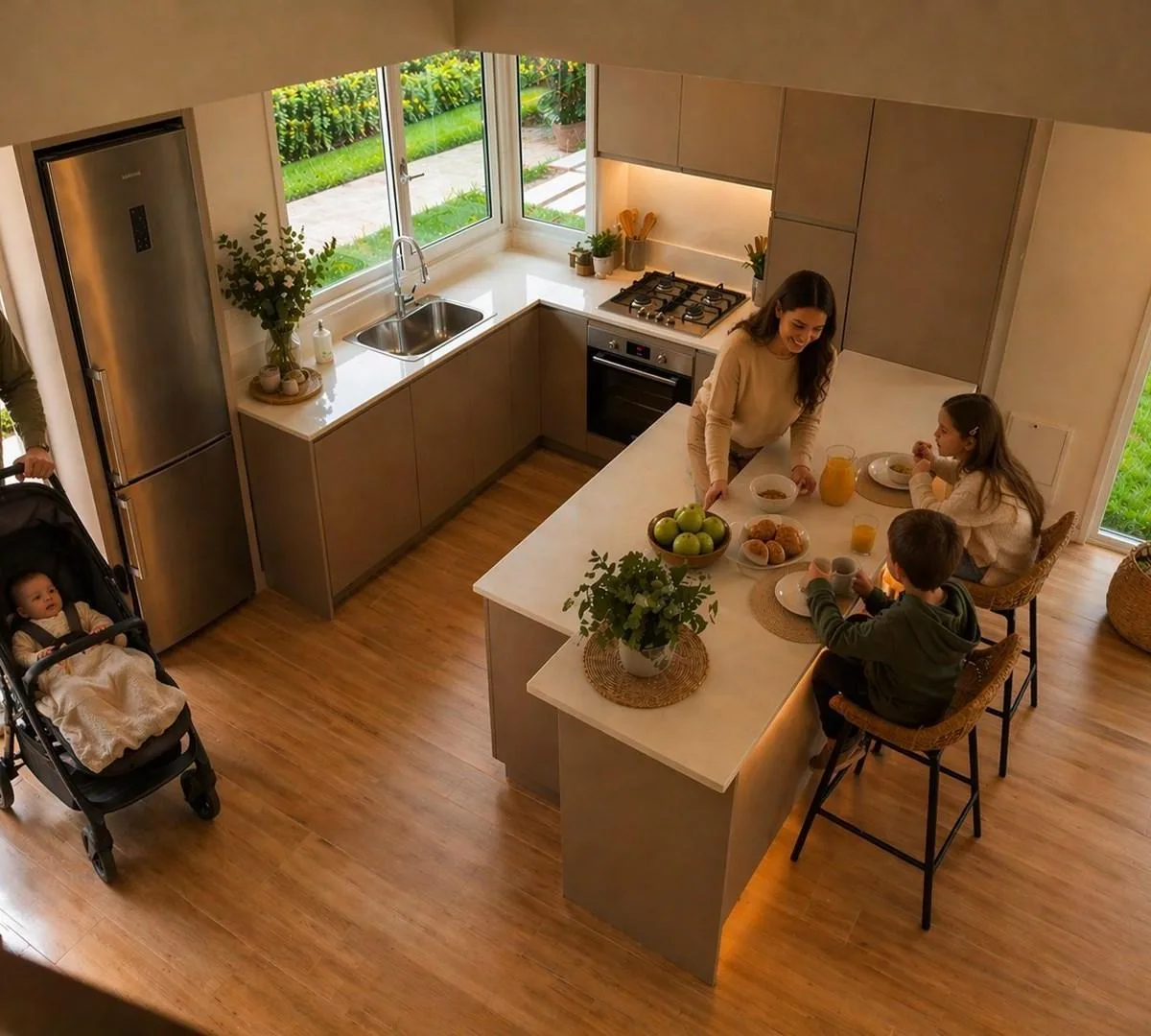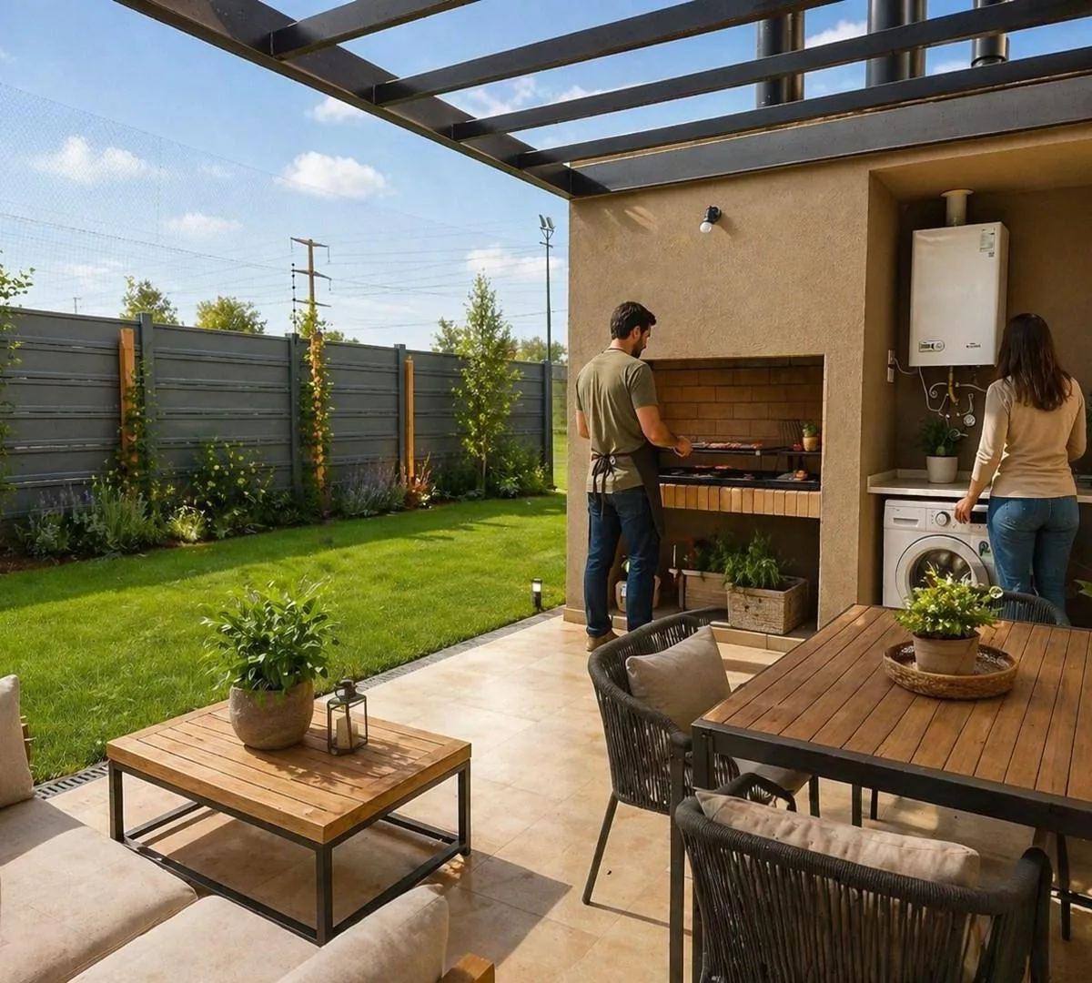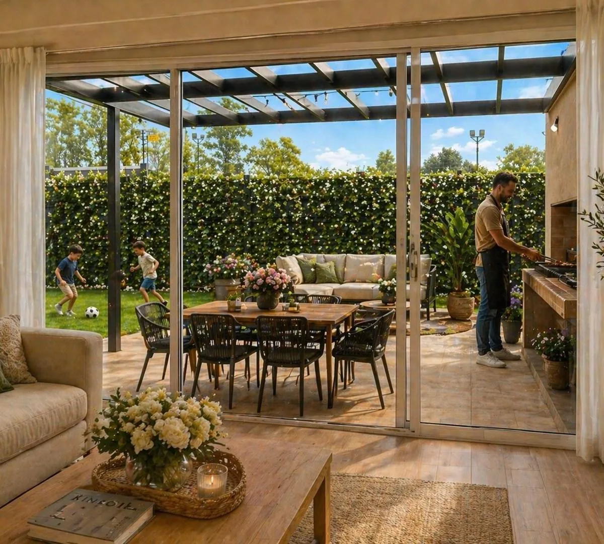 Casa tipo townhouse em aluguel, em duas plantas, com 112 m² cobertos e 18 m² de galeria. No piso térreo há living e sala de jantar com cozinha integrada, lavabo, galeria com área de churrasco e jardim privativo de cerca de 50 m². No piso superior ficam 3 dormitórios, com suíte e mais 2 quartos que compartilham um segundo banheiro completo; a unidade tem espaço para 2 veículos, iluminação, ar-condicionado e trilhos para cortinas. O aquecimento é por piso radiante e a água quente é fornecida por c
