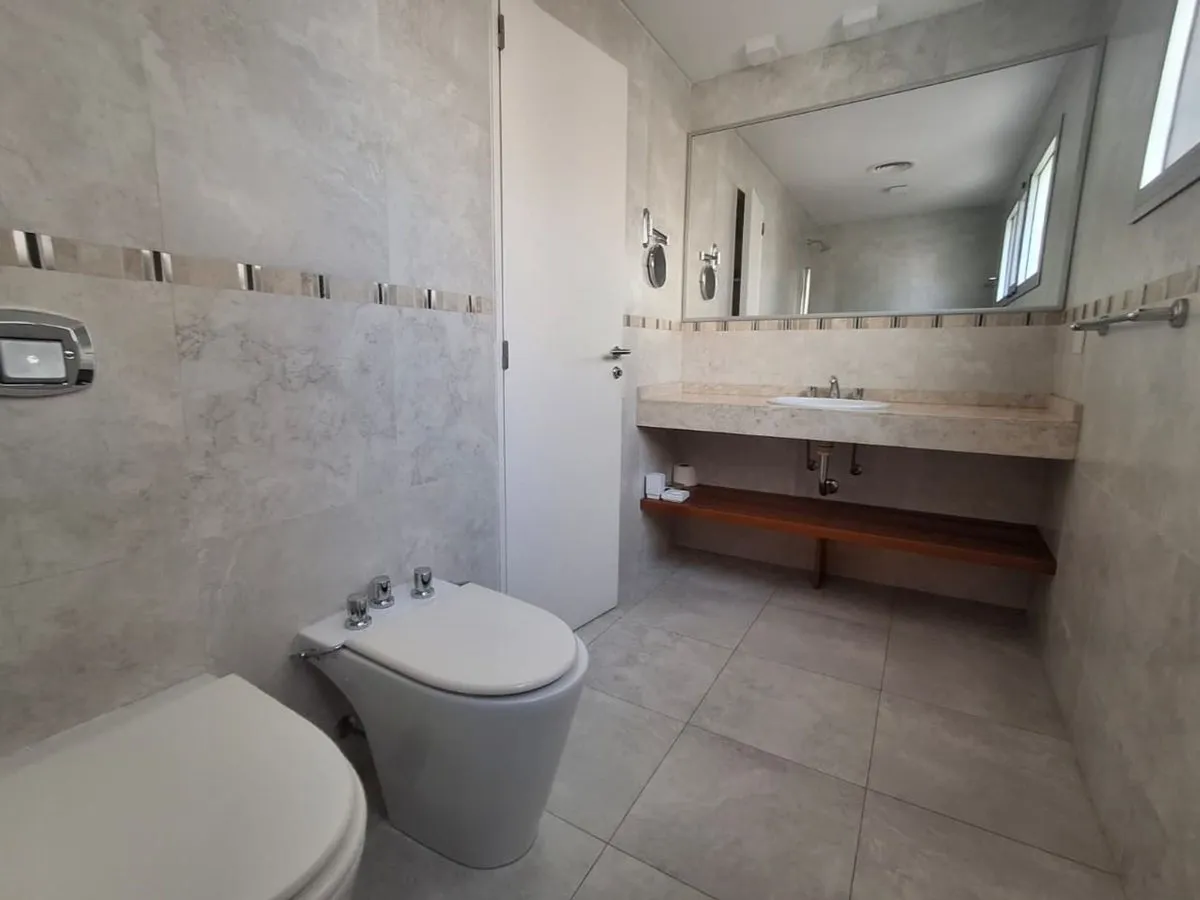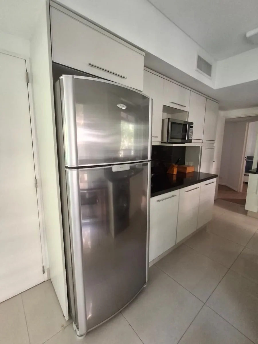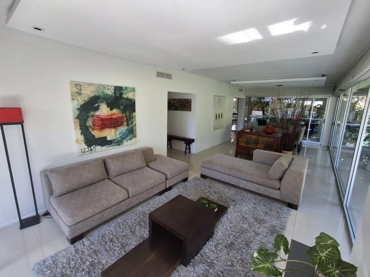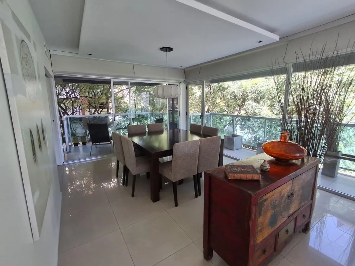 Apartamento mobiliado de 4 ambientes em Olivos, bairro "La Isla", com vaga de garagem e depósito no subsolo. Fica no 5º andar e tem vista parcial para o rio e para a arborização do bairro. Há hall de entrada por elevador principal ou de serviço com acesso por antecâmara privada.