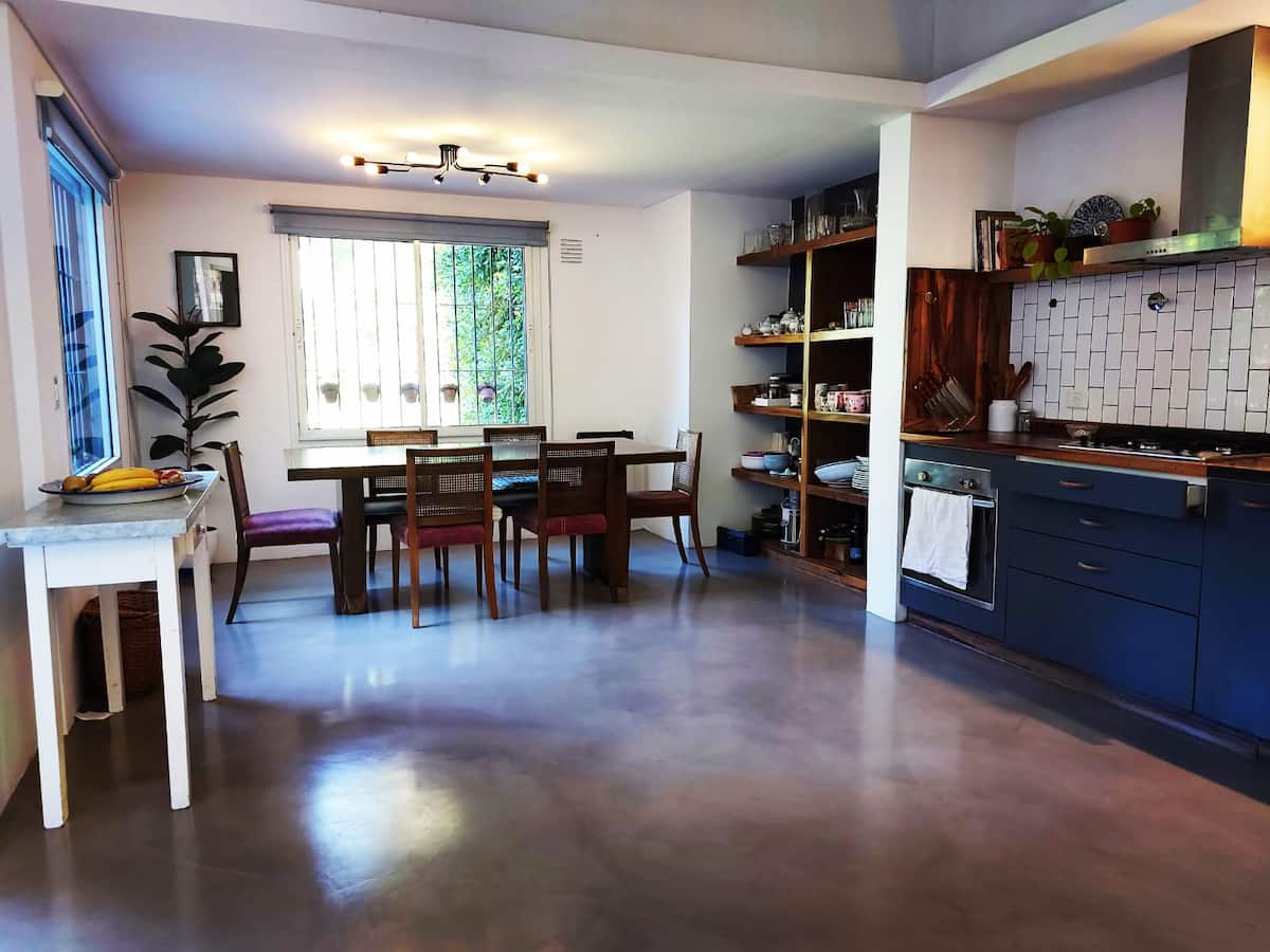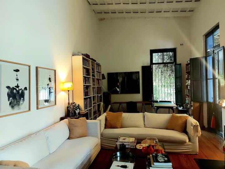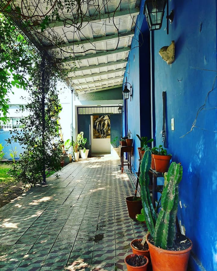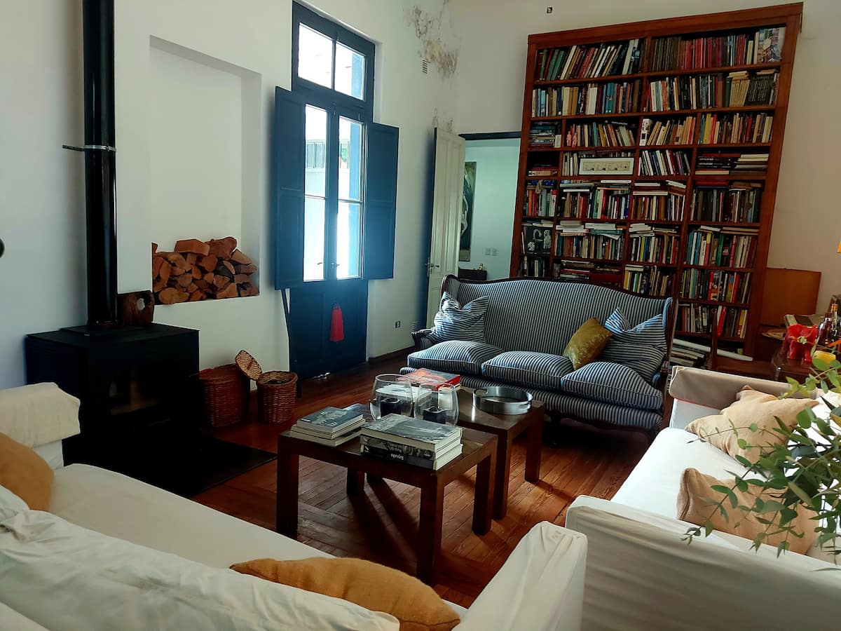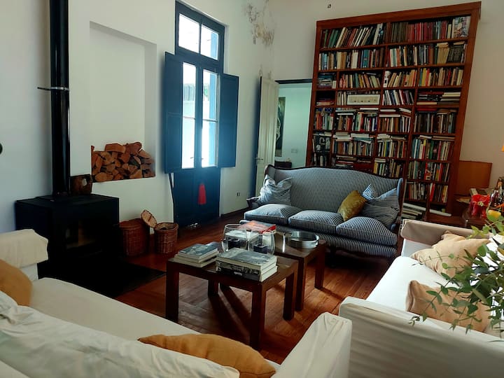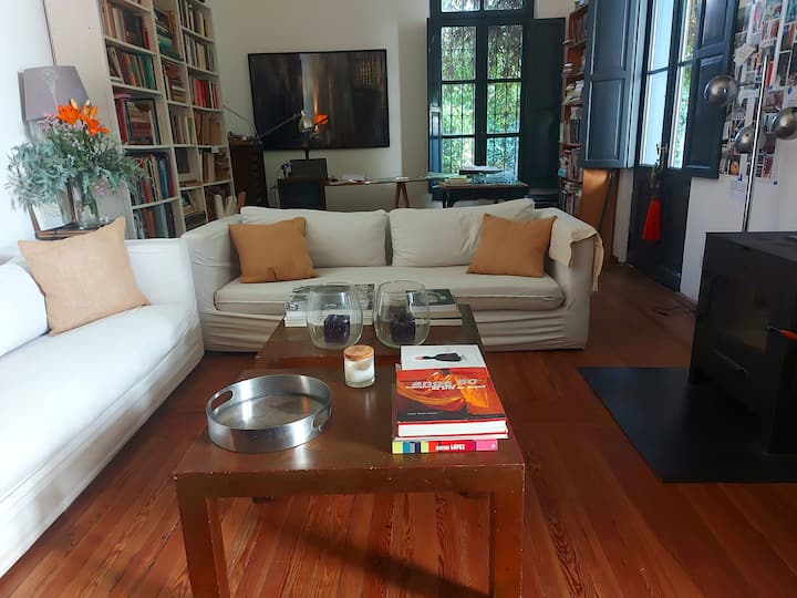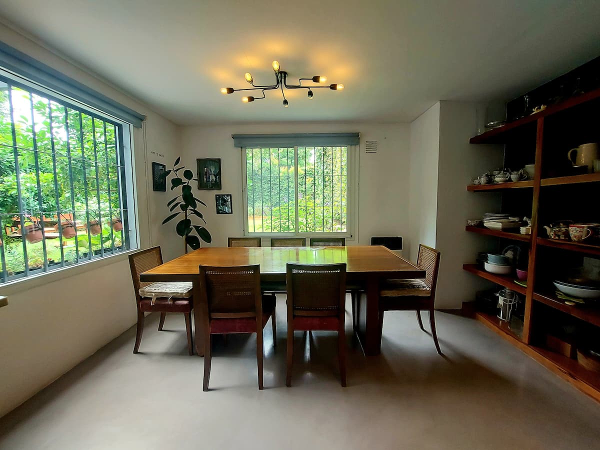 Casa em Beccar com 4 dormitórios. A planta inclui uma sala de estar antiga com pé-direito alto e área integrada de sala de jantar e cozinha. Há piscina e jardim, além de espaços com boa iluminação. O imóvel tem um gato no local.