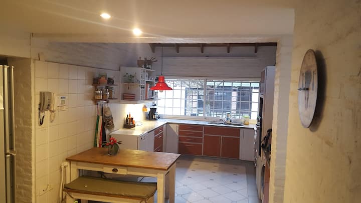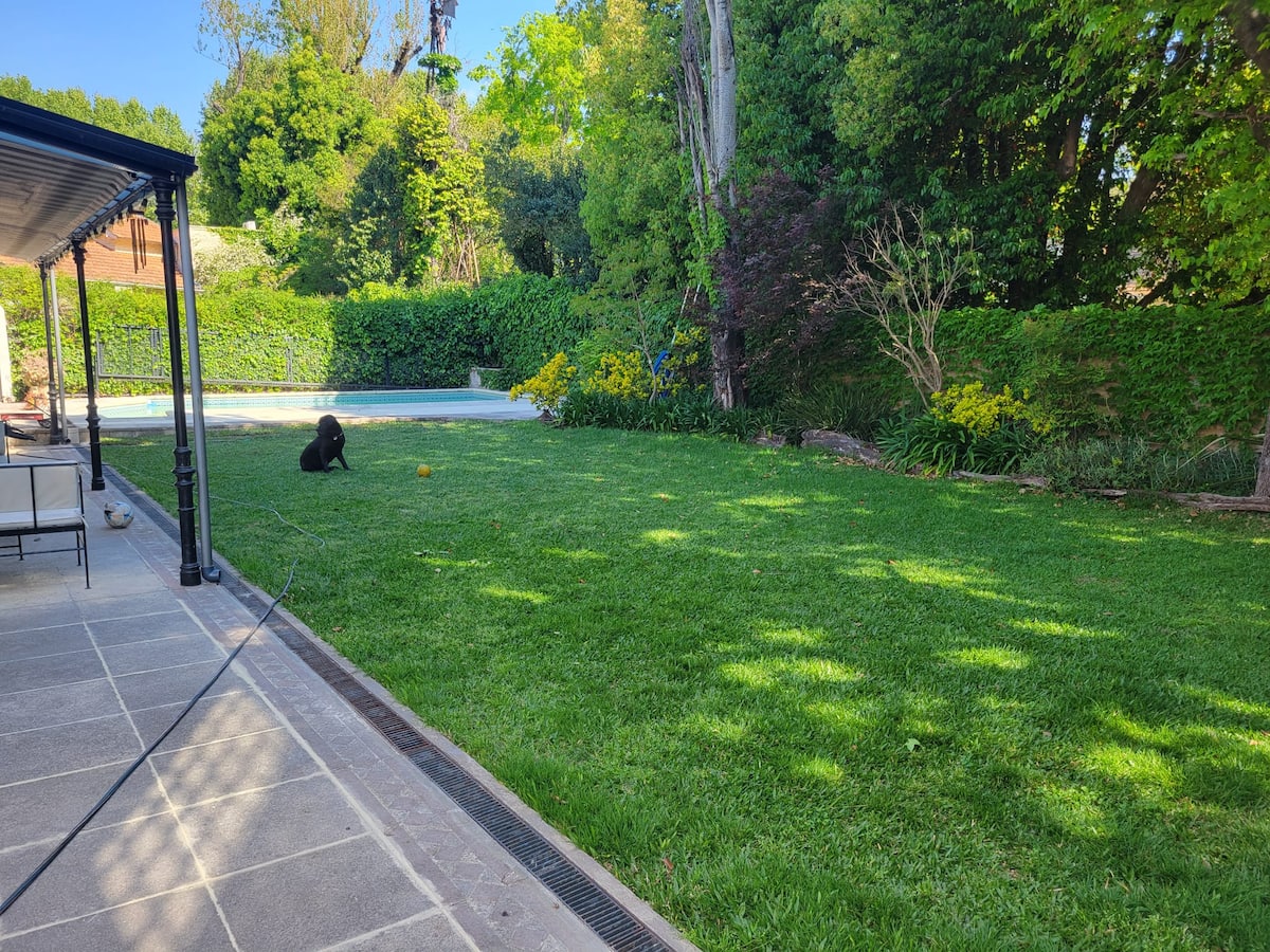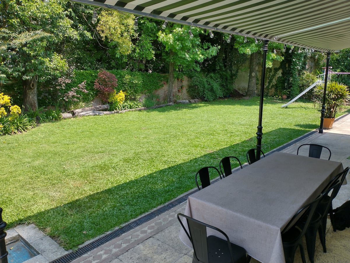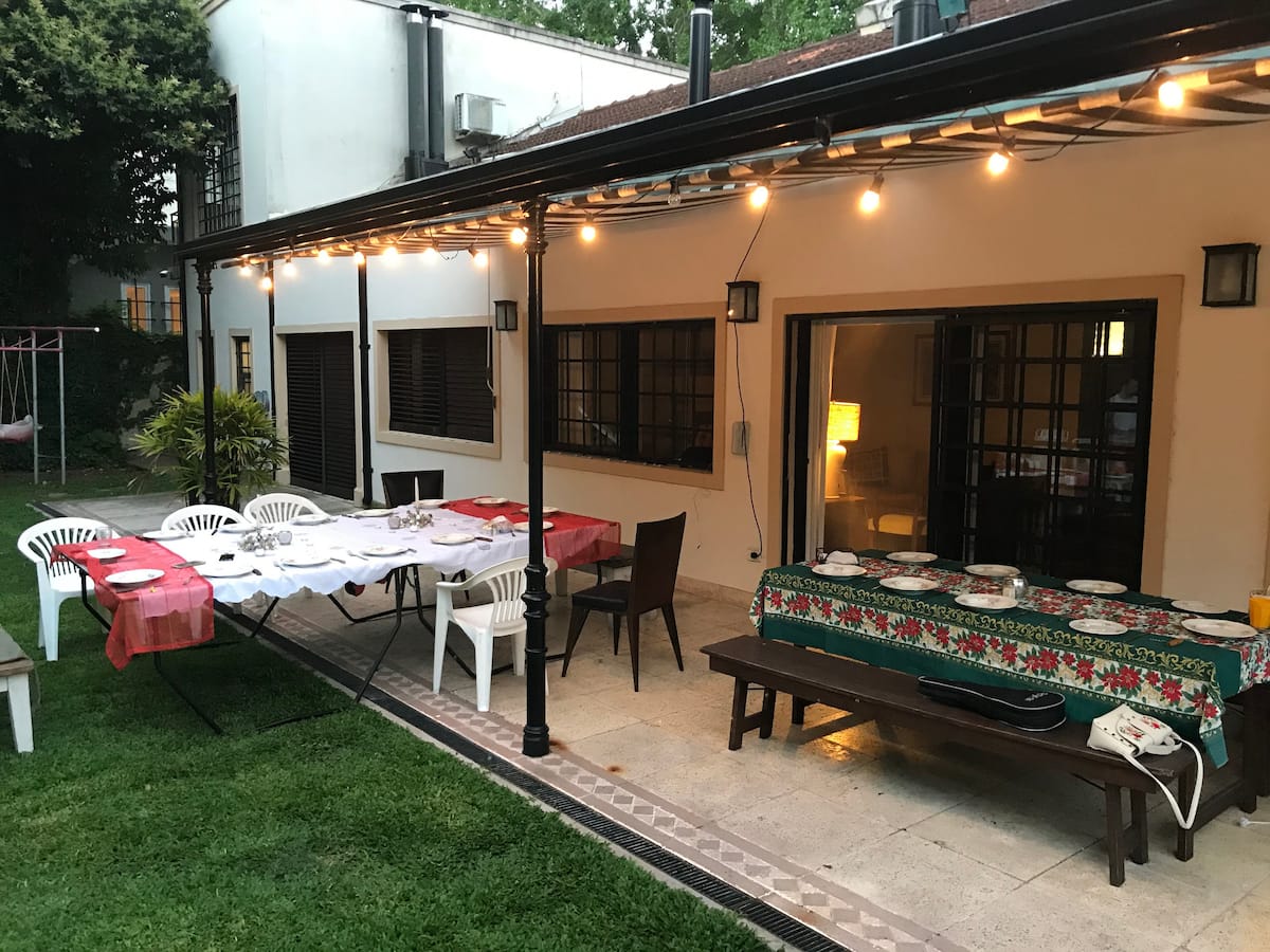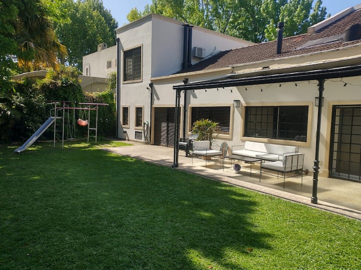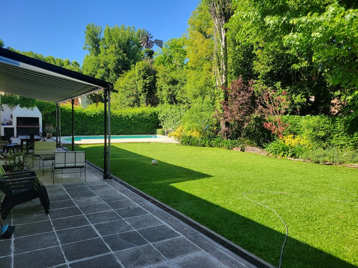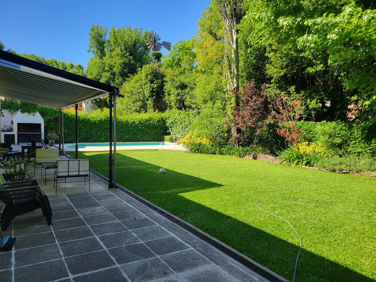 Casa em Beccar com 4 dormitórios e 3 banheiros, com todos os dormitórios no térreo. Dispõe de piscina no jardim cercado, área de churrasco e uma sala de recreação com TV e Chromecast. A cozinha é integrada e tem balcões de mármore, forno elétrico e eletrodomésticos, além de mesa de jantar e 2 bancos. Há 2 espaços de trabalho privativos no 1º andar e mesa de pingue-pongue. O imóvel tem ventiladores de teto nos dormitórios e internet Wi‑Fi com cobertura de 100 Mb.