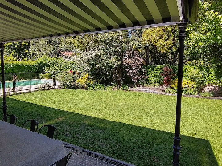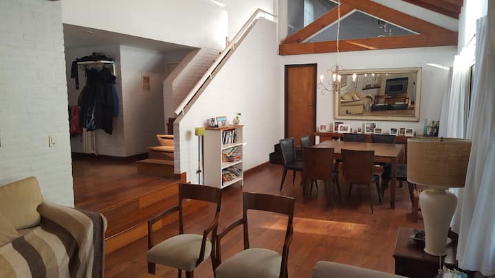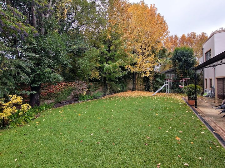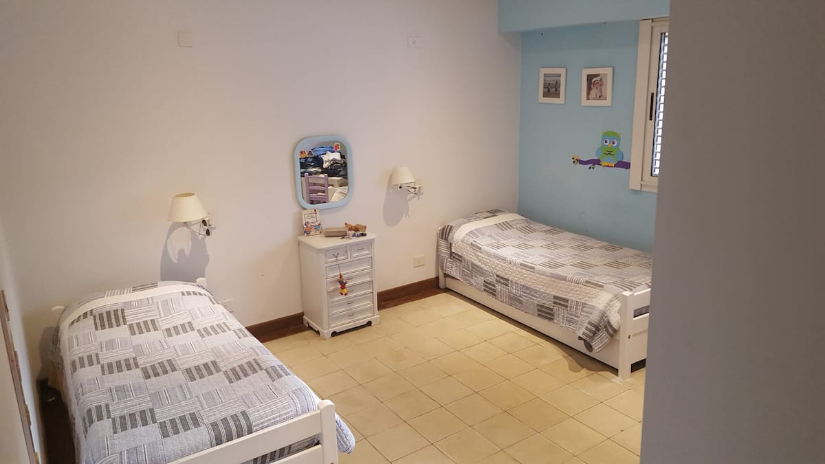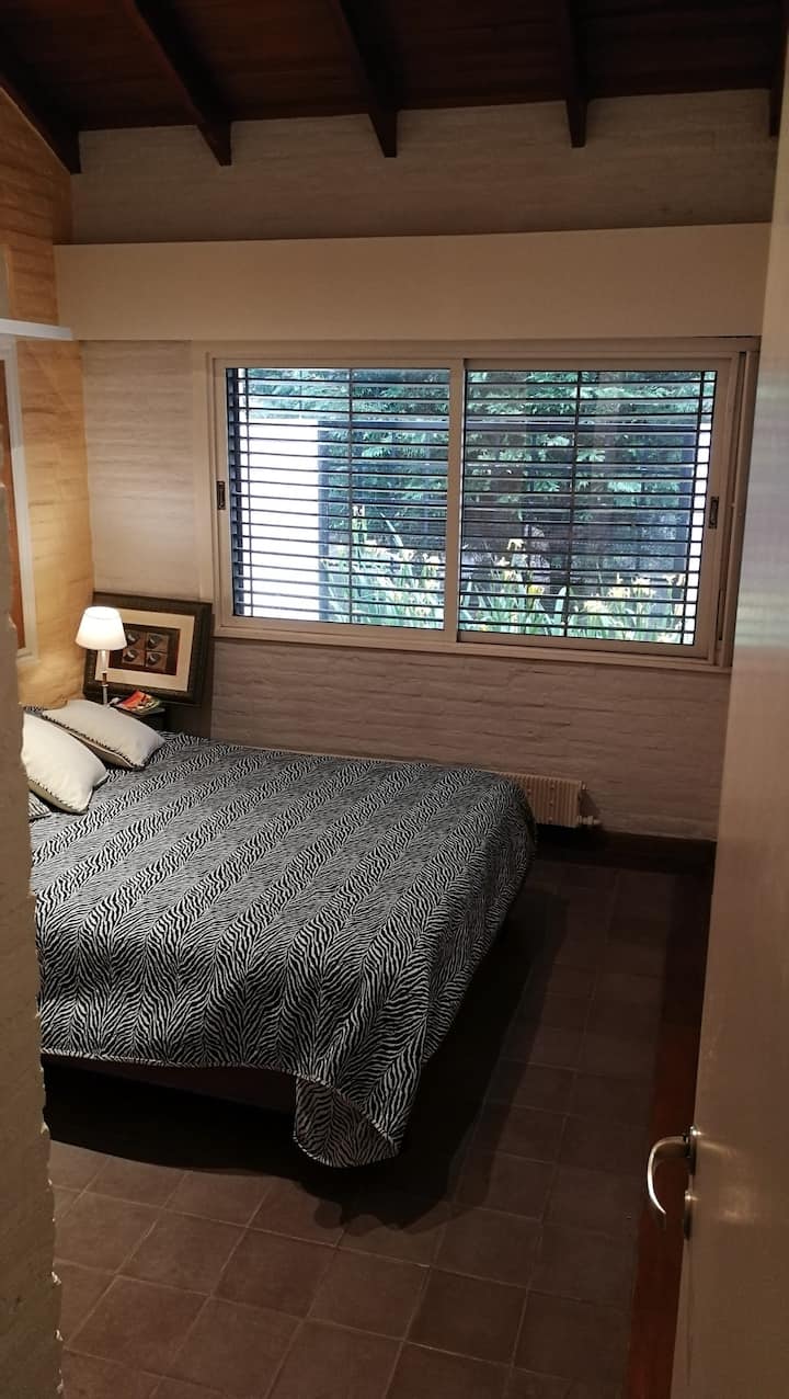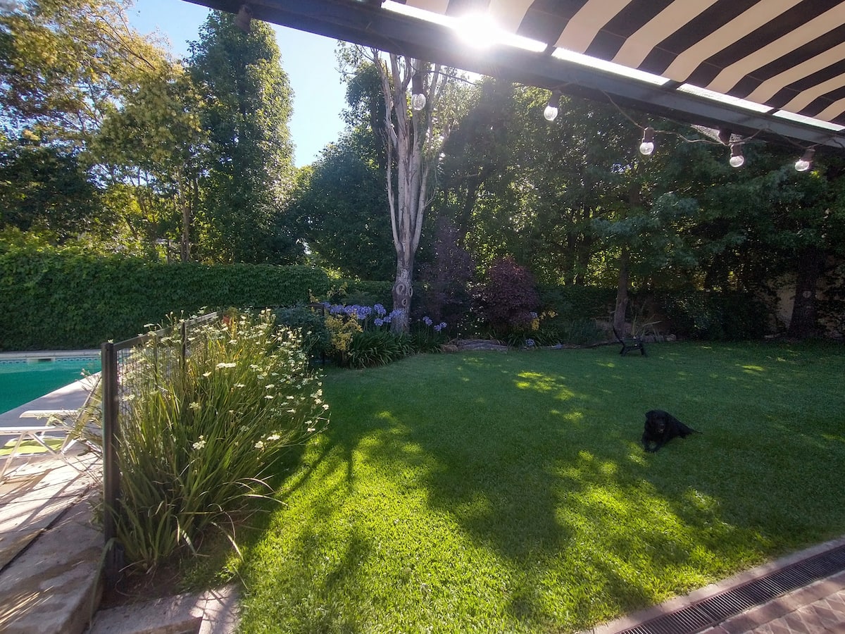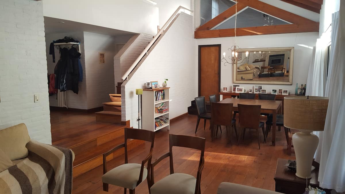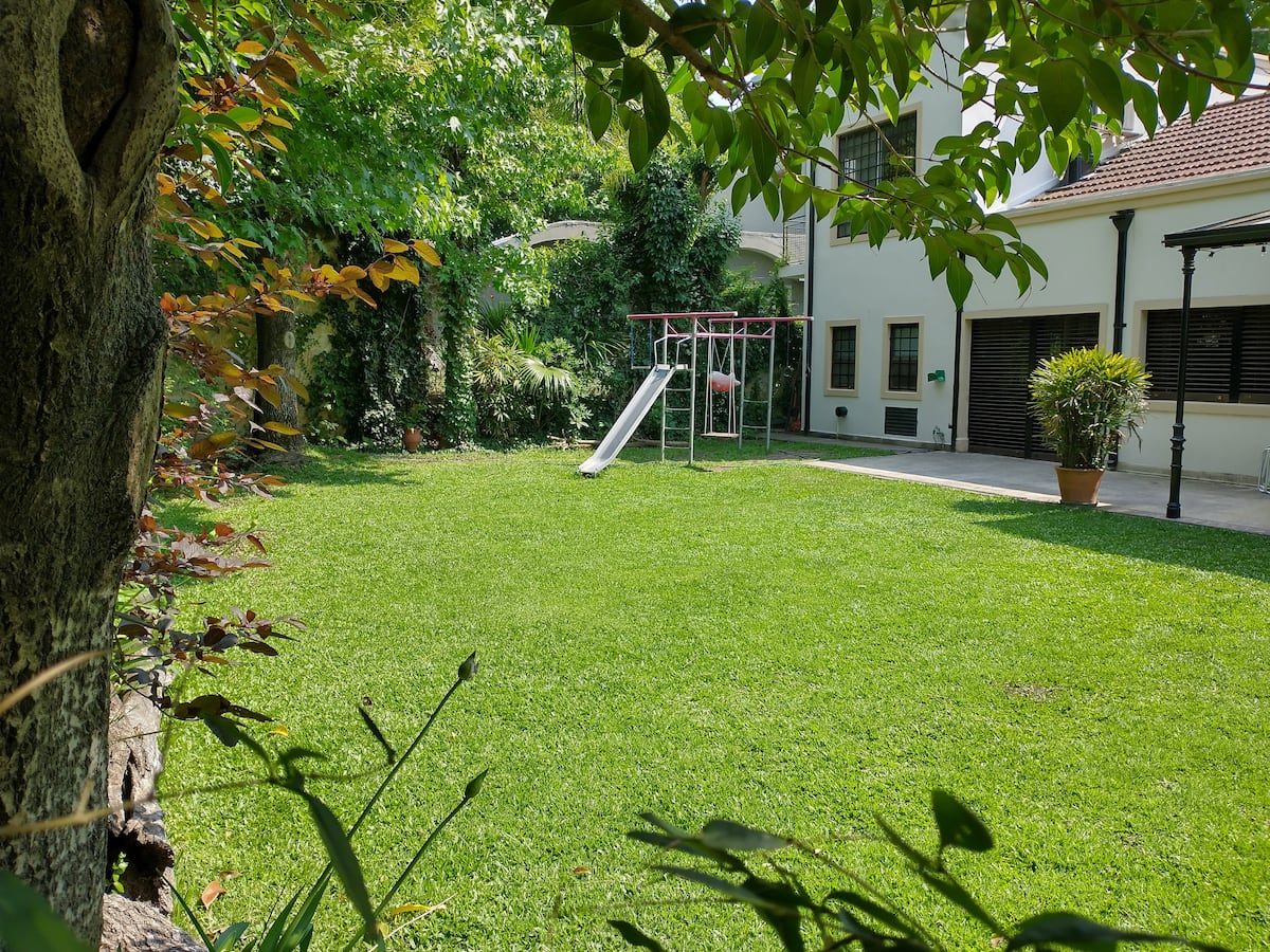Casa em Beccar com 4 dormitórios e 3 banheiros, com todos os dormitórios no térreo. Dispõe de piscina no jardim cercado, área de churrasco e uma sala de recreação com TV e Chromecast. A cozinha é integrada e tem balcões de mármore, forno elétrico e eletrodomésticos, além de mesa de jantar e 2 bancos. Há 2 espaços de trabalho privativos no 1º andar e mesa de pingue-pongue. O imóvel tem ventiladores de teto nos dormitórios e internet Wi‑Fi com cobertura de 100 Mb.