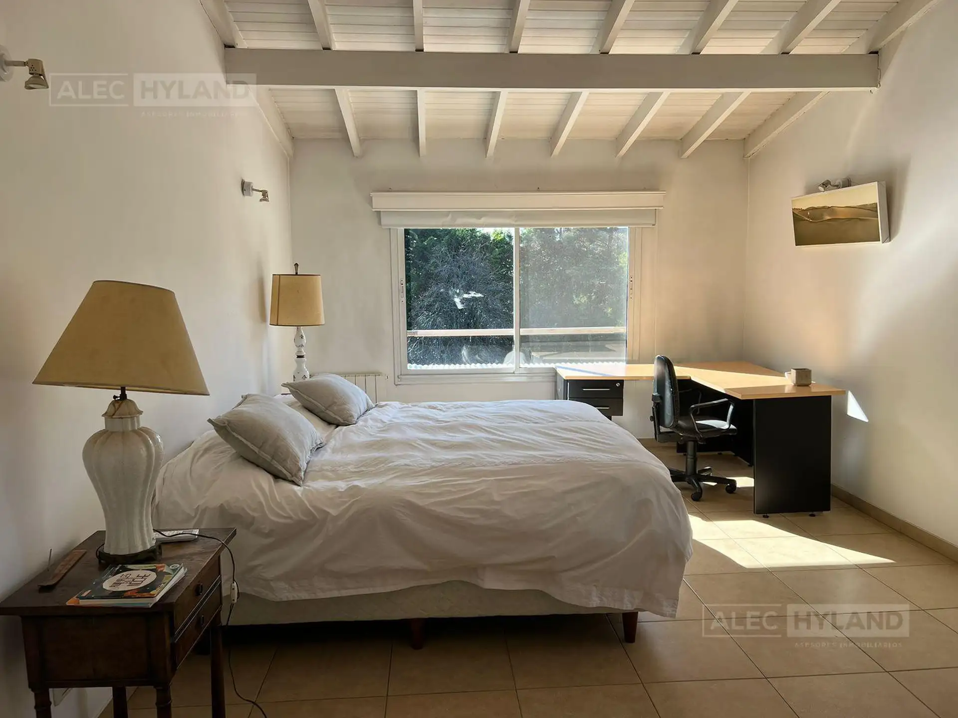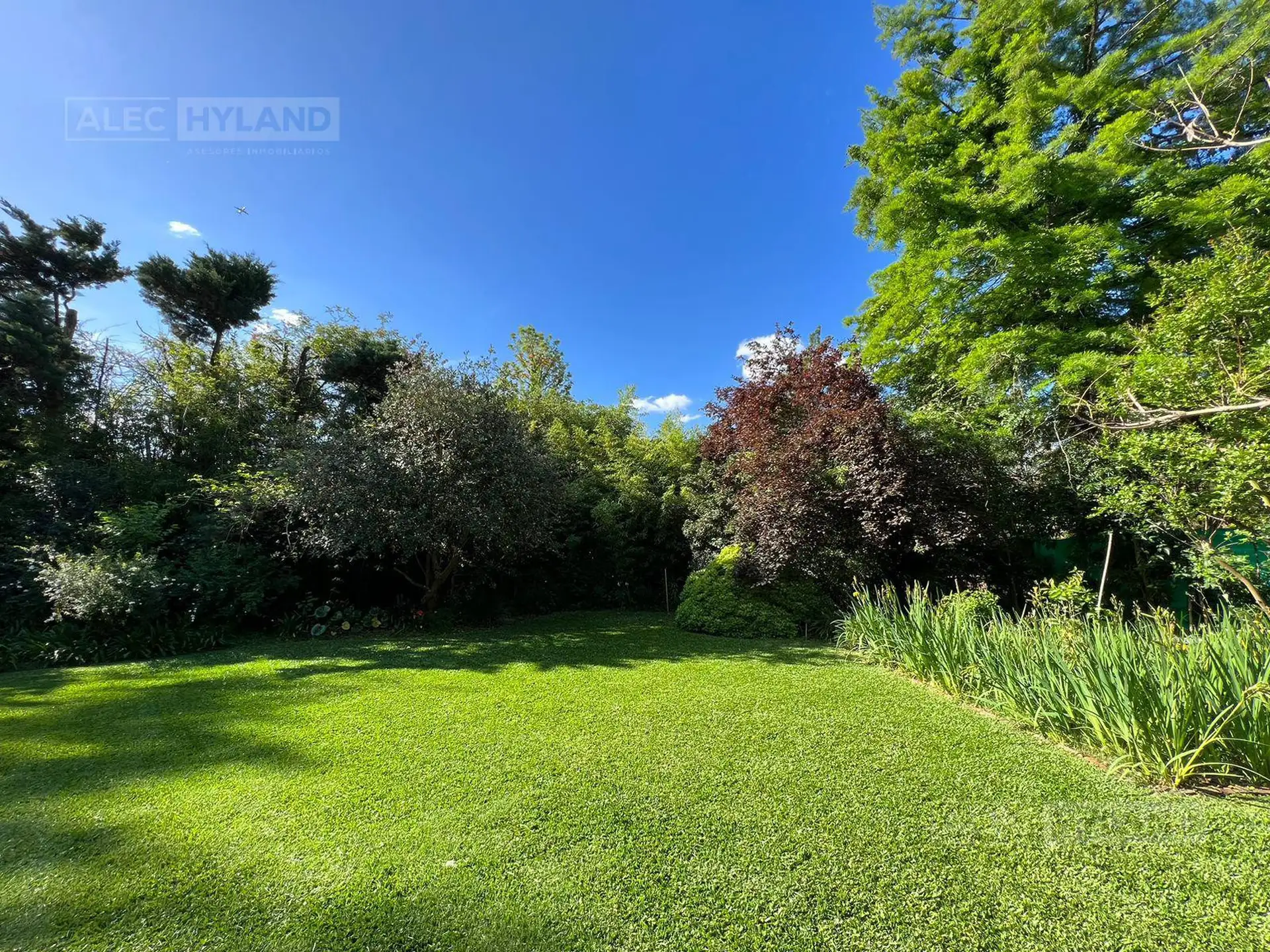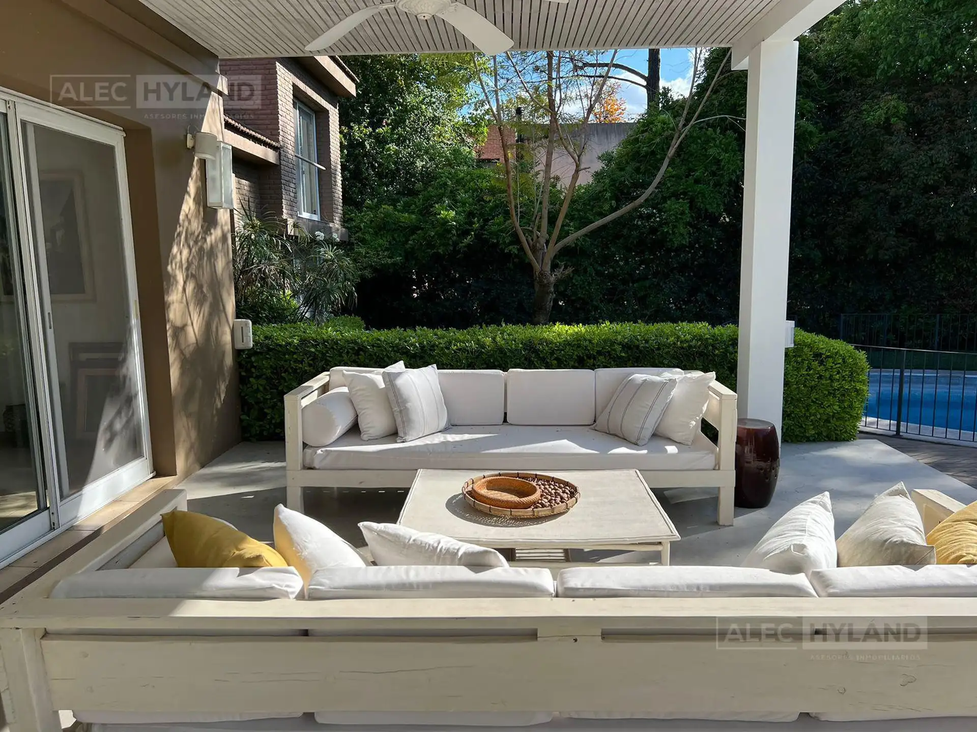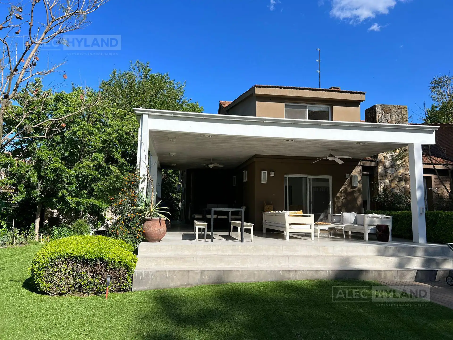 Casa para aluguel temporário de verão em Beccar. Hall, sala e jantar em desnível com saída para o jardim, além de 1 suíte de hóspede no térreo. No andar superior, há 3 suítes, incluindo suíte principal com closet, e um family room de 6 x 8 com saída para o jardim. A casa tem galeria com área de churrasco, forno de barro e forno kamado, área de assador em cruz, jardins com miolo de quadra, riego automatizado por aspersão e filtro de piscina, 2 hortas elevadas e portão automatizado com espaço para