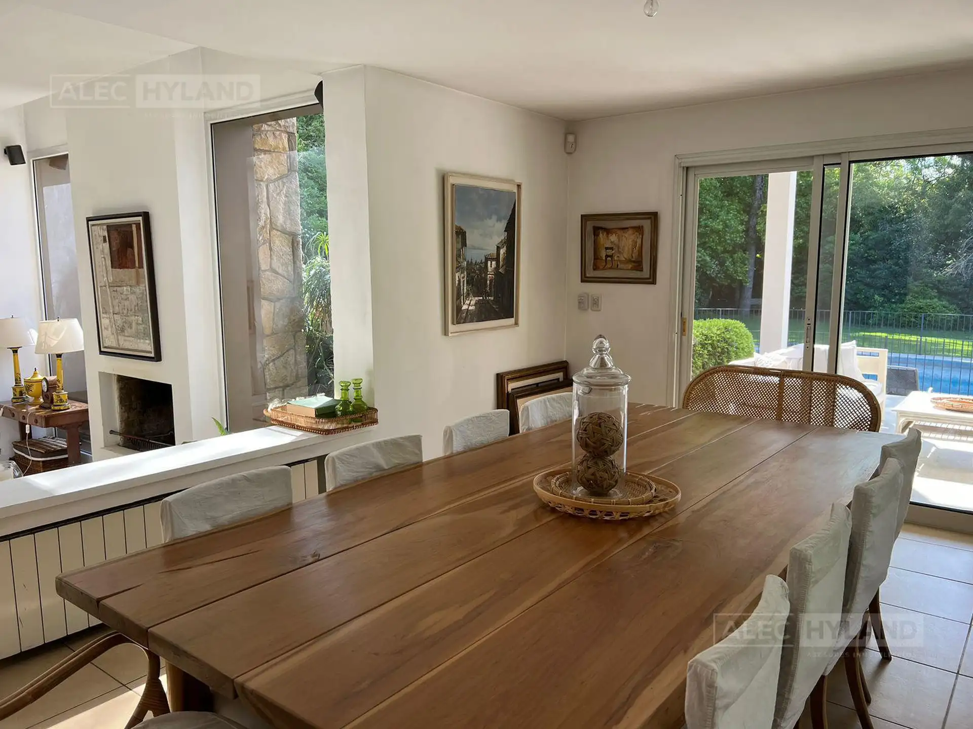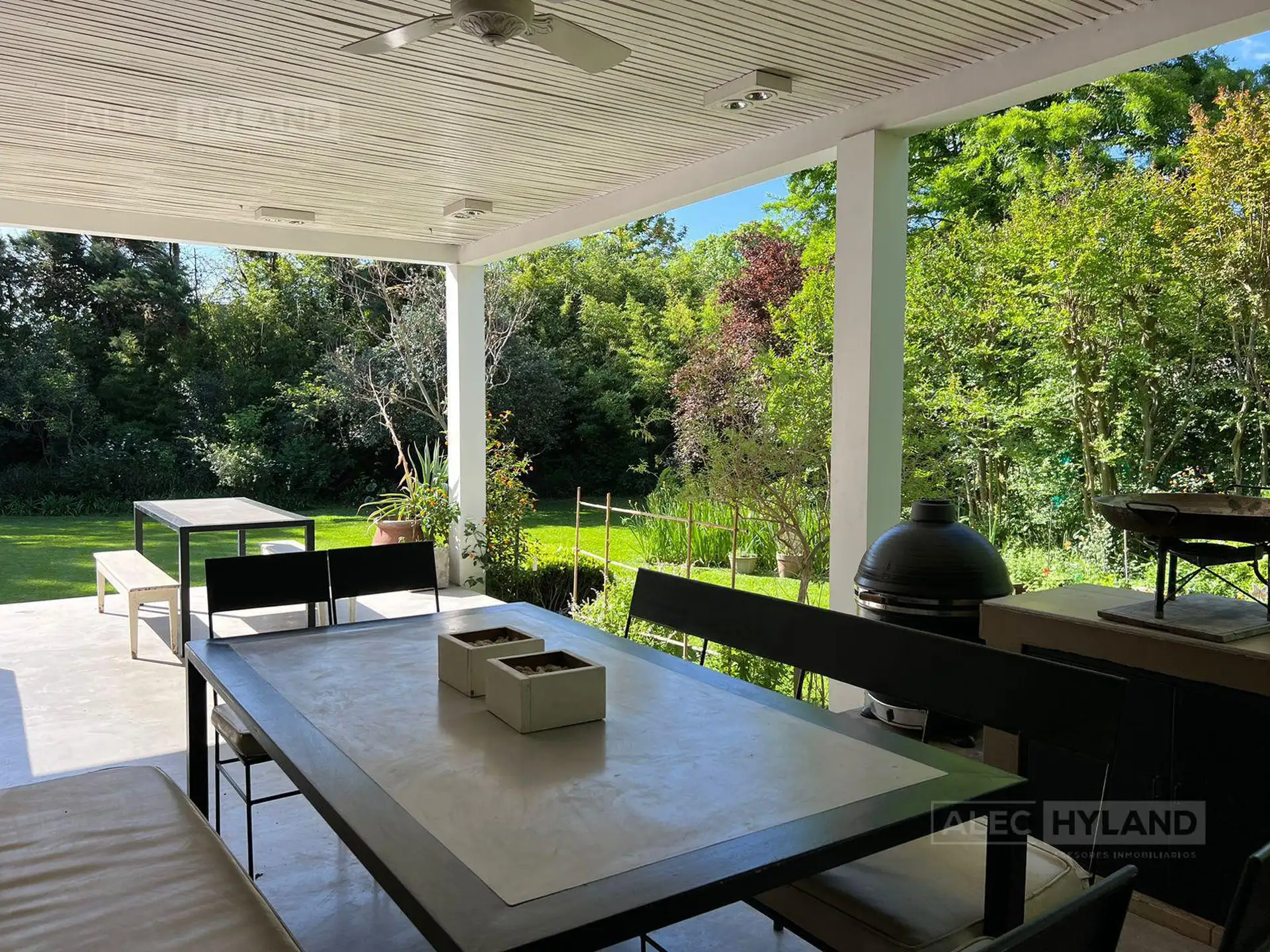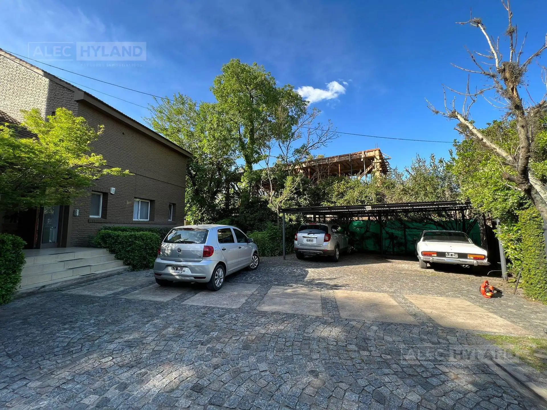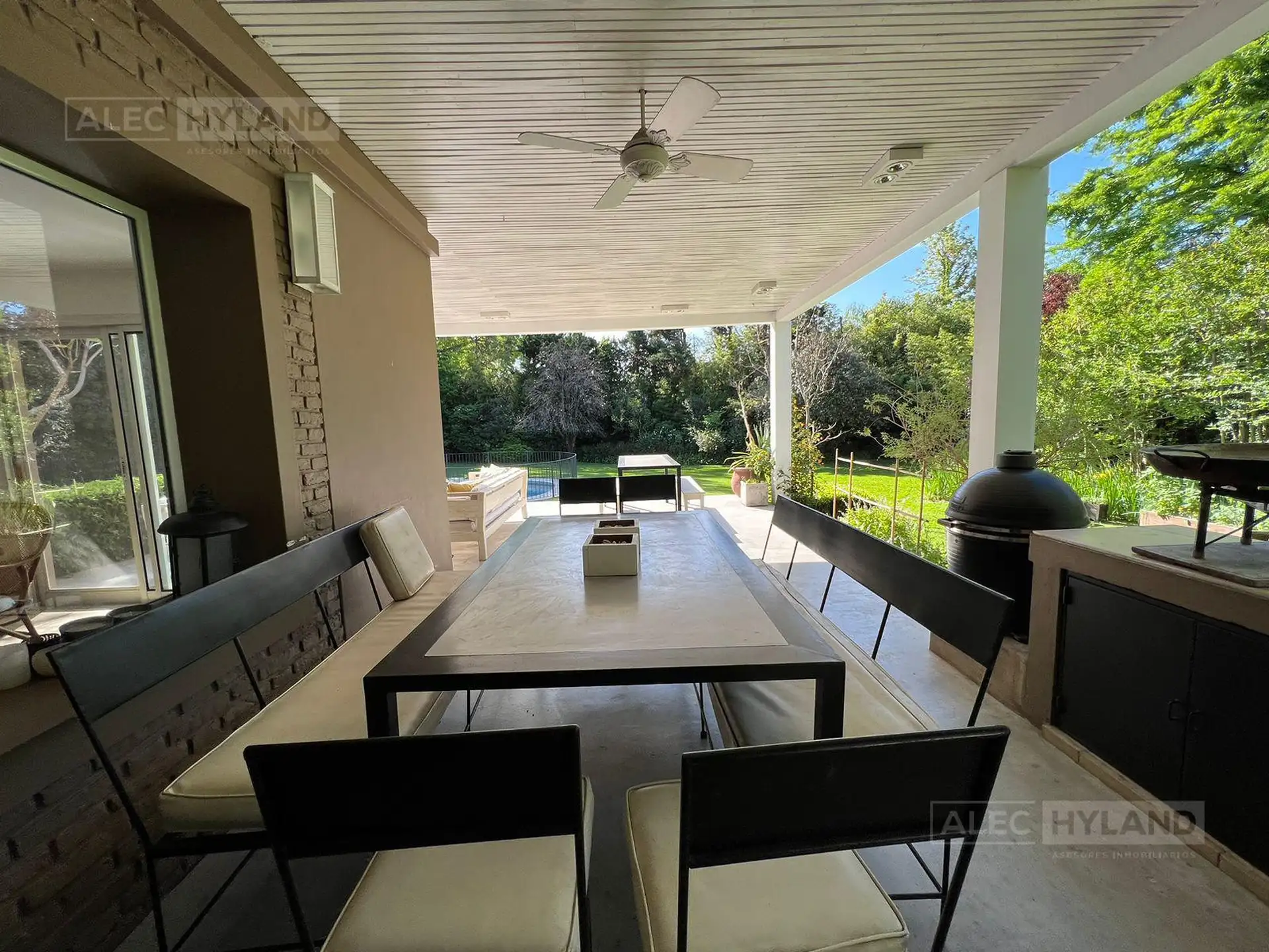 Casa para aluguel temporário de verão em Beccar. Hall, sala e jantar em desnível com saída para o jardim, além de 1 suíte de hóspede no térreo. No andar superior, há 3 suítes, incluindo suíte principal com closet, e um family room de 6 x 8 com saída para o jardim. A casa tem galeria com área de churrasco, forno de barro e forno kamado, área de assador em cruz, jardins com miolo de quadra, riego automatizado por aspersão e filtro de piscina, 2 hortas elevadas e portão automatizado com espaço para