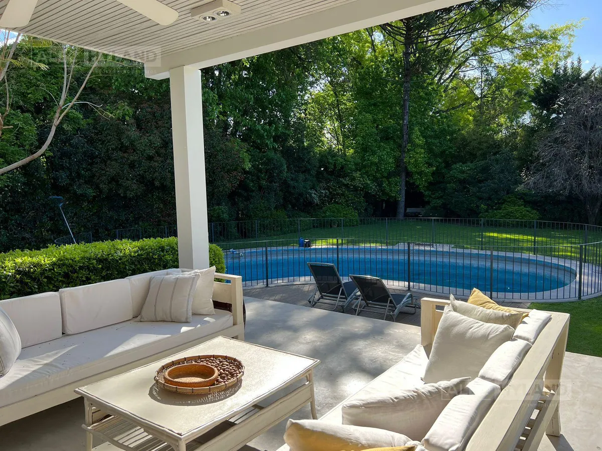 Casa para aluguel temporário em Beccar, com hall e amplo living e sala de jantar em desnível com acesso ao jardim. Há 1 suíte em planta baixa e 3 suítes em planta alta, sendo a principal com closet. No 1º piso, há family room de 6 x 8 com saída para o jardim. A área externa inclui galeria com área de churrasco, forno de barro, forno kamado e espaço para assar; riego por aspersão e filtro da piscina automatizados, jardinagem e miolo de quadra. Há 2 hortas elevadas e portão automatizado com espaço