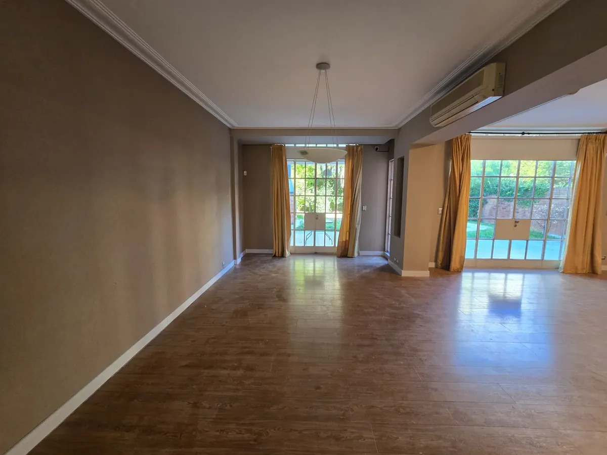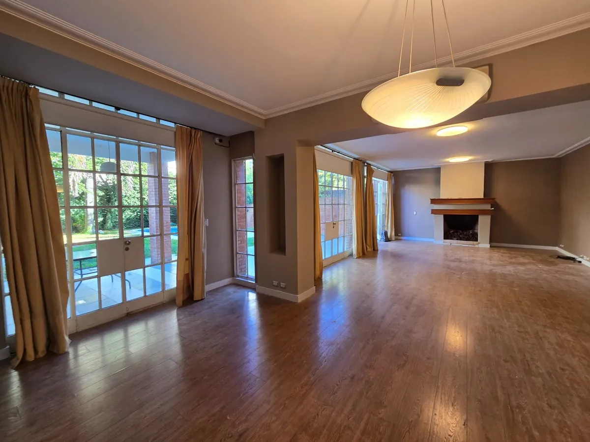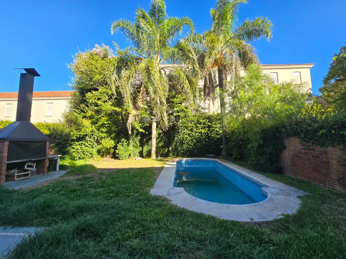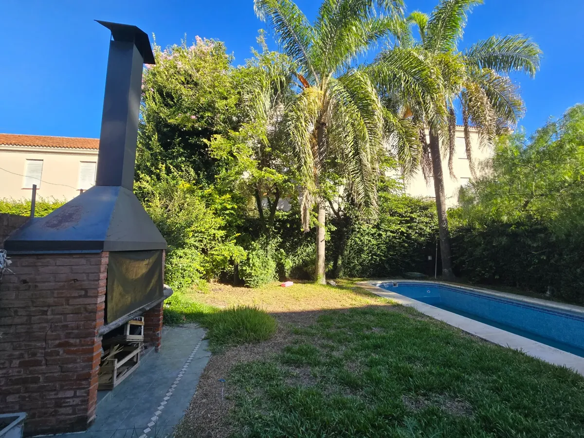 Chalé em Beccar com 4 dormitórios. Conta com hall de entrada, living com lareira e pisos de madeira e sala de jantar formal, além de lavabo. A cozinha tem área de refeições diárias e móveis em madeira. A área externa tem galeria coberta com churrasqueira, jardim com piscina e garagem para 1 carro.