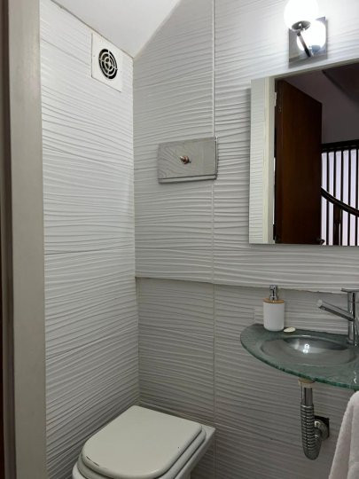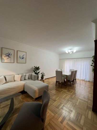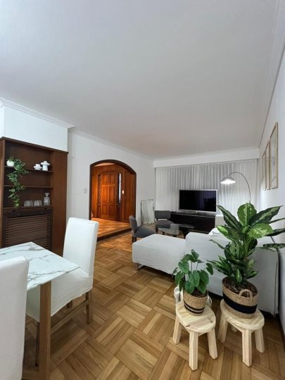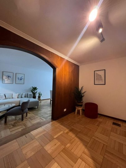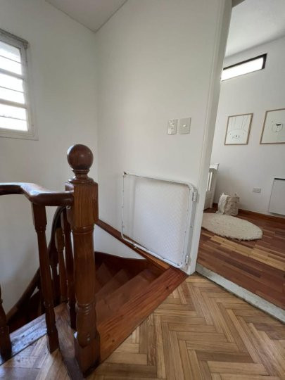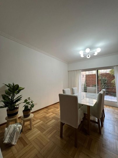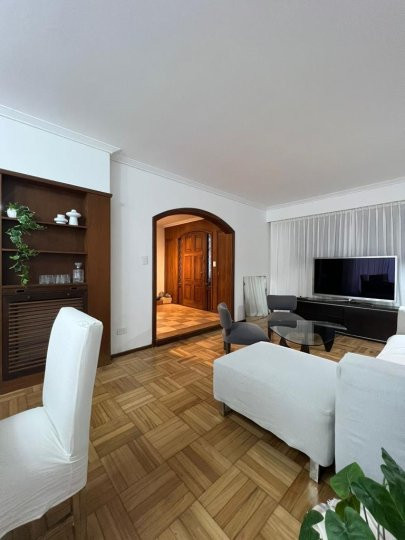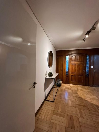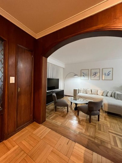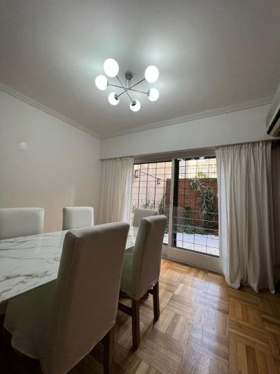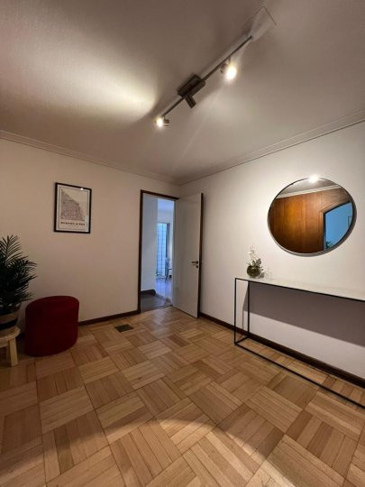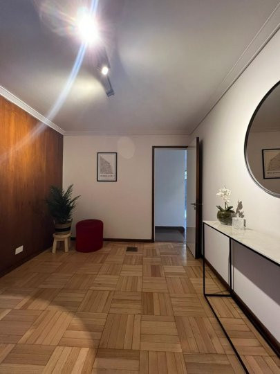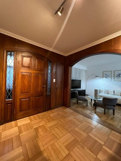 Apartamento em Belgrano com 5 ambientes e 167 m², aluguel temporário por USD 2.000 mais serviços. Está distribuído em dois pisos: na planta baixa, hall de entrada, cozinha completa com sala de refeições, living com acesso ao parque, área de lavanderia, área de churrasco e lavabo; na planta alta, 3 dormitórios, mais um ambiente usado como escritório, com possibilidade de receber outra cama, e banheiro completo. Unidade com descrição de “casa em duas plantas”.