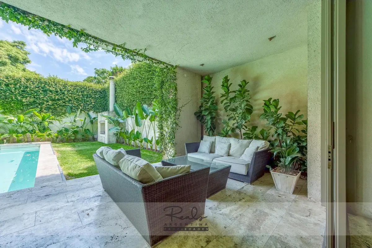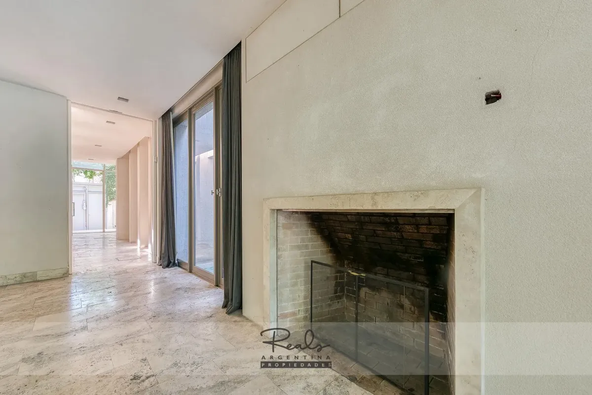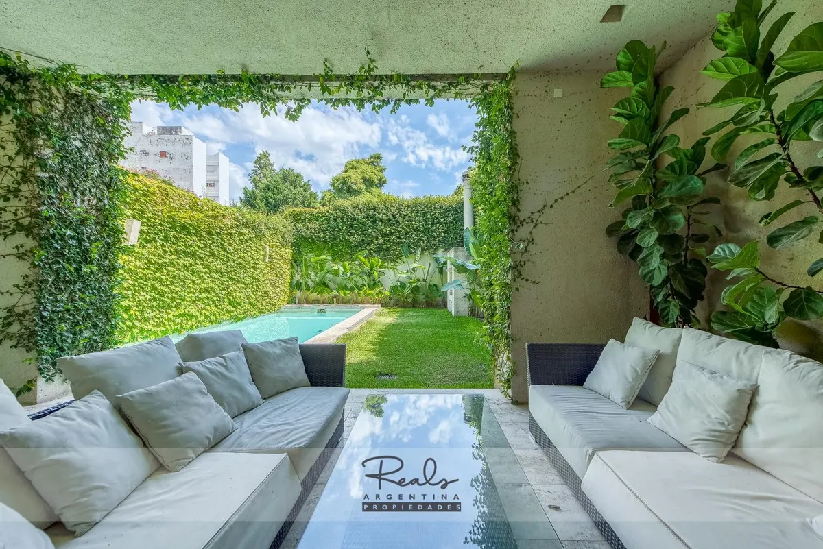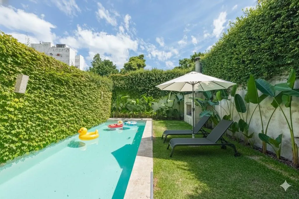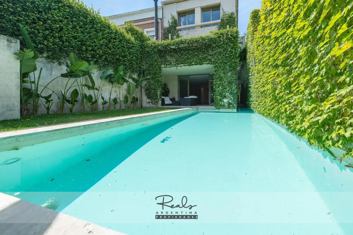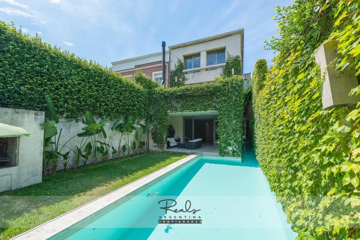 Casa em três plantas em Belgrano Chico, em terreno de 8,66 x 44 metros. Tem 4 dormitórios, 3 banheiros (sendo 1 master suite com terraço privativo) e uma dependência de serviço. Inclui 2 vagas de garagem (na frente), jardim, piscina, área de churrasco, hidromassagem, ar-condicionado individual, dois aquecedores de água e caldeira para aquecimento.