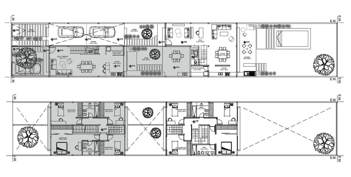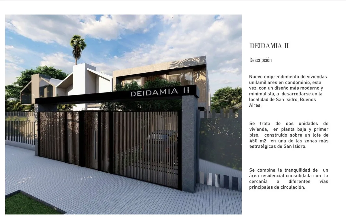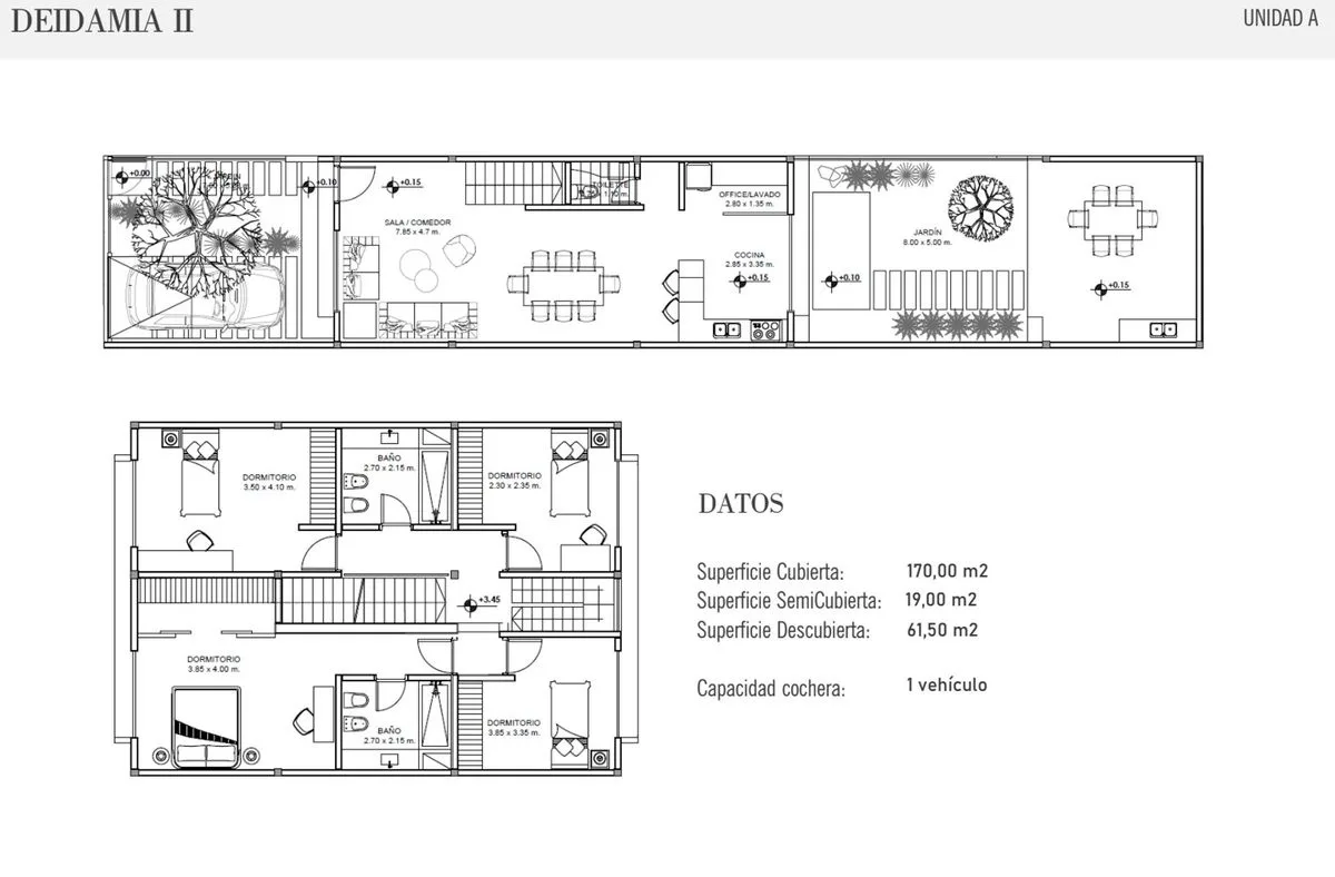 Unidade em PH (Propiedad Horizontal) em dois níveis, com 170 m² cobertos, 19 m² semicobertos e 61 m² entre jardim, pátio e entrada. Há quatro dormitórios na cobertura, incluindo 1 suíte com banheiro em suíte, além de 1 banheiro completo. No piso térreo, há living-comedor e comedor integrados, cozinha completa, escritório/lavanderia integrados e lavabo, com acesso por portão veicular automático e vaga de garagem privada. O imóvel tem sistema de alarme (instalação) e pré-instalação para ar-condici