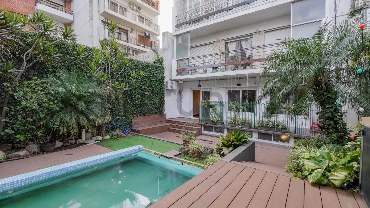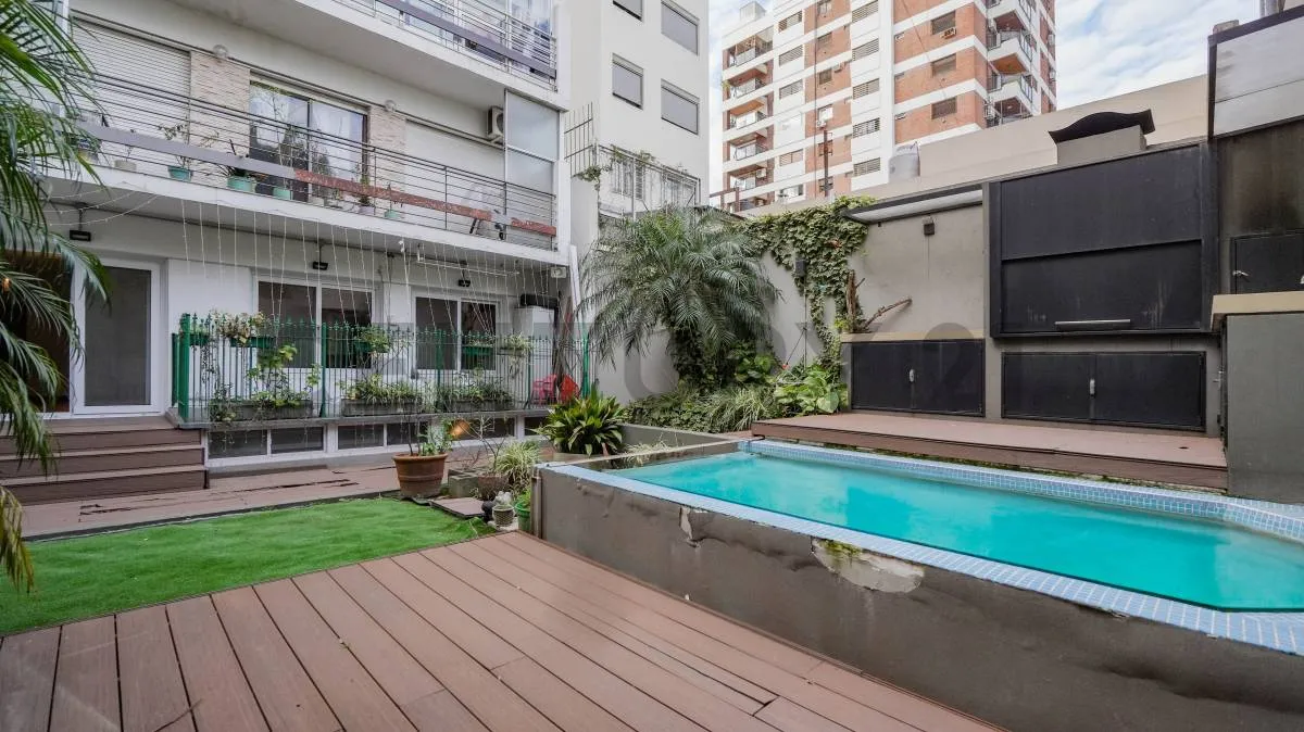 Apartamento térreo em Caballito, com pátio, churrasqueira e piscina. A unidade fica no térreo de um edifício na Calle Hualfin 1000. Inclui hall de recepção, amplo cômodo com banheiro completo (pode ser usado como dormitório ou escritório), cozinha totalmente reformada e lavabo moderno. O living dá acesso ao pátio com churrasqueira e piscina, além de um pátio interno de uso exclusivo. No subsolo ficam 3 quartos: duas unidades com ventilação para o exterior e blackout elétricos, e um quarto princi