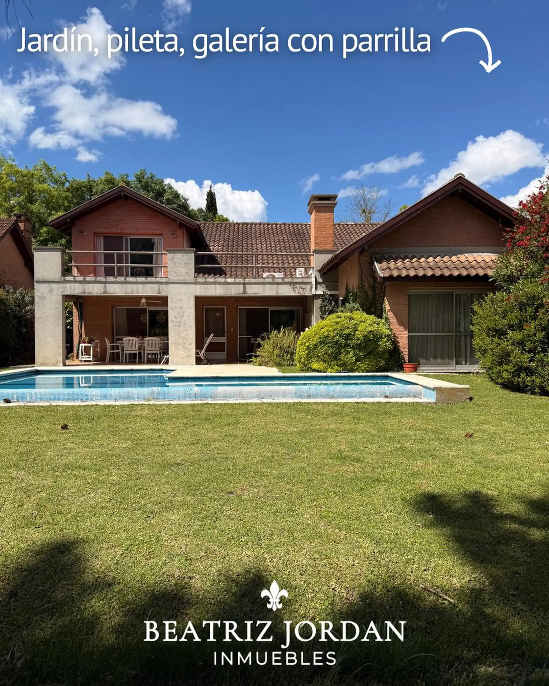 Casa de 6 ambientes para alugar no Country Club Los Cardales, em Campana. São 700 m² totais, 319 m² cobertos e 381 m² descobertos. Possui 4 dormitórios, 5 banheiros no total (4 banheiros completos e 1 lavabo). Na planta térrea há sala de jantar e estar, cozinha com copa, lavabo, dependência de serviço com banheiro, lavanderia independente, galeria com área de churrasco e forno a lenha, jardim com paisagismo, piscina e vista para o campo de golfe, além de vaga descoberta para 3 carros e 1 depósit