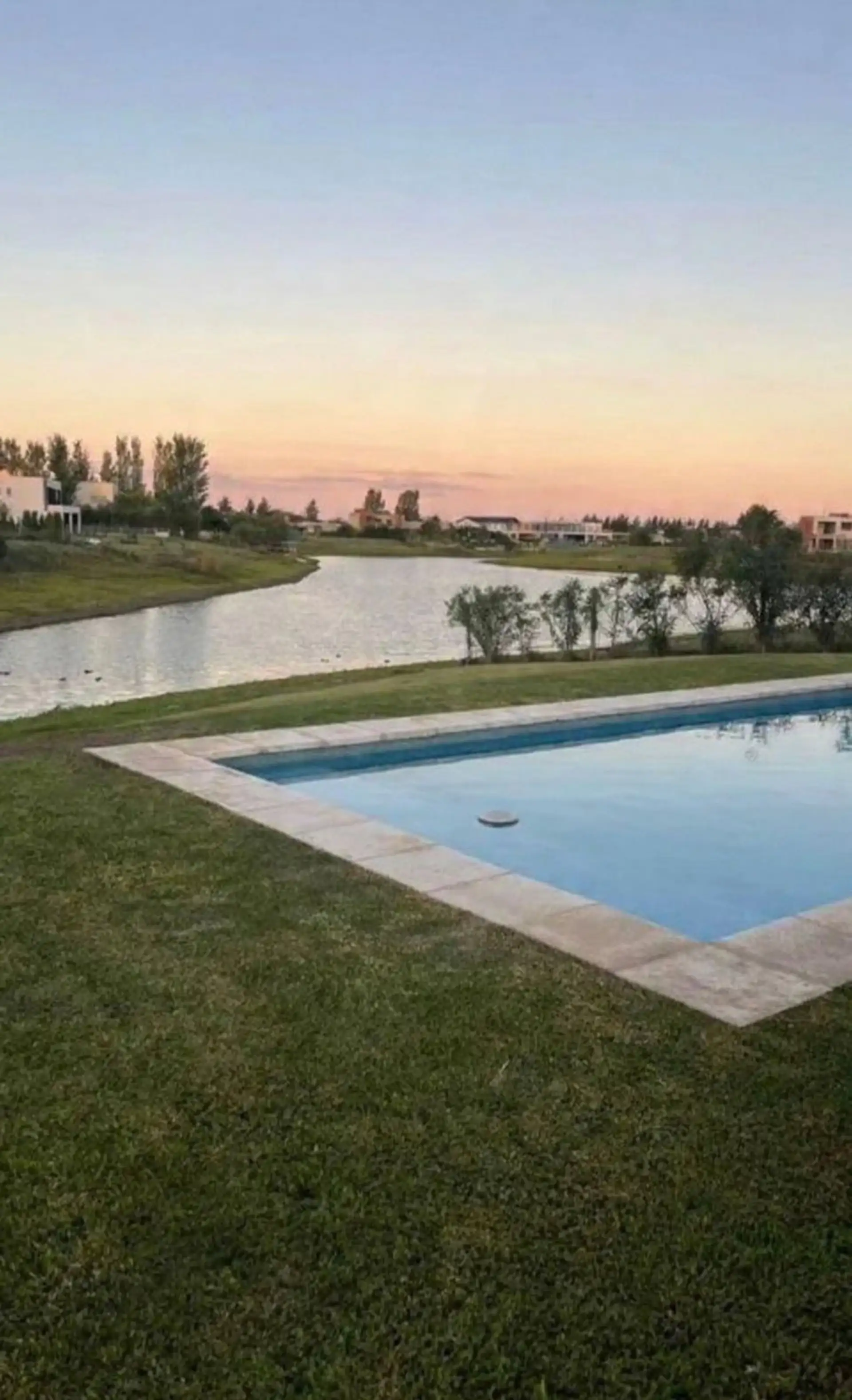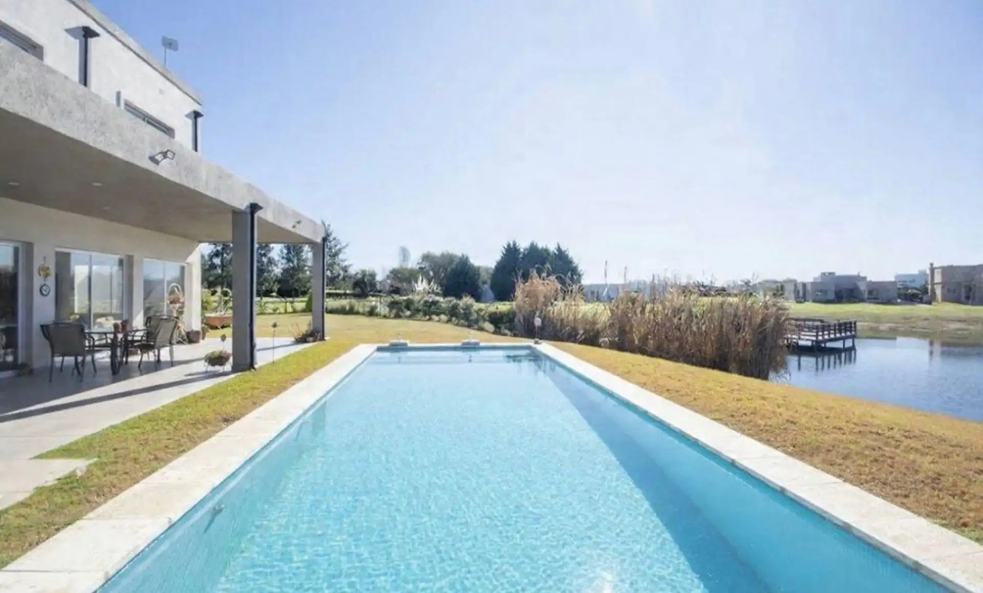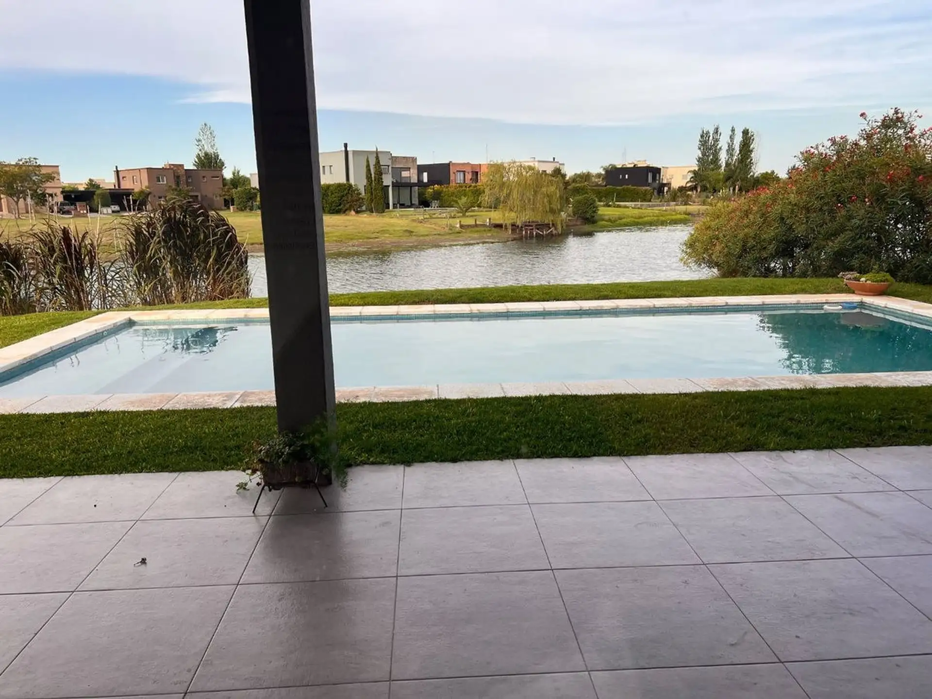 Casa para aluguel anual em San Matías, Escobar, com 5 ambientes e frente para a laguna. Há piscina com vista para a laguna e galeria coberta com área de churrasco, além de parque com sistema de irrigação e área externa com espaço para 6 carros. Na planta baixa, tem living com sala de jantar, cozinha semi integrada com ilha e lavabo de recepção com depósito, além de suíte para hóspedes ou escritório, banheiro externo e área de lavanderia com entrada independente. Na planta alta, há escritório abe