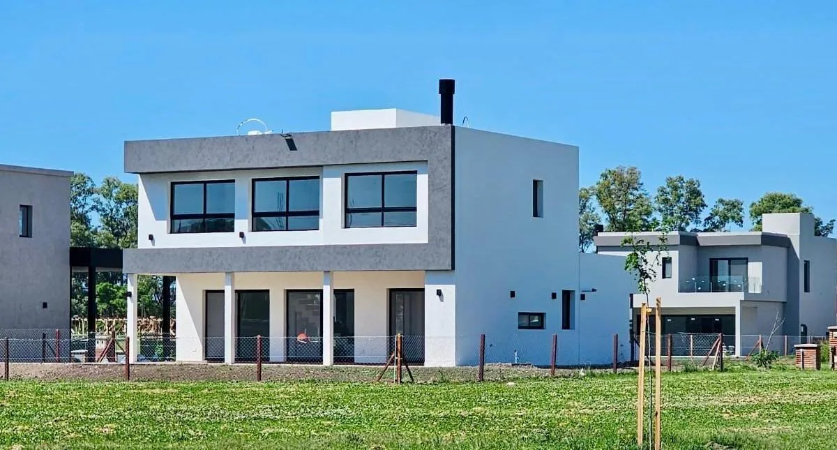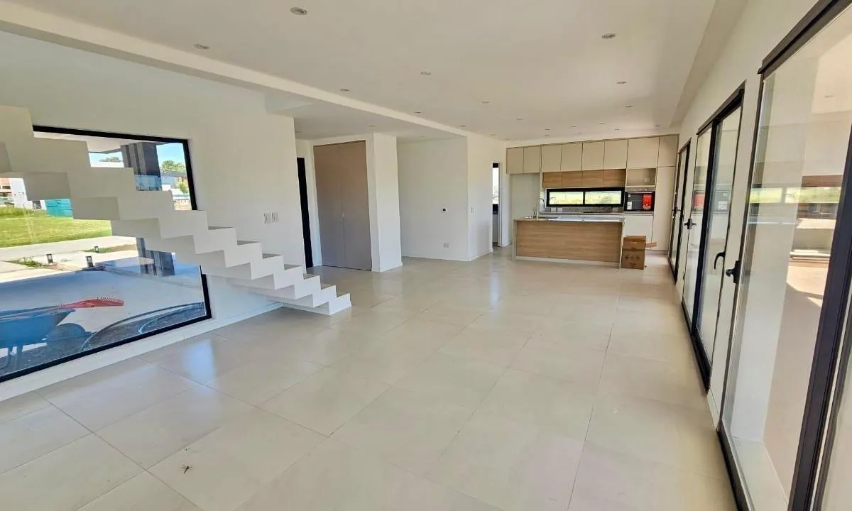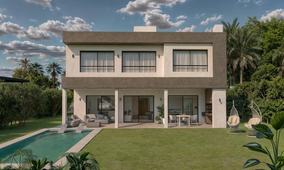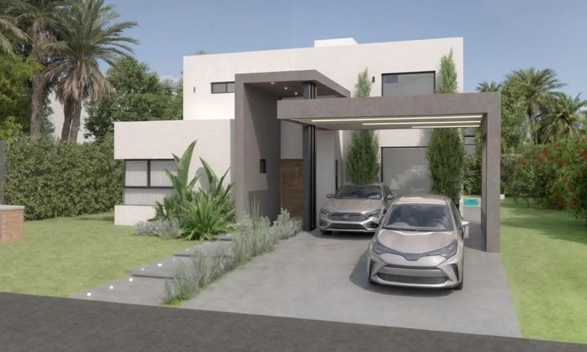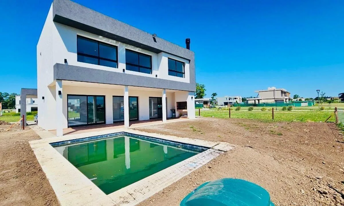 Casa de 234 m² em dois andares em Canning Chico, Esteban Echeverría, com piscina. A entrega está prevista para 2 meses. No térreo, há porch de entrada com pé-direito duplo, hall de recepção, living e jantar integrados à cozinha, lavabo, cozinha mobiliada com ilha central, área de refeições diárias integrada, churrasqueira com fechamento em aço, lavanderia interna mobiliada e banheiro completo em um dormitório, além de porta lateral para o exterior. No andar superior, há escada de conceito aberto
