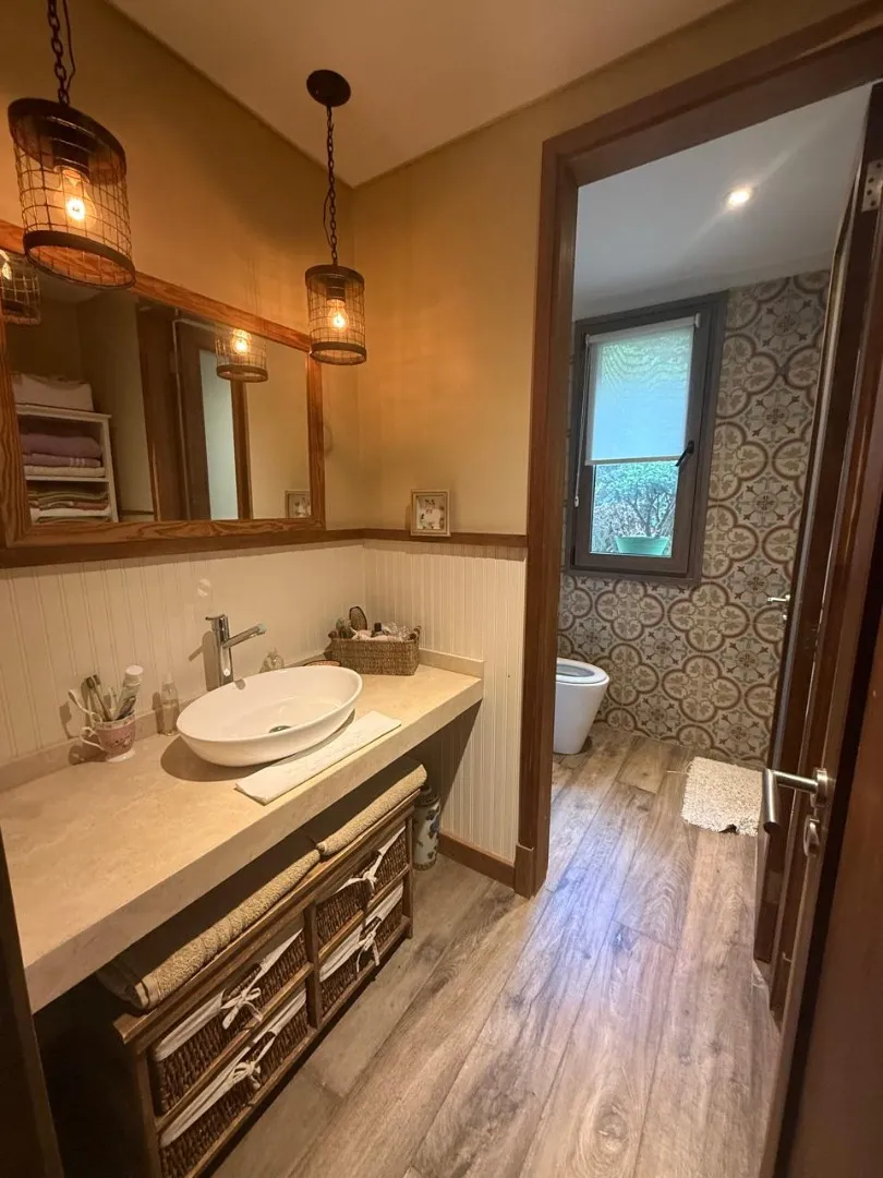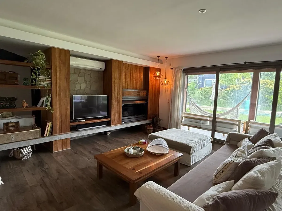 Casa em Terravista com construção artesanal, 8 anos de antigüidade. São 400 m² cobertos, em frente à praça “El caracol”. No térreo há living com lareira a lenha, cozinha e área de refeições com móveis completos, lavanderia, 1 dormitório de hóspedes, banheiro completo e lavabo, além de sala de jogos com projeção de cinema e grande galeria com churrasqueira, forno a lenha e fogão/“anafes”, incluindo banheiro completo no setor dos fundos. A área externa tem piscina aquecida com deck e solarium. Há