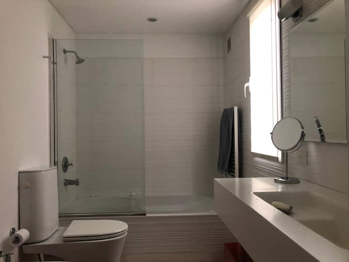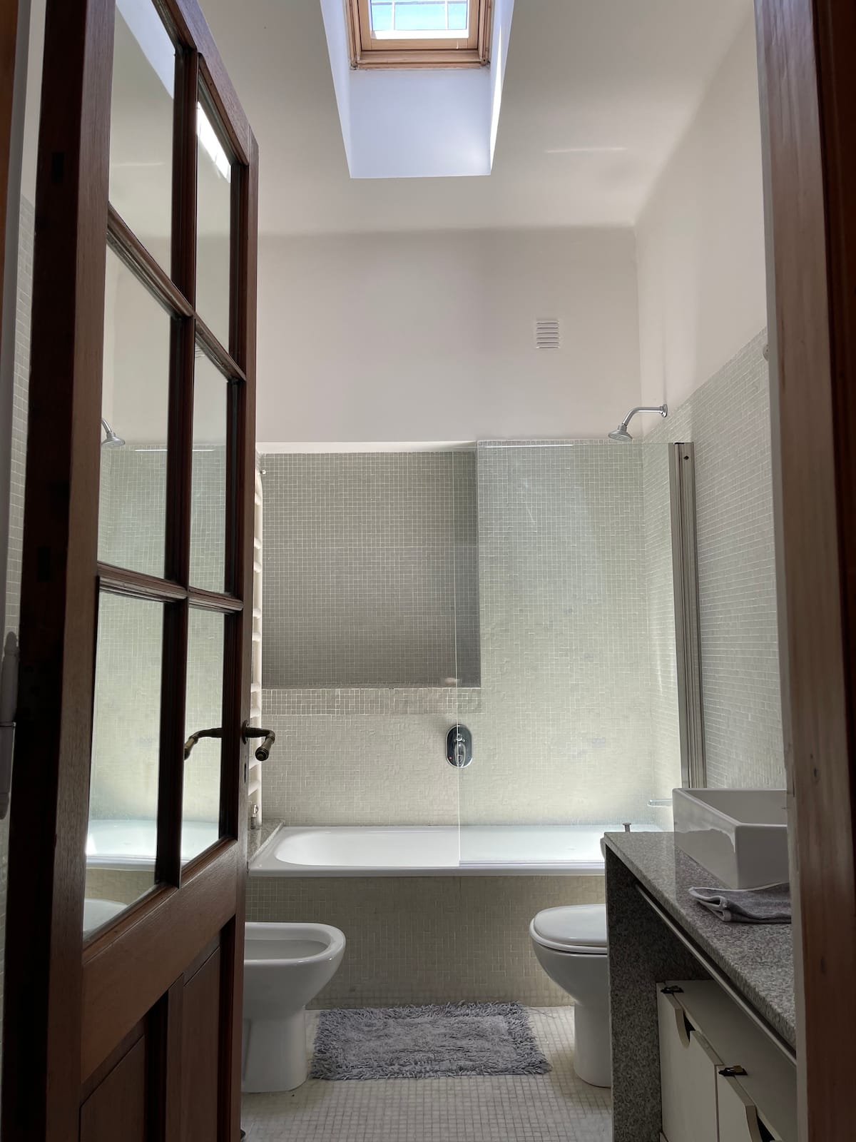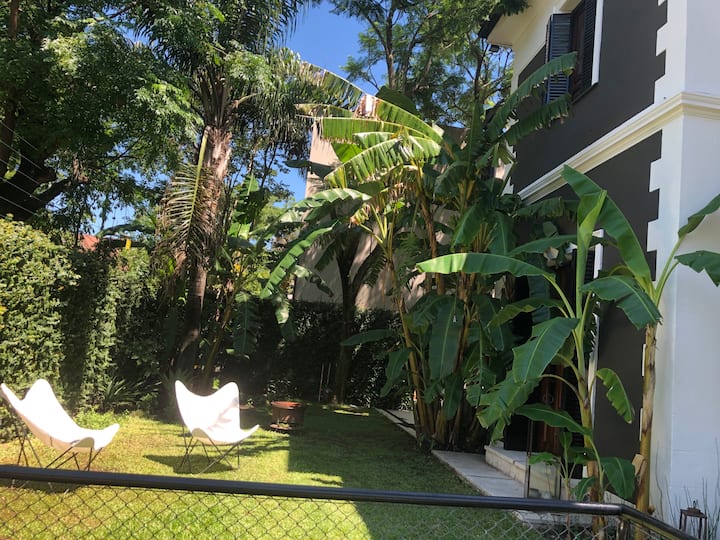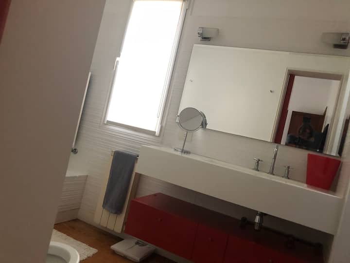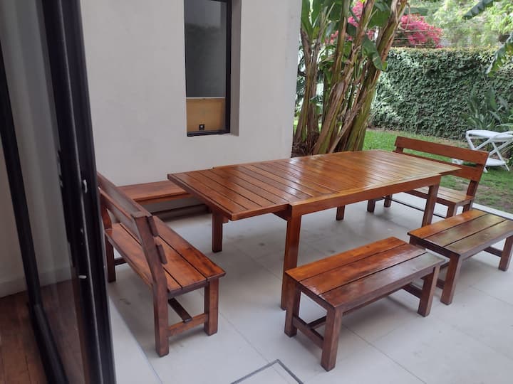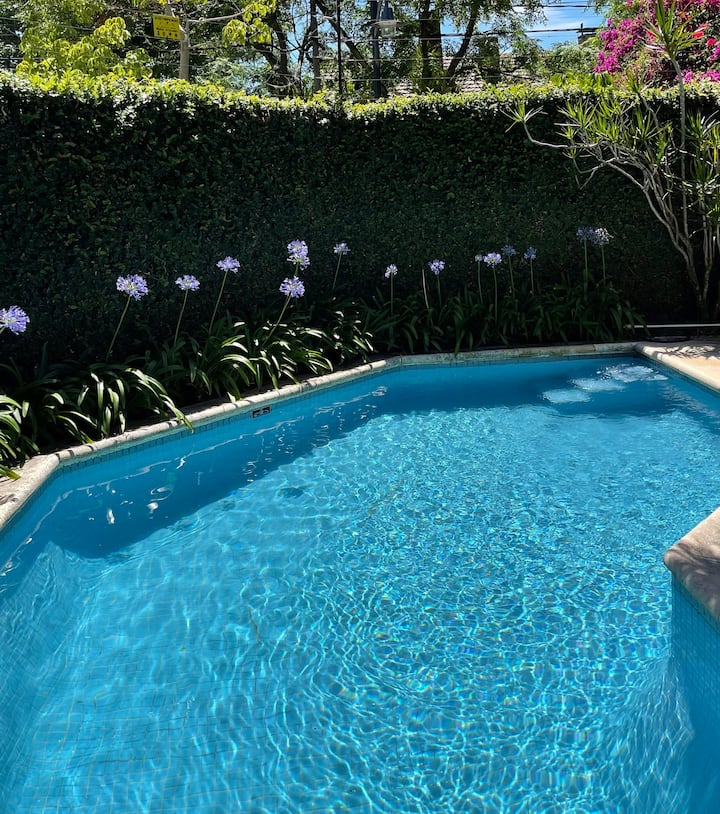 Casa com extensão moderna em Martínez, com piscina, jardim e área de churrasco. A casa tem 4 quartos no total, com 2 suítes e 2 quartos que compartilham um banheiro completo. No térreo ficam a sala de estar, sala de jantar e uma mesa de recepção, além de área de lavanderia; todas as janelas têm proteção contra insetos e há aquecimento por radiadores ou ventiladores de teto.
