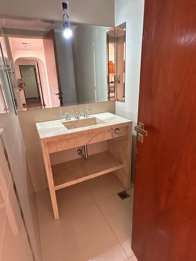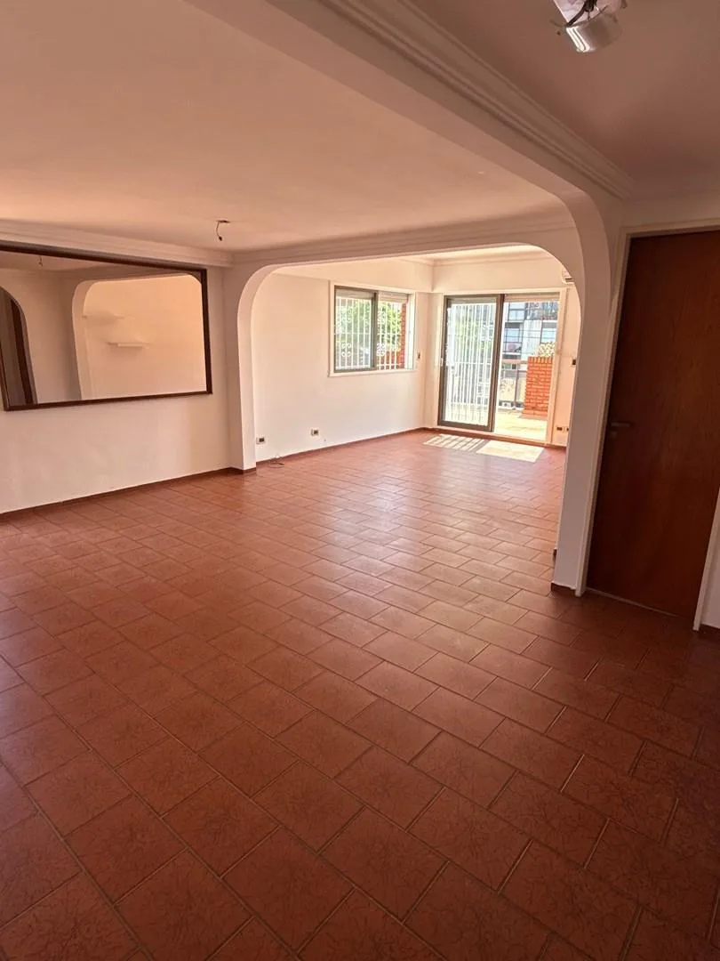 Apartamento de meio andar com 285 m² totais, no 1° andar, com vista para o noroeste. Conta com varanda-terraço e churrasqueira em área coberta (quincho), além de pátio de 25 m² e terraço de 120 m². Possui 120 m² cobertos, sala de estar e jantar com grandes janelas, ar-condicionado, cozinha integrada com fogão a gás, lavanderia interna independente com saída para o pátio e termoacumulador elétrico. Há 4 dormitórios (suíte no dormitório principal e no quarto dormitório), banheiro de recepção e ban