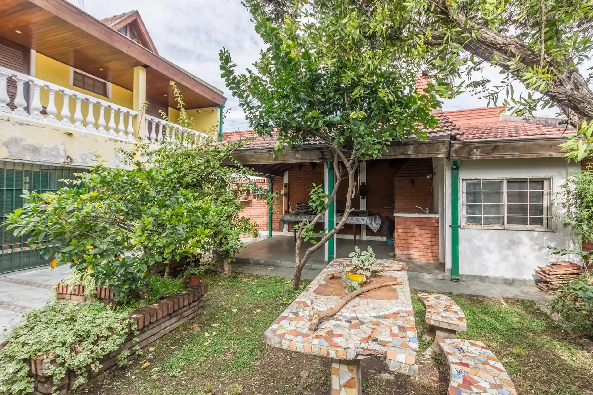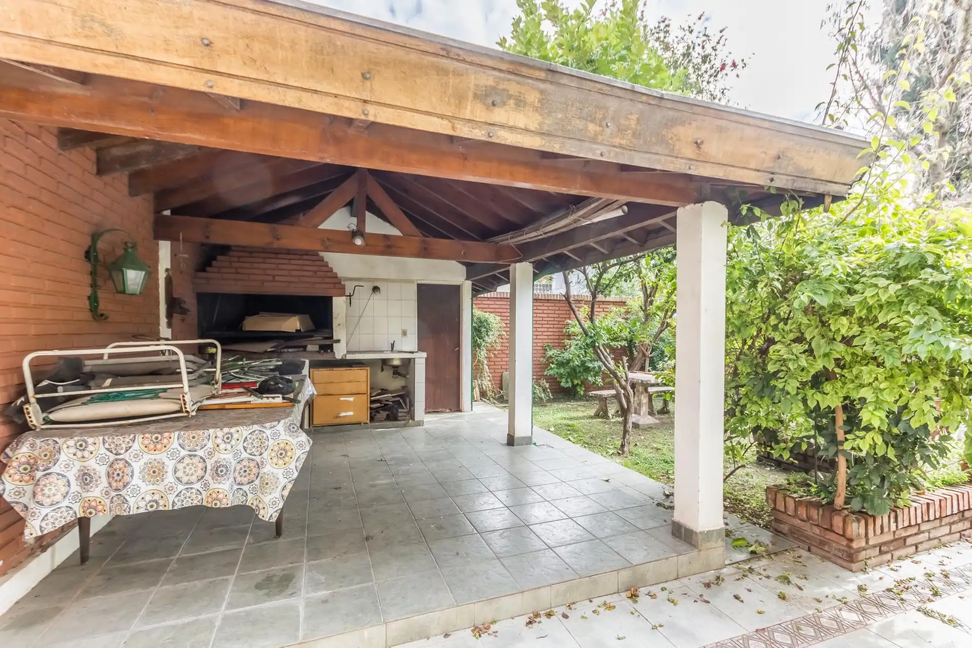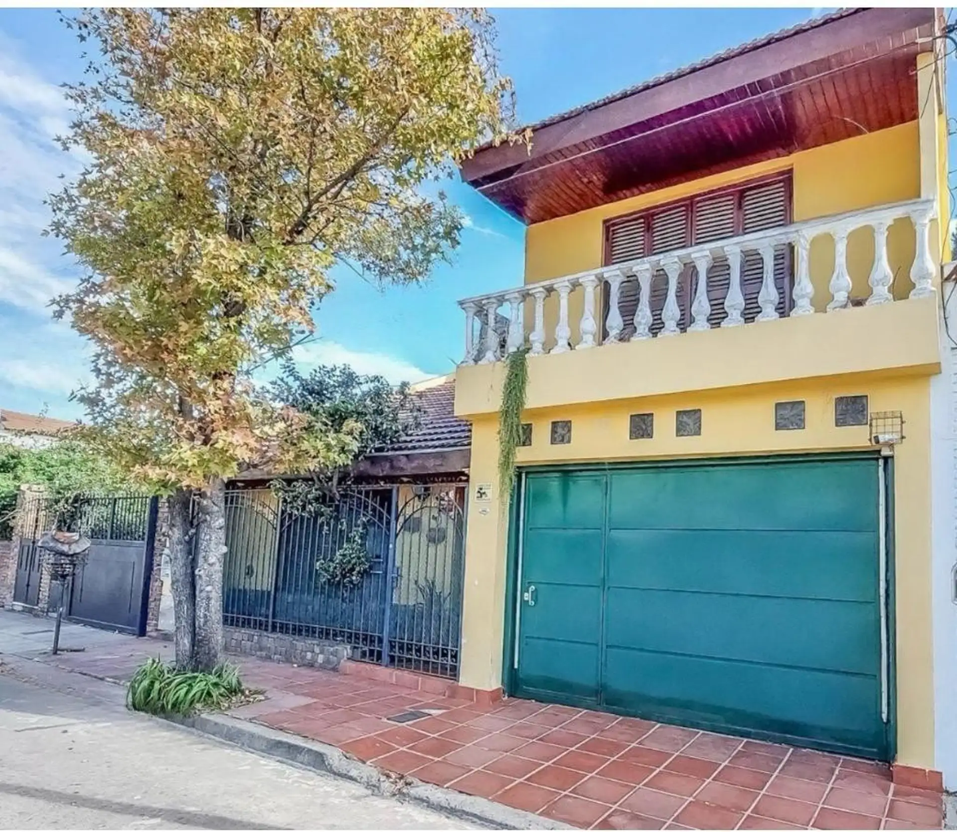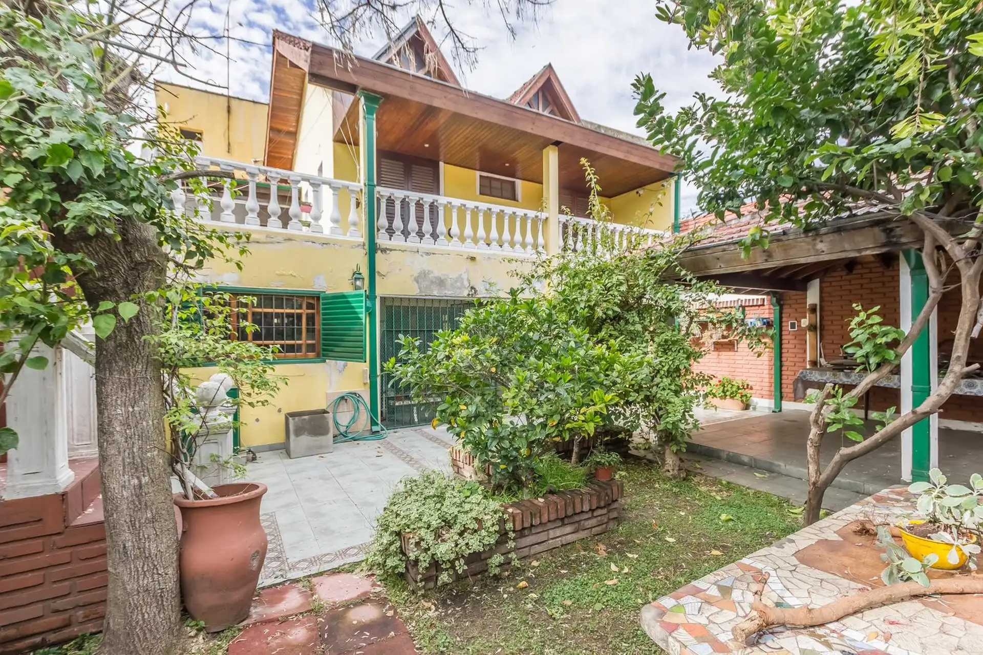 Casa para aluguel em Castelar Sur, Morón, com 5 ambientes e opção de uso profissional. A propriedade tem 2 plantas. Na planta baixa: living com sala de estar, cozinha totalmente equipada com refeitório diário, garagem coberta, 1 dormitório ou escritório e 1 banheiro completo. Na planta alta: 3 dormitórios, todos com banheiro em suíte, área de serviço coberta e varanda com escada até o jardim. O imóvel inclui jardim com área de churrasco coberta e churrasqueira, além de um galpão para armazenamen