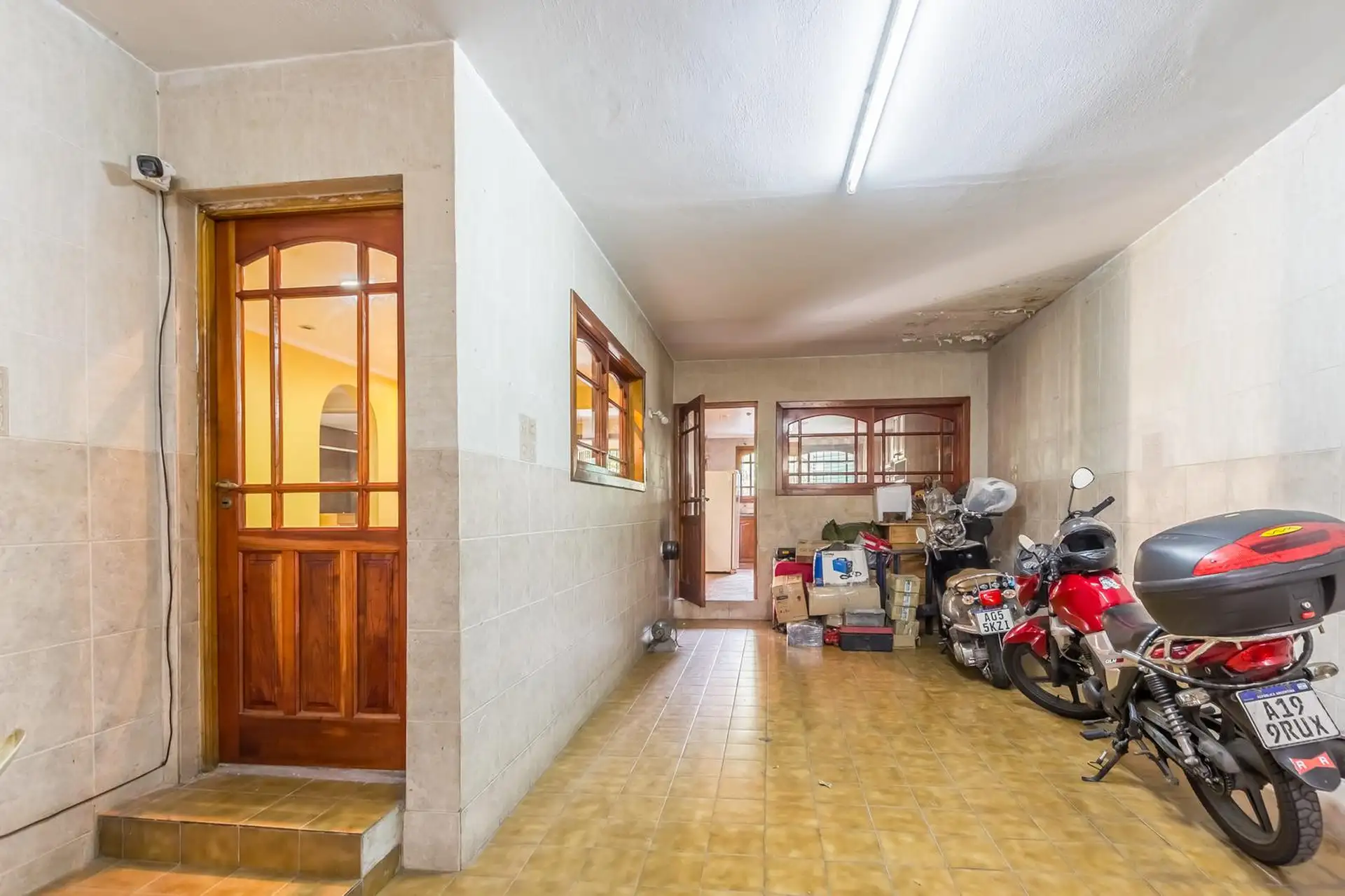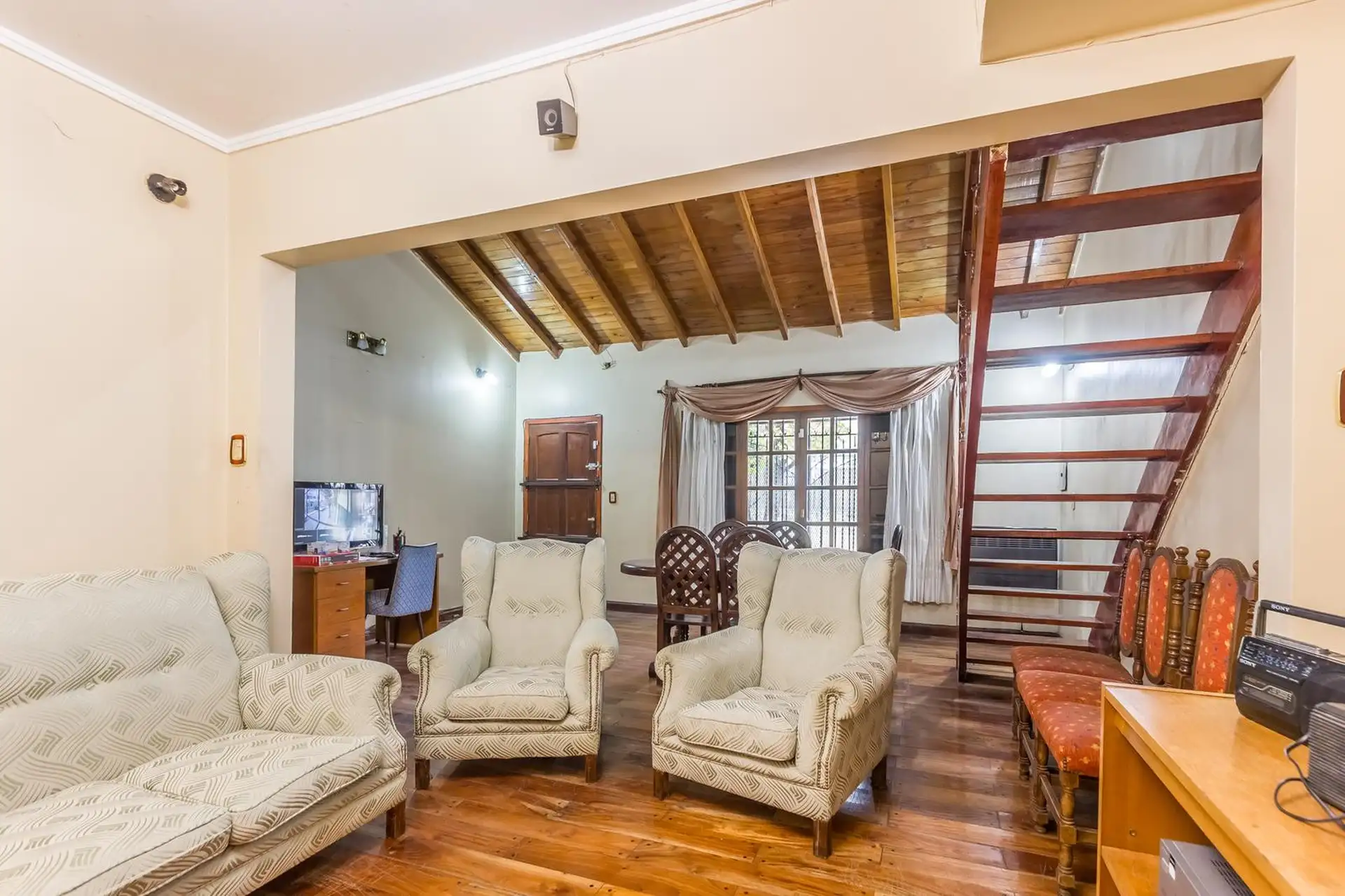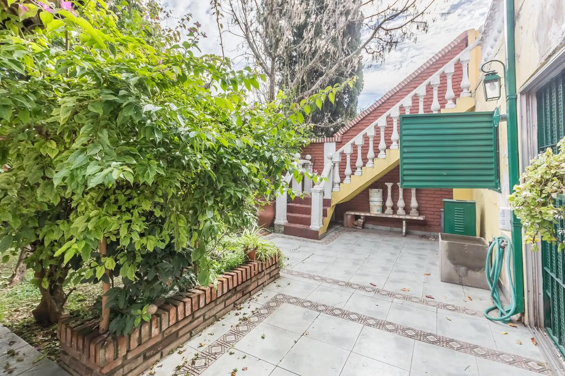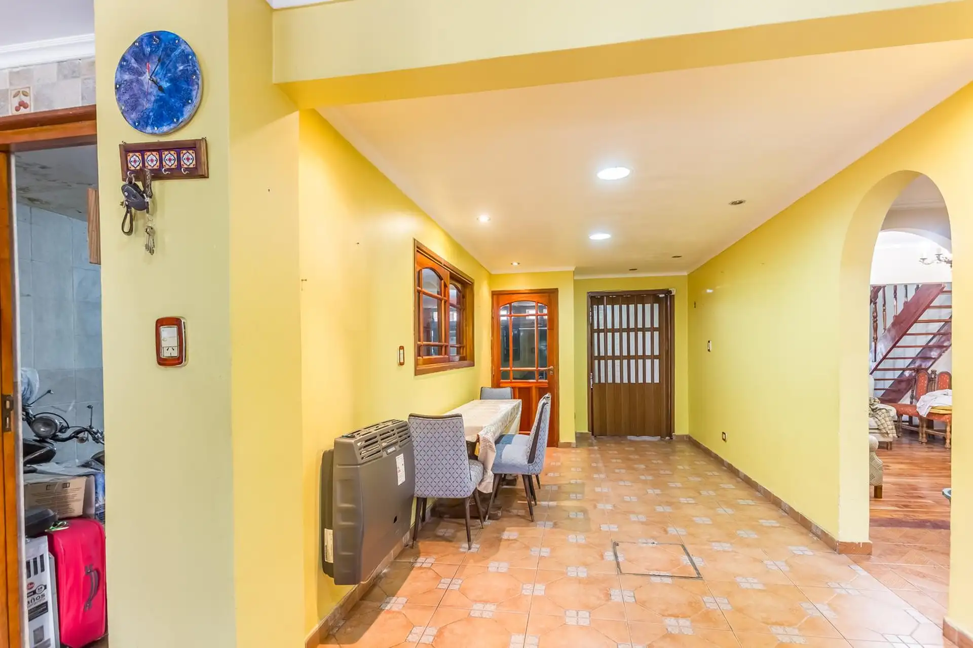 Casa para aluguel em Castelar Sur, Morón, com 5 ambientes e opção de uso profissional. A propriedade tem 2 plantas. Na planta baixa: living com sala de estar, cozinha totalmente equipada com refeitório diário, garagem coberta, 1 dormitório ou escritório e 1 banheiro completo. Na planta alta: 3 dormitórios, todos com banheiro em suíte, área de serviço coberta e varanda com escada até o jardim. O imóvel inclui jardim com área de churrasco coberta e churrasqueira, além de um galpão para armazenamen