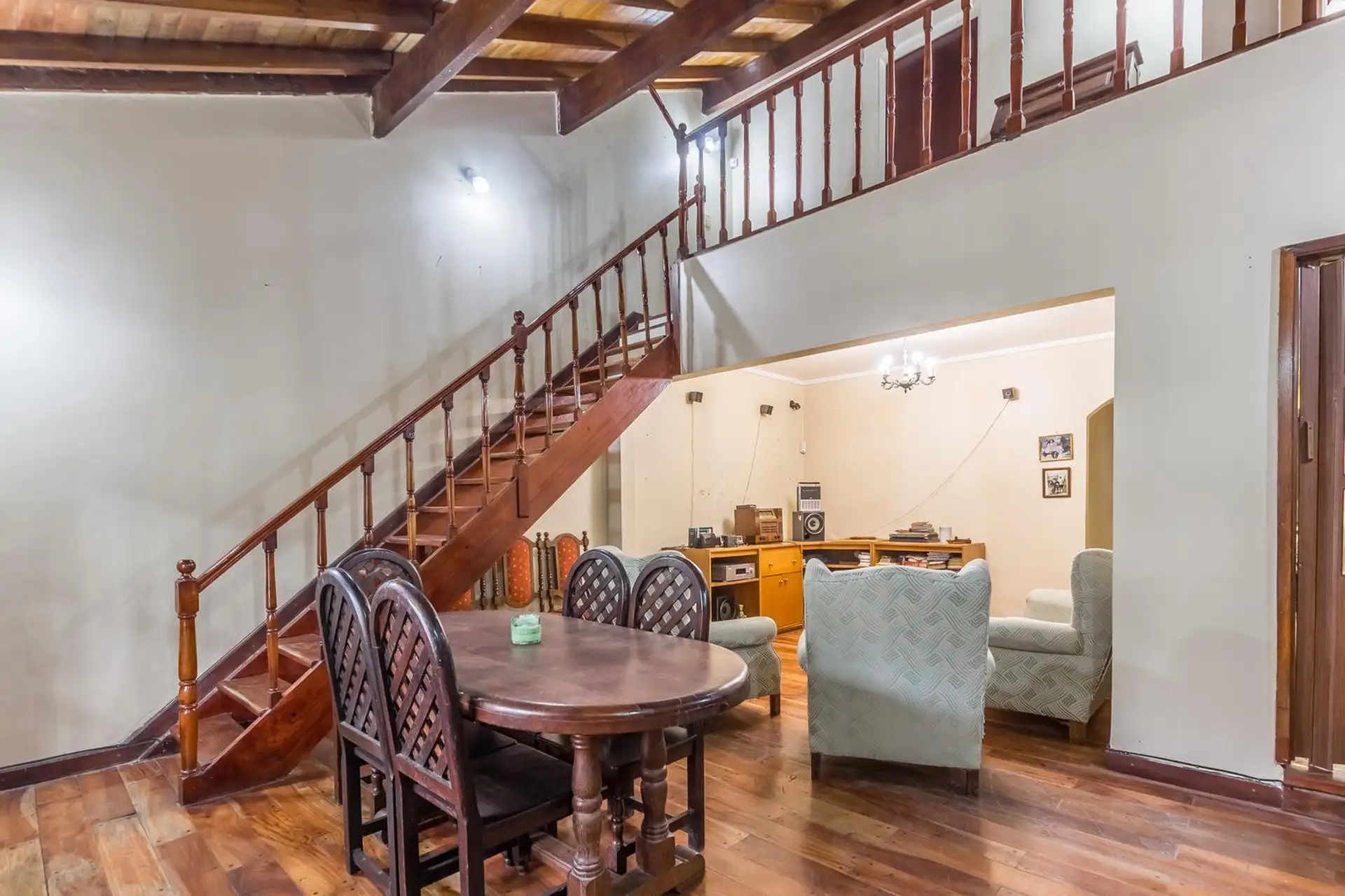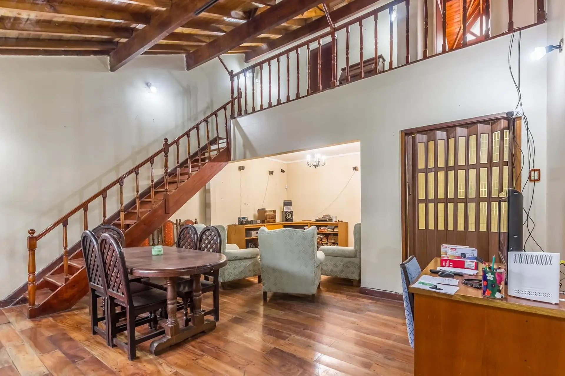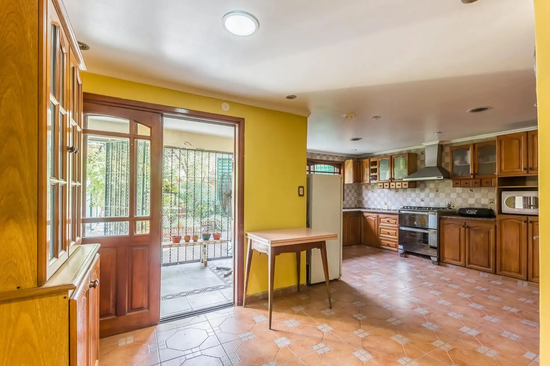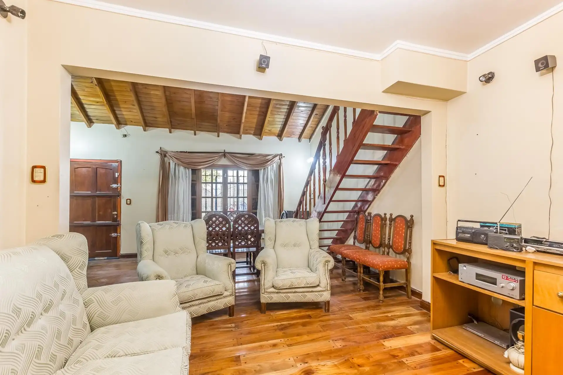 Casa para aluguel em Castelar Sur, Morón, com 5 ambientes e opção de uso profissional. A propriedade tem 2 plantas. Na planta baixa: living com sala de estar, cozinha totalmente equipada com refeitório diário, garagem coberta, 1 dormitório ou escritório e 1 banheiro completo. Na planta alta: 3 dormitórios, todos com banheiro em suíte, área de serviço coberta e varanda com escada até o jardim. O imóvel inclui jardim com área de churrasco coberta e churrasqueira, além de um galpão para armazenamen