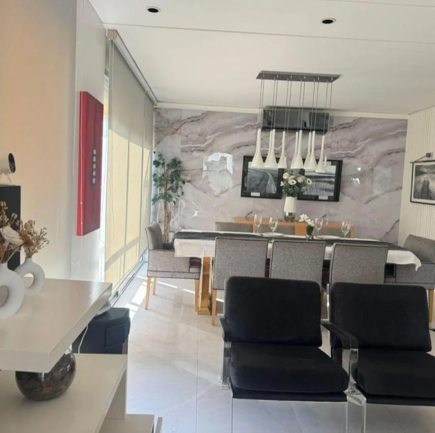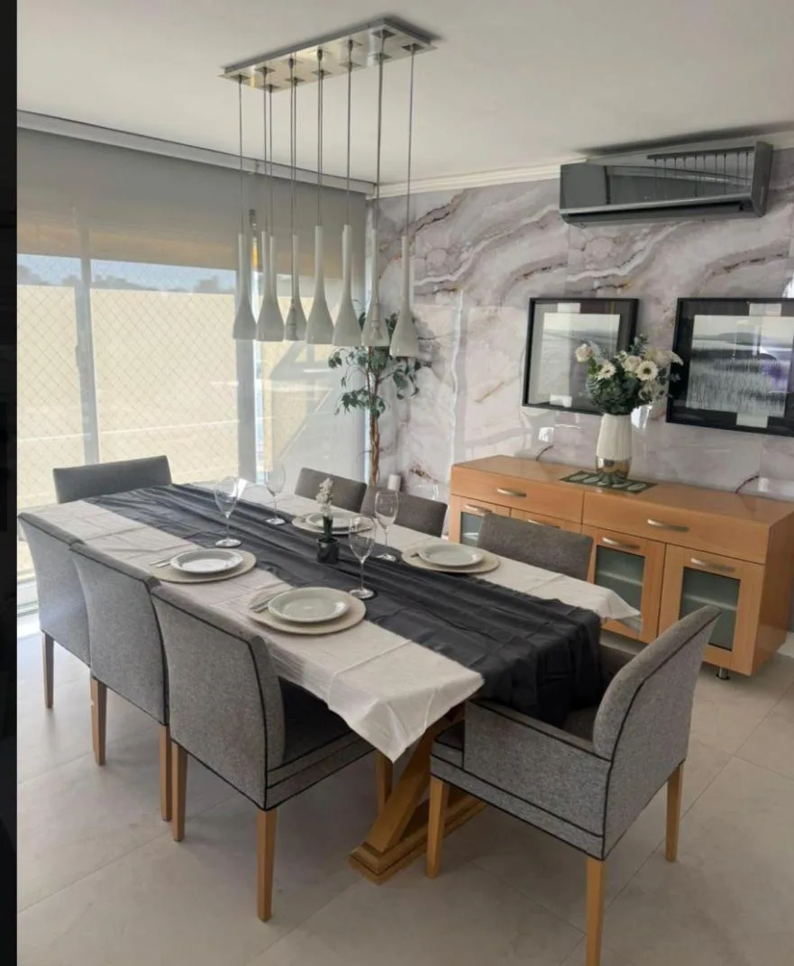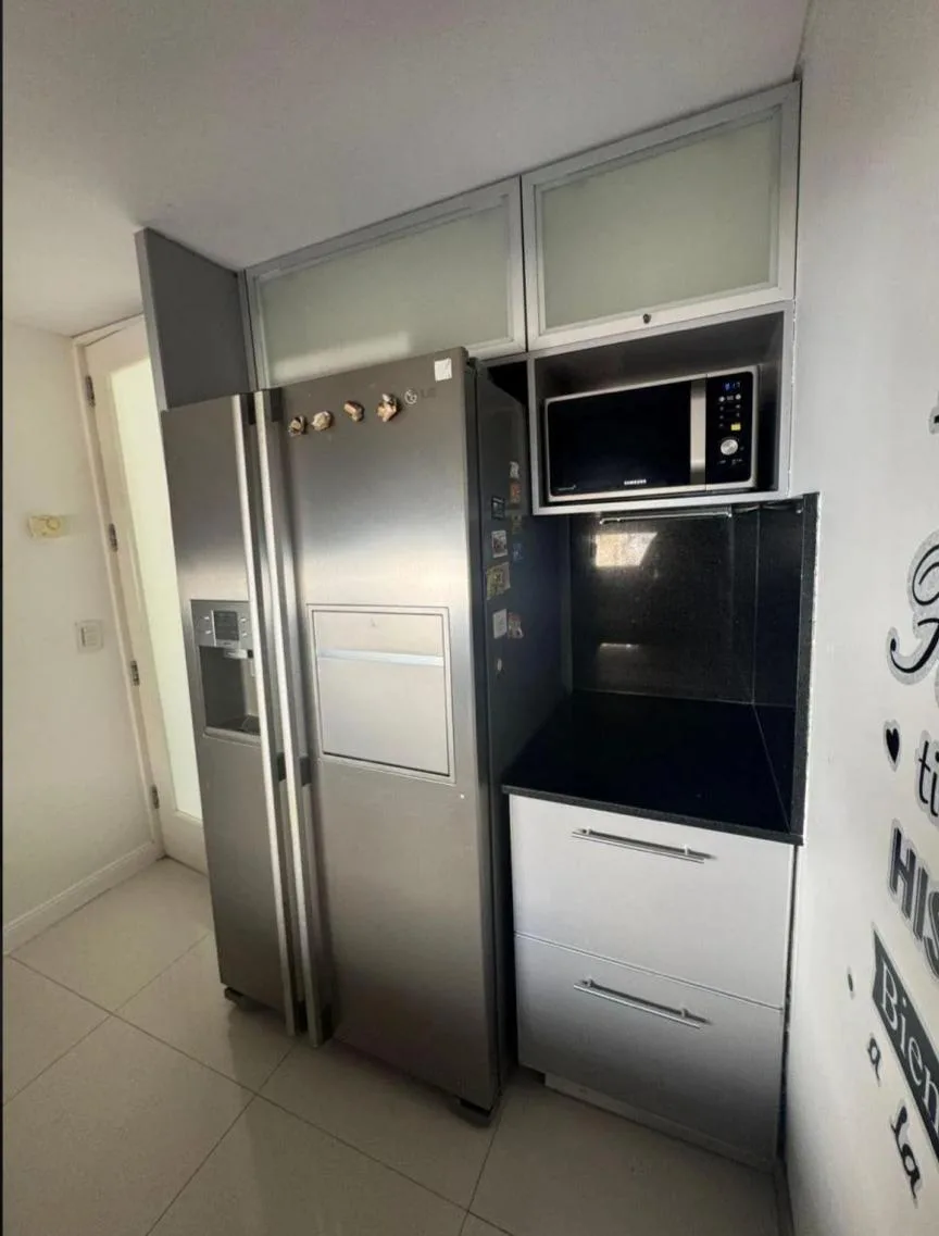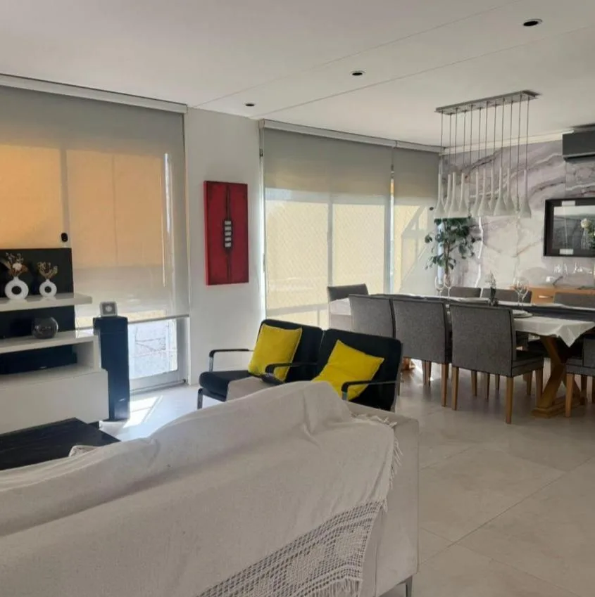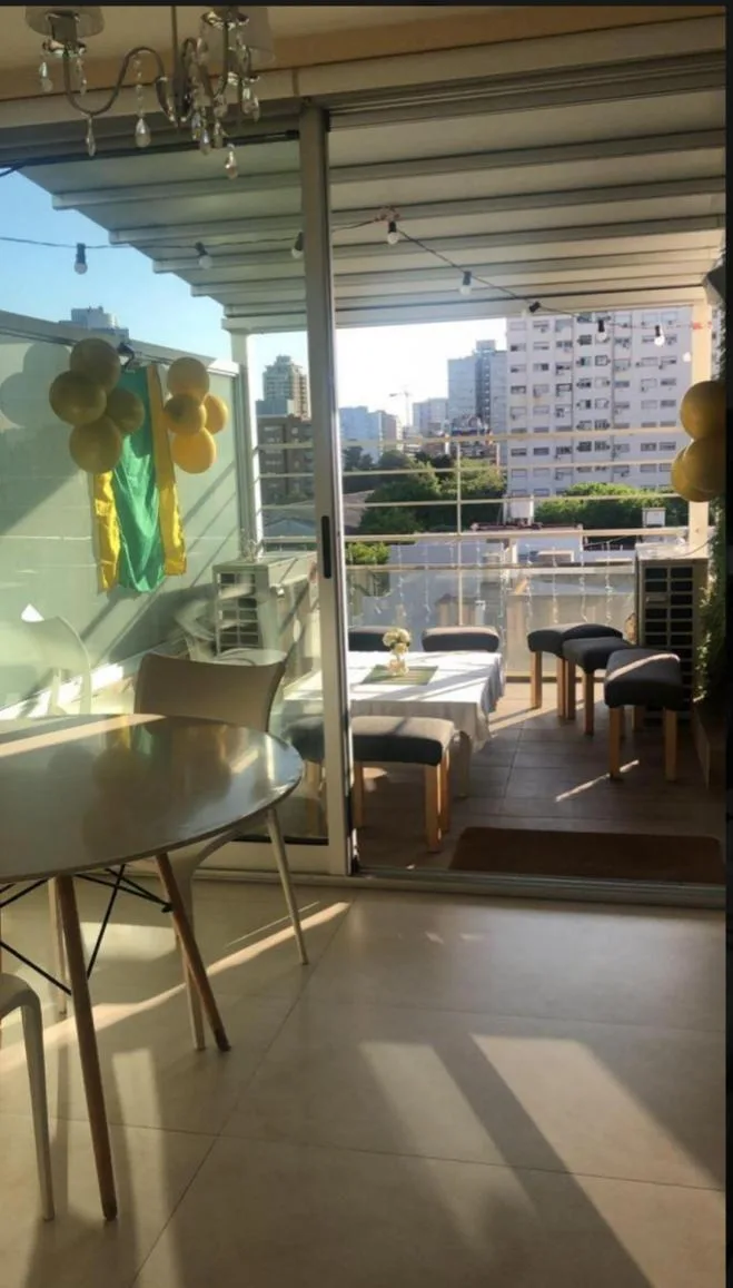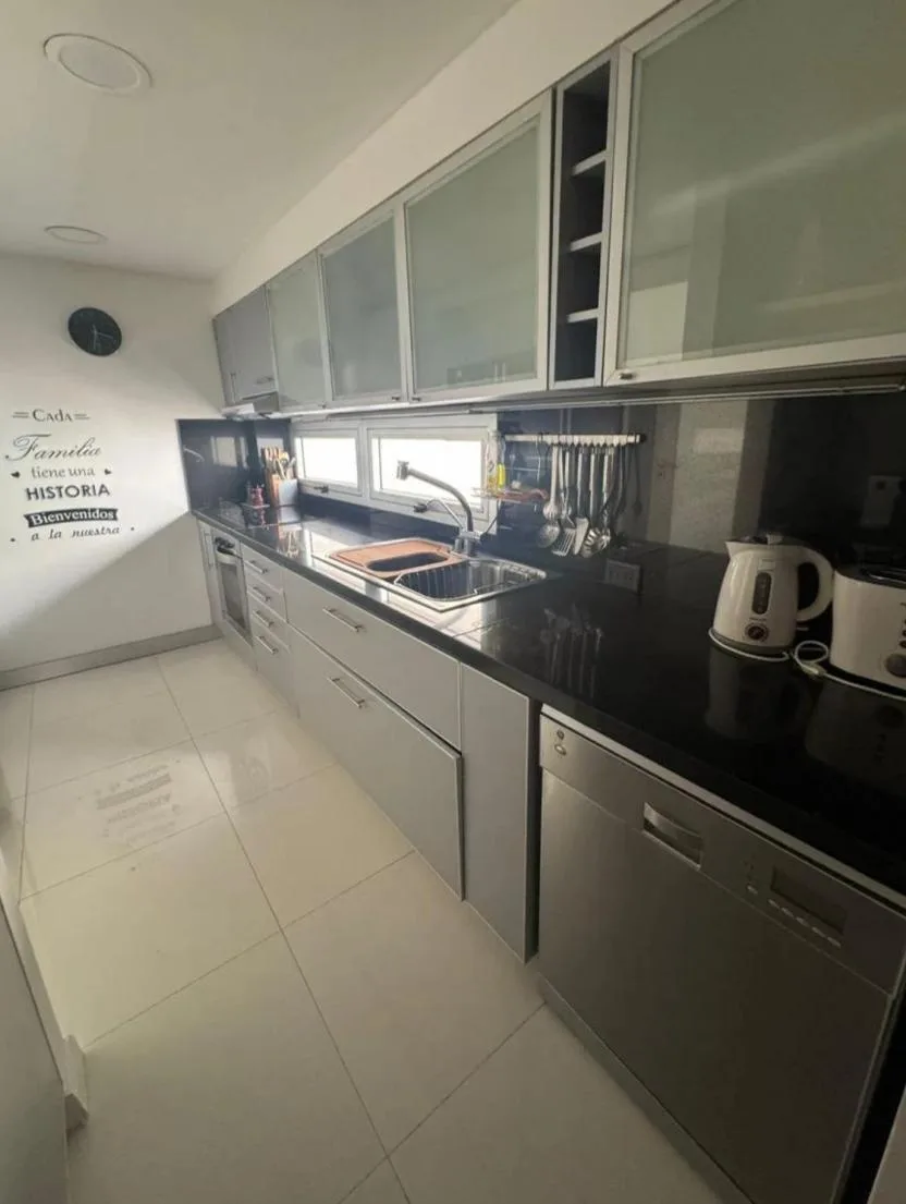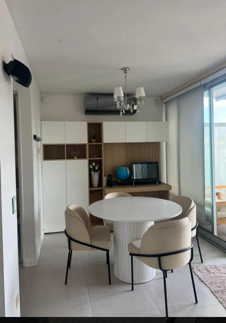 Apartamento dúplex mobiliado em Núñez, com 4 quartos e 2 andares, de frente para a rua. No piso térreo há sala de jantar com grandes janelas, área de estar com mobiliário e TV, cozinha equipada com geladeira side by side, lava-louças e micro-ondas, além de lavabo e escada com guarda-corpo de vidro. No piso superior ficam 2 dormitórios em suíte, o dormitório principal com armário completo e um espaço adicional para escritório, home office ou 3º dormitório, com ar-condicionado nos principais ambie