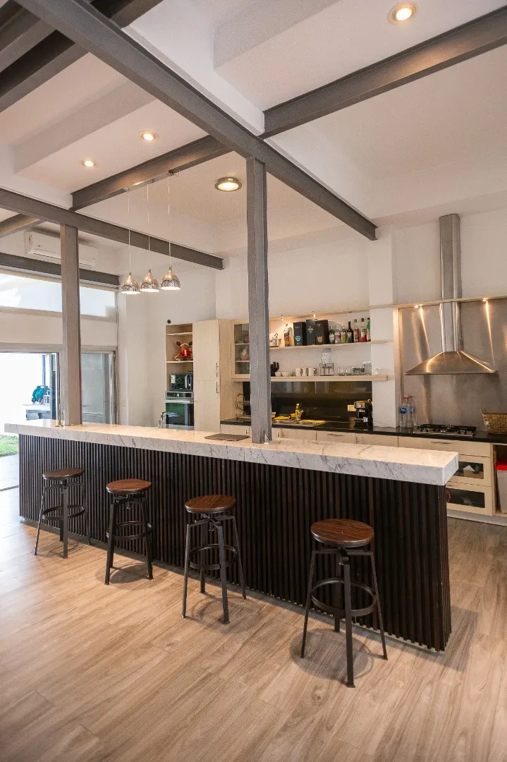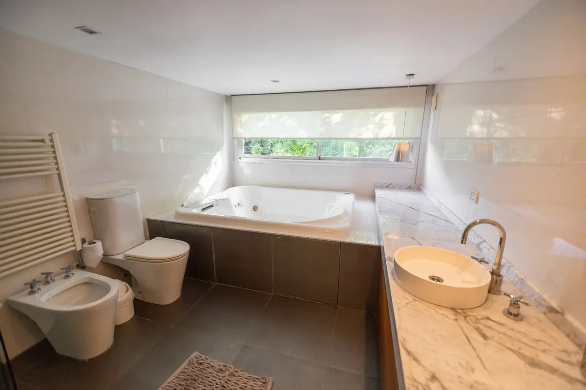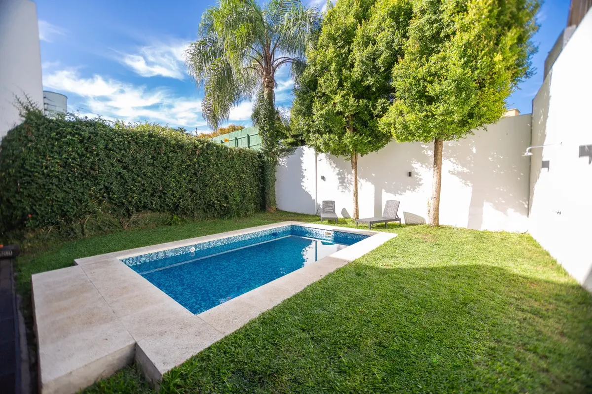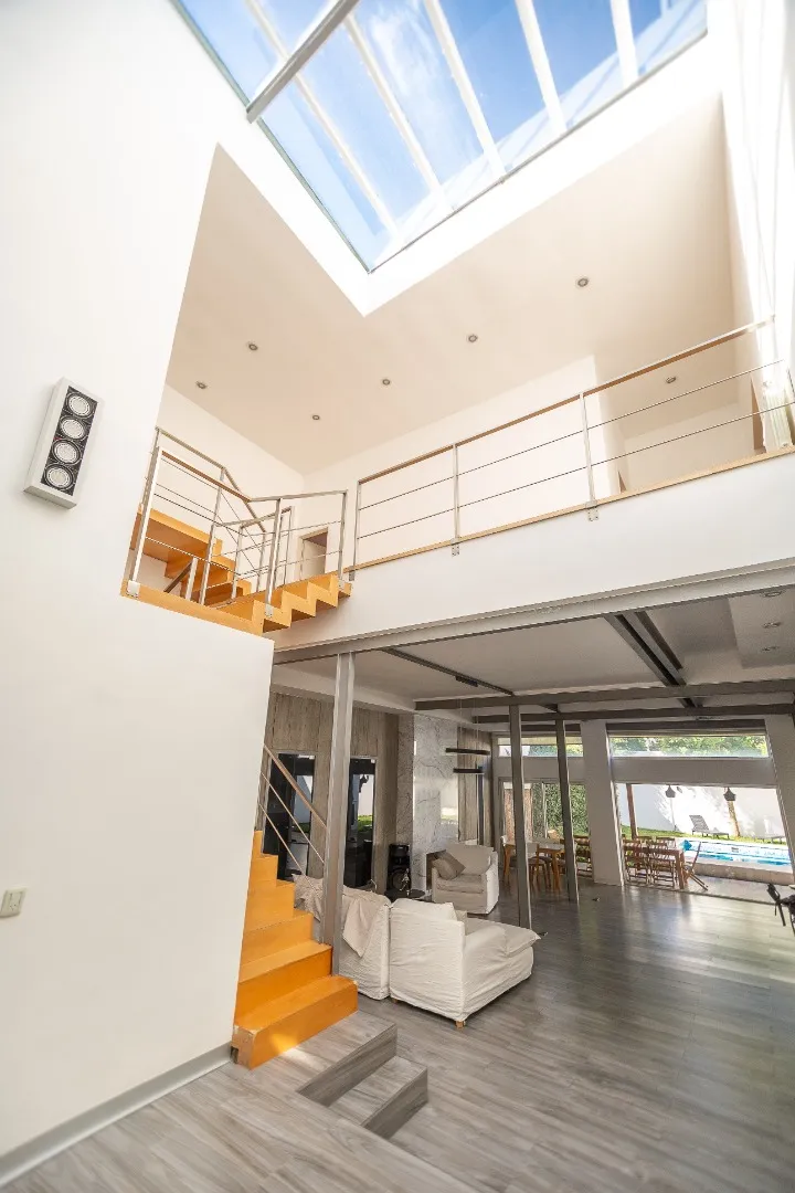 Casa moderna em Lomas de Núñez, com 4 quartos e dependência de serviço, em 3 andares. Inclui jardim, piscina e garagem coberta para 2 carros. Possui hall de entrada em pé-direito duplo, living com área para jantar e saída para galeria, cozinha com móveis planejados e bancada para café da manhã, lavabo e porão para armazenamento. No total, tem aquecimento por radiadores e ar-condicionado em diferentes ambientes; a casa foi construída há 15 anos e reformada em 2018.