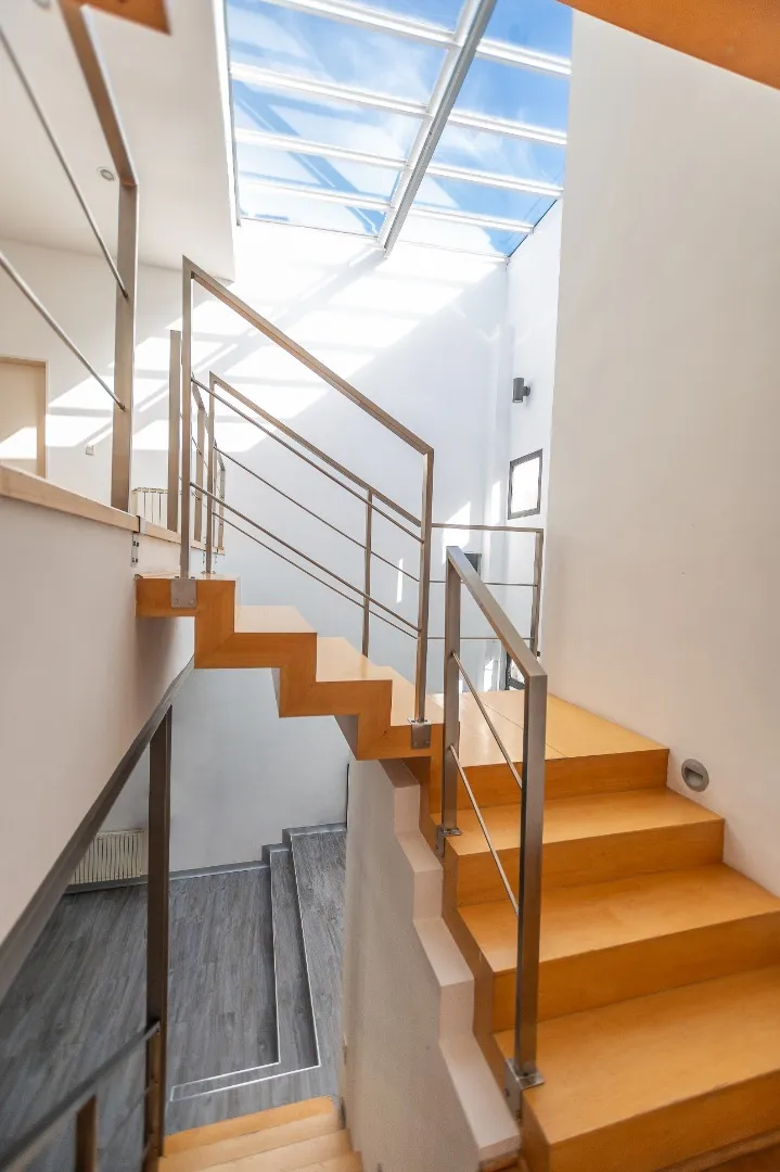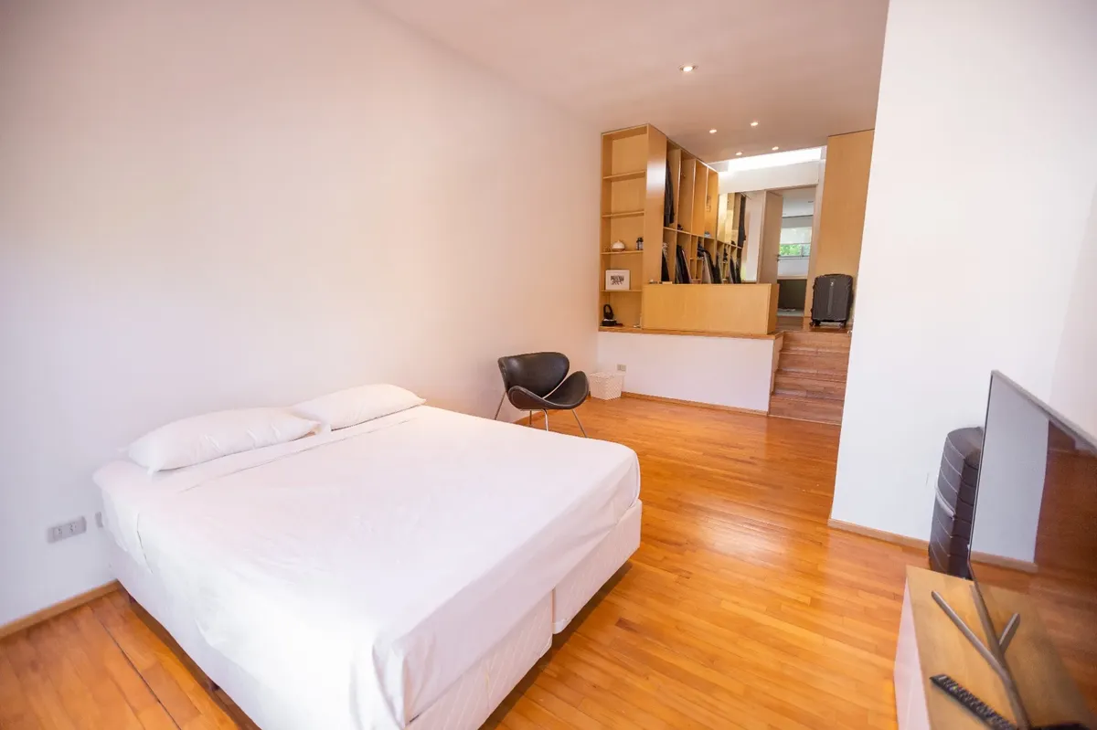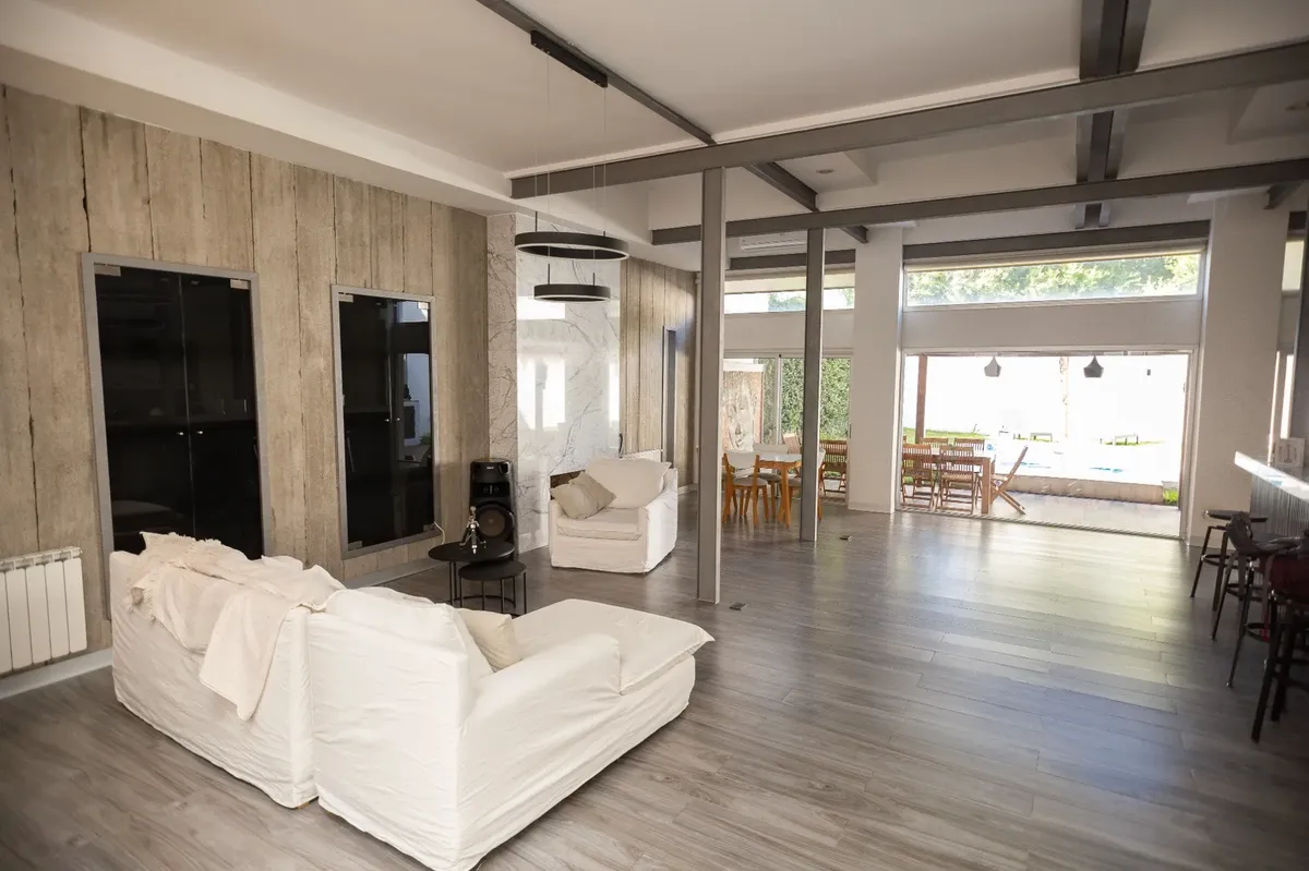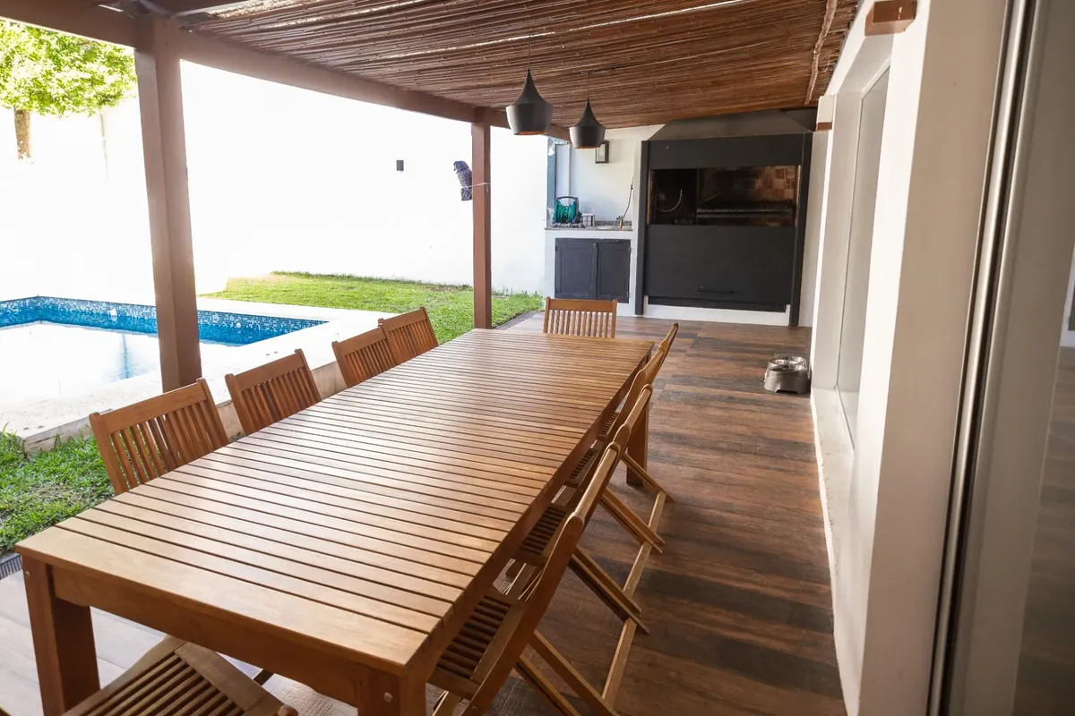 Casa moderna em Lomas de Núñez, com 4 quartos e dependência de serviço, em 3 andares. Inclui jardim, piscina e garagem coberta para 2 carros. Possui hall de entrada em pé-direito duplo, living com área para jantar e saída para galeria, cozinha com móveis planejados e bancada para café da manhã, lavabo e porão para armazenamento. No total, tem aquecimento por radiadores e ar-condicionado em diferentes ambientes; a casa foi construída há 15 anos e reformada em 2018.