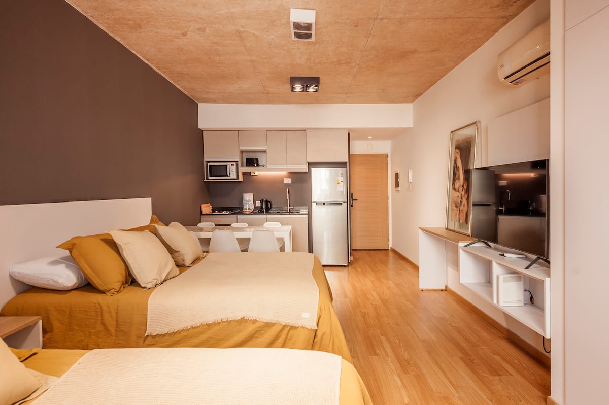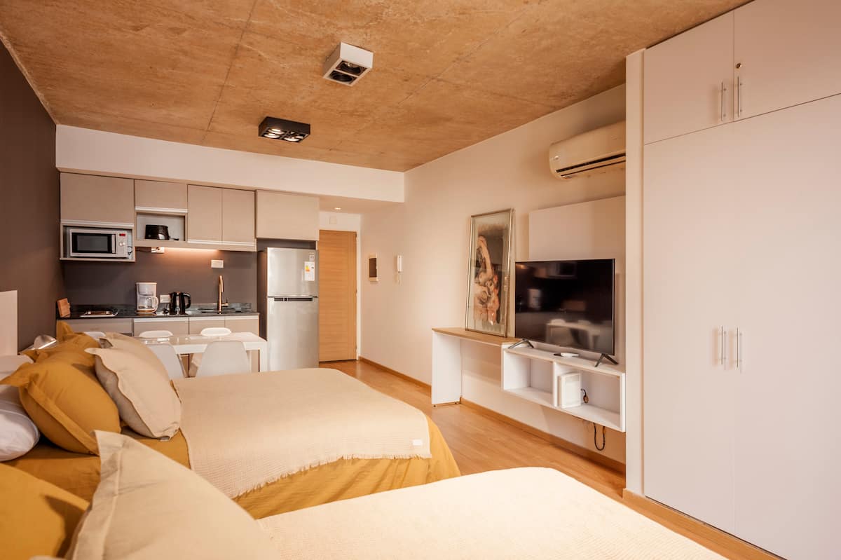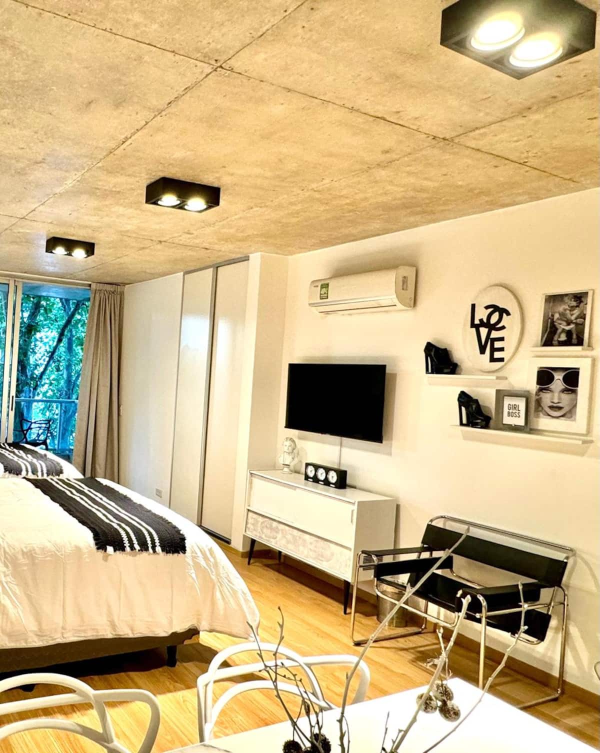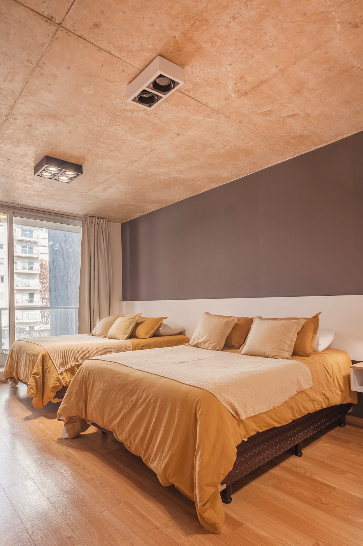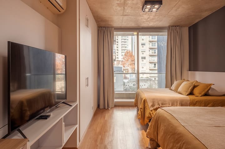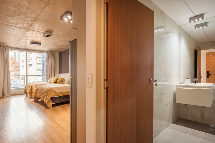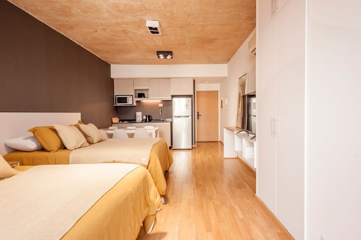 A propriedade reúne 4 apartamentos no mesmo prédio, em Palermo Hollywood. Fica a 3 quadras do Distrito de Arcos e a 200 metros do Arcos Sanatorio. Há acesso autônomo por códigos, com registro 24 horas e entrada sem chave, mediante geração de chave digital por aplicativo. A acomodação inclui toalhas e lençóis; há termoss ecológicos no apartamento.
