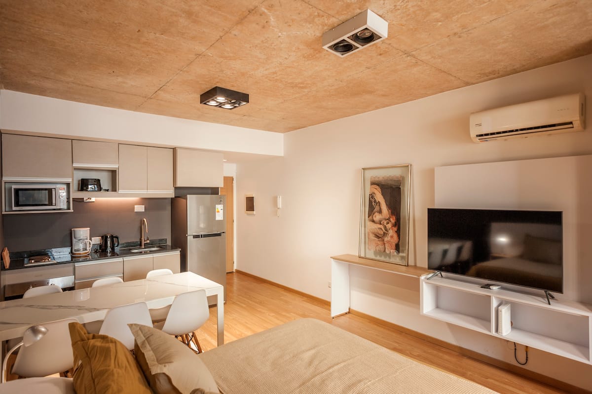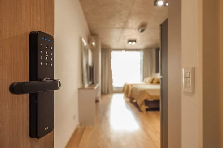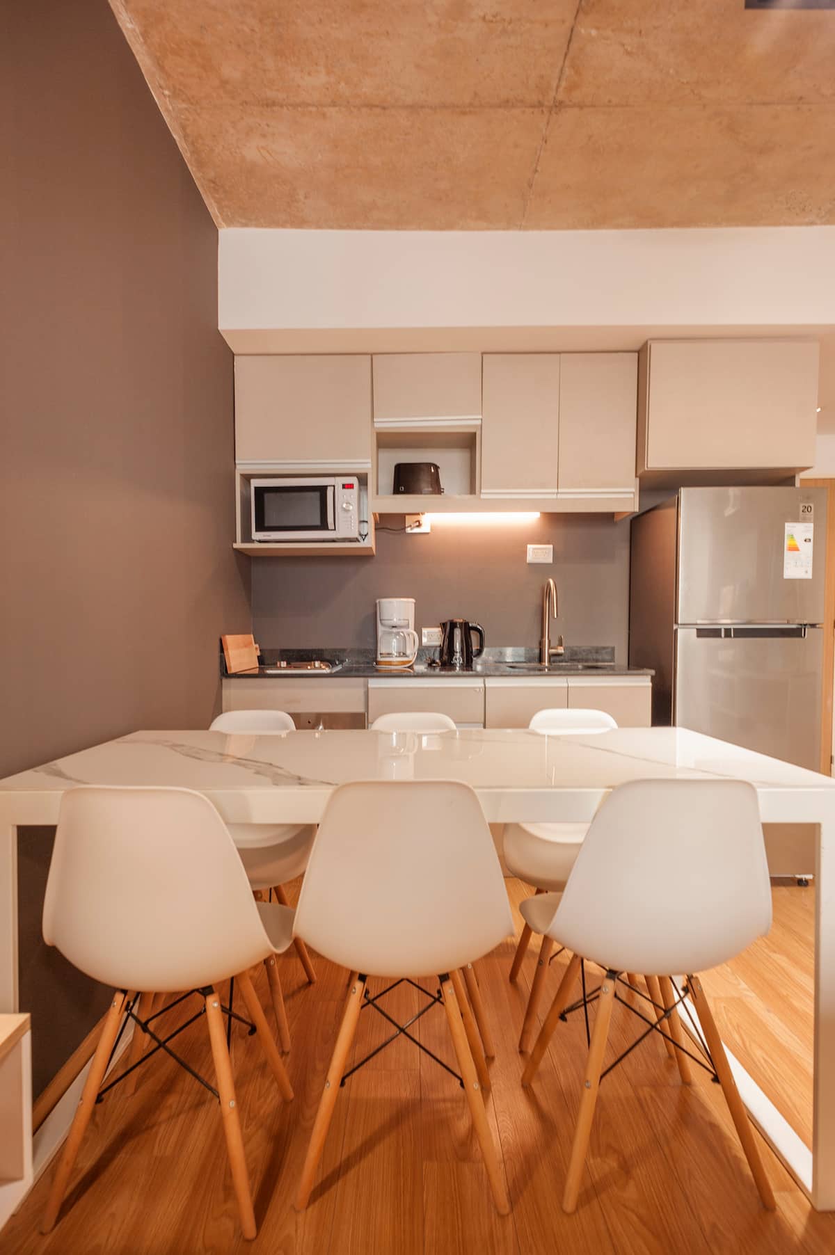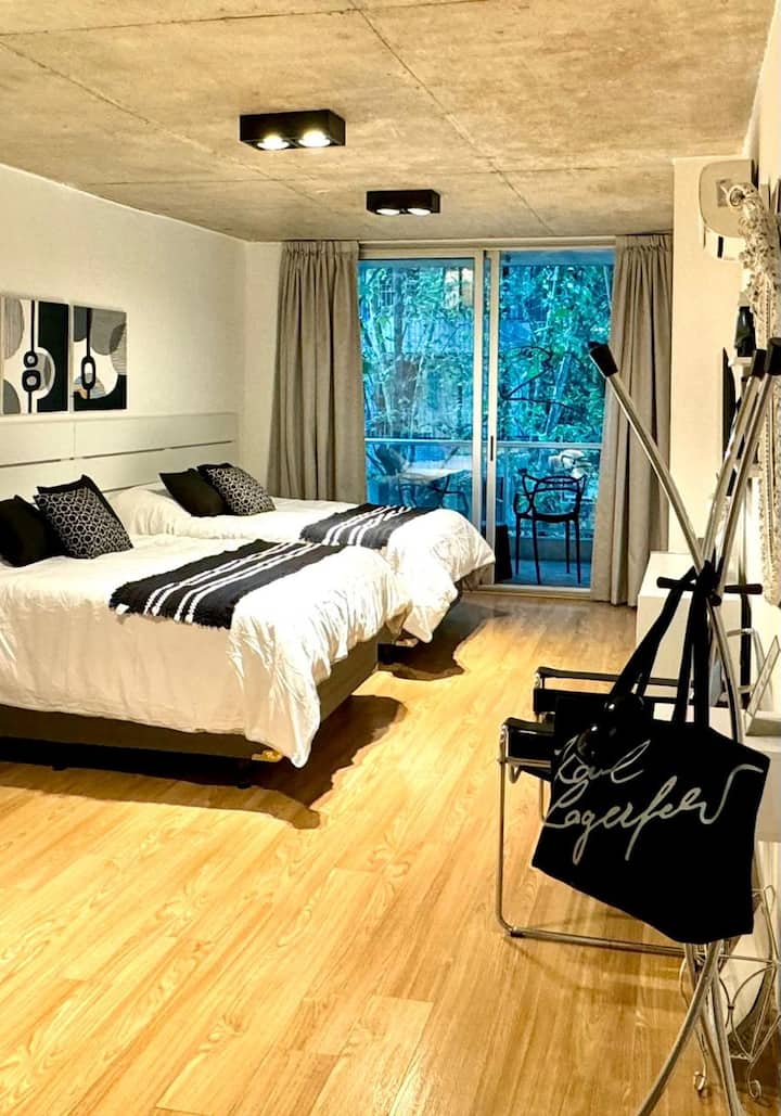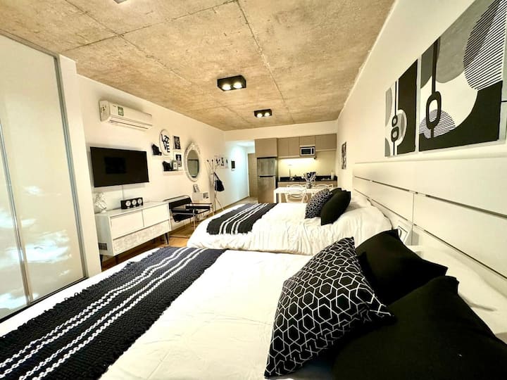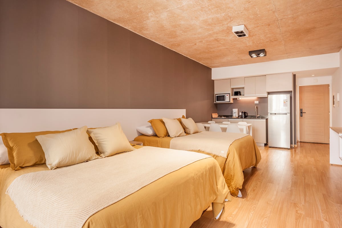 A propriedade reúne 4 apartamentos no mesmo prédio, em Palermo Hollywood. Fica a 3 quadras do Distrito de Arcos e a 200 metros do Arcos Sanatorio. Há acesso autônomo por códigos, com registro 24 horas e entrada sem chave, mediante geração de chave digital por aplicativo. A acomodação inclui toalhas e lençóis; há termoss ecológicos no apartamento.