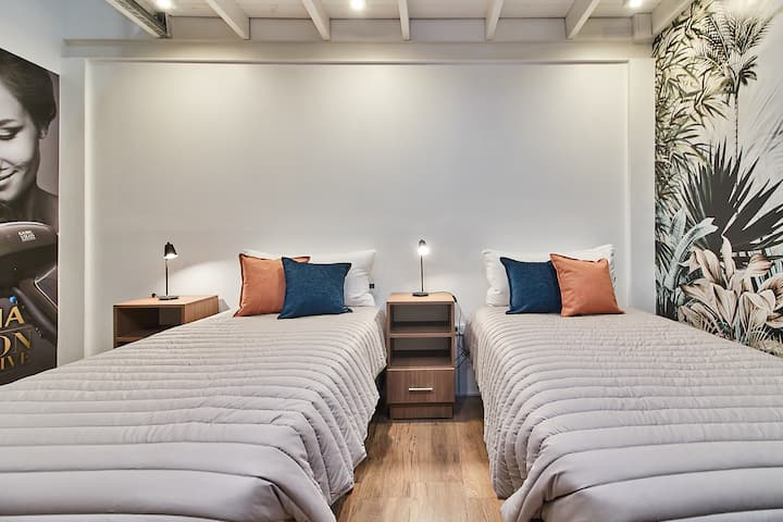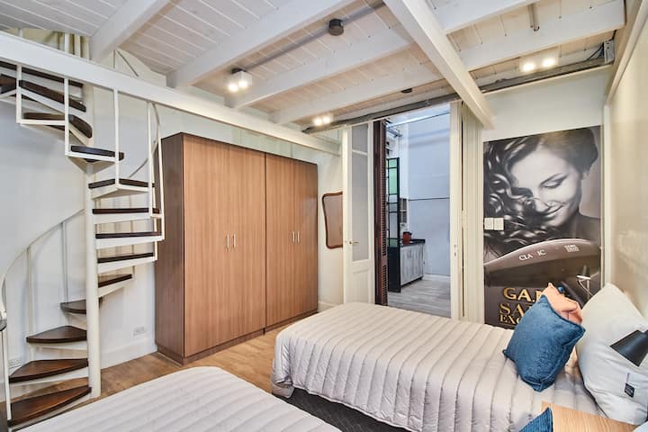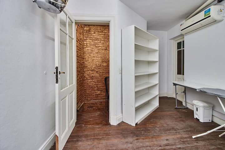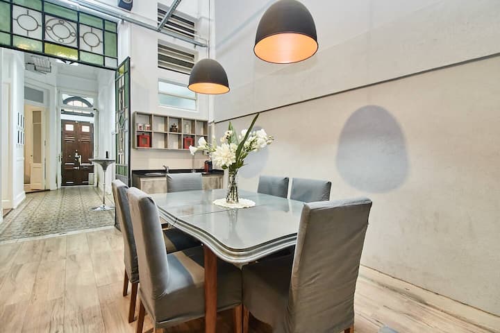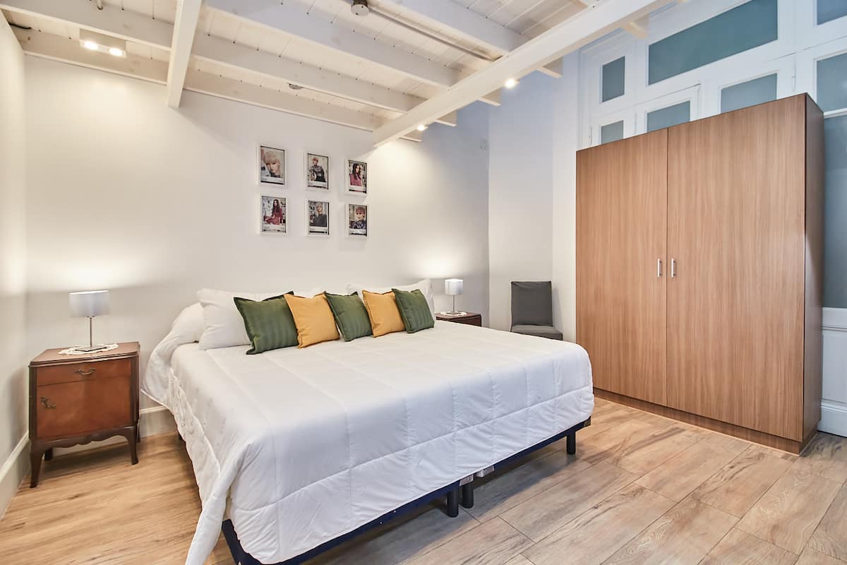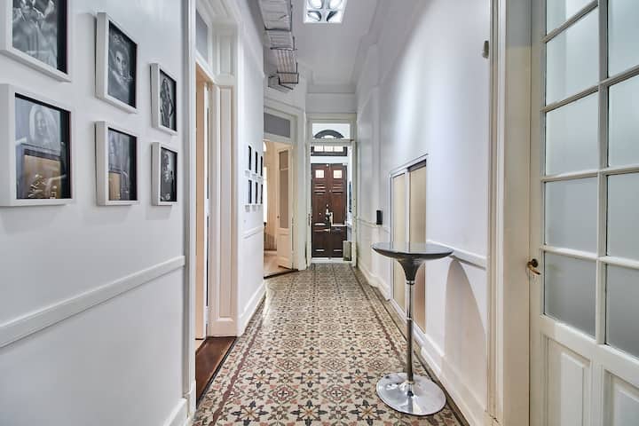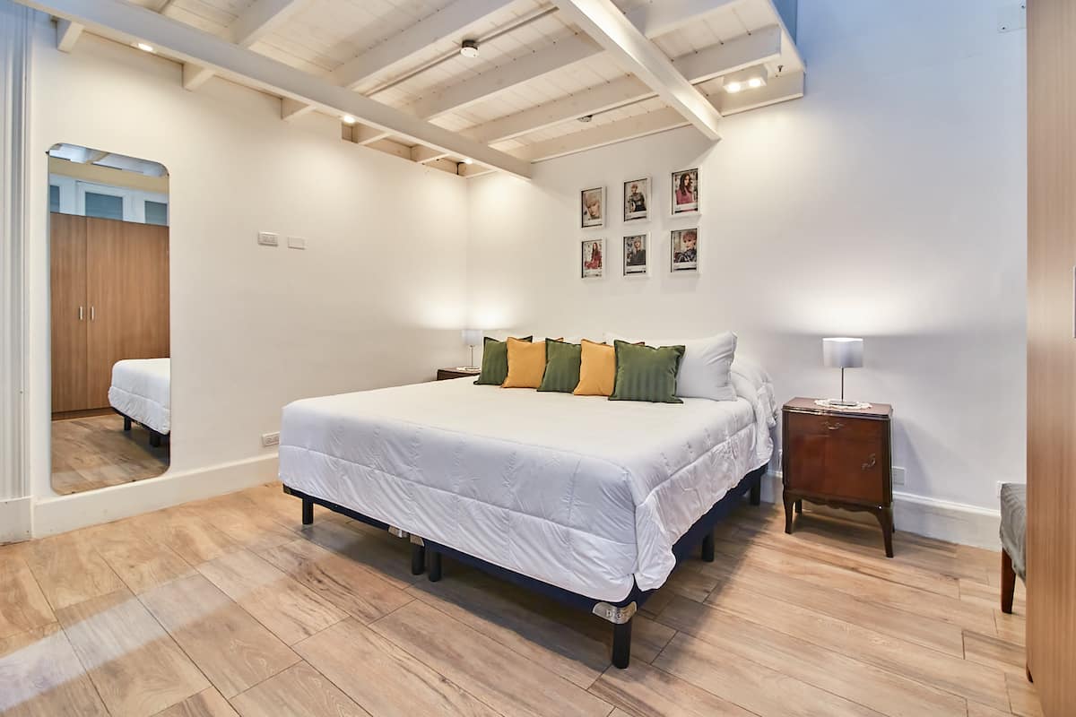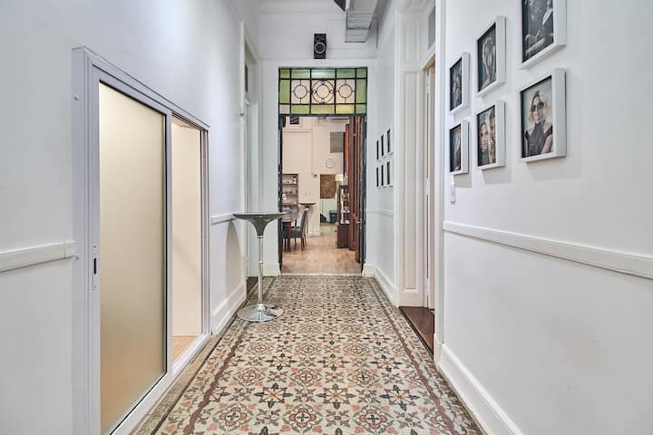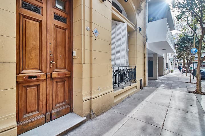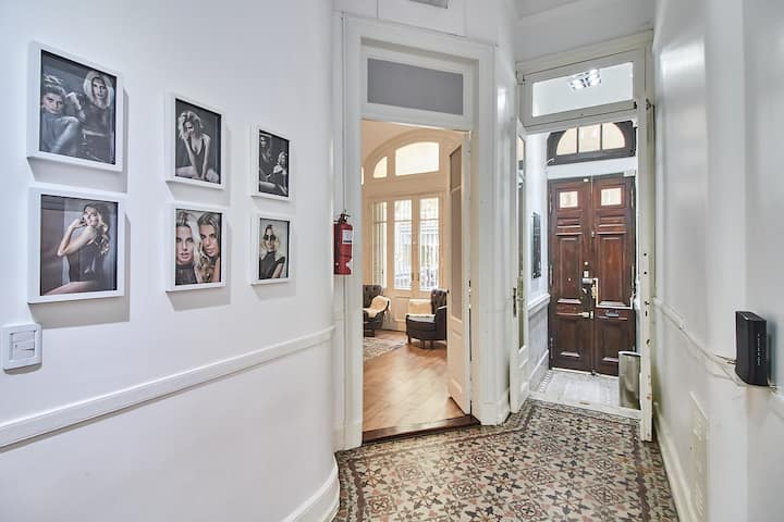 Apartamento em Palermo com 4 quartos. O imóvel foi adaptado a partir de um antigo salão de beleza e conta com duas camas king-size, além de um quarto com duas camas e uma escada que leva a mais duas camas. A sala comporta até 8 hóspedes. O ar-condicionado é central e há sistema integrado de alarme. Há Wi-Fi. Não é permitido fumar dentro da casa.