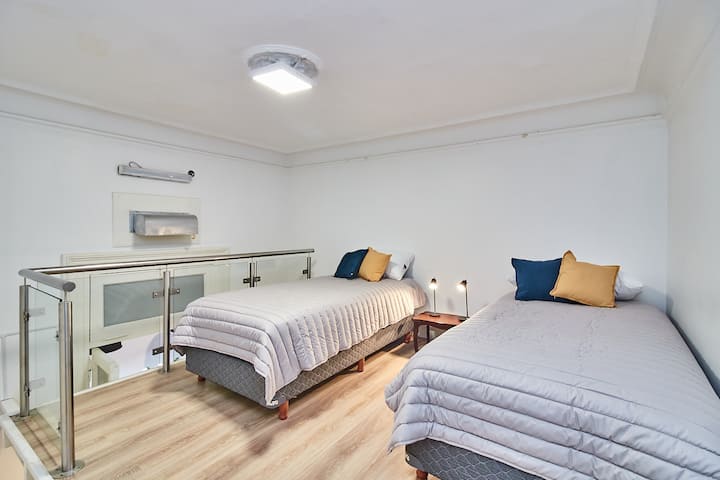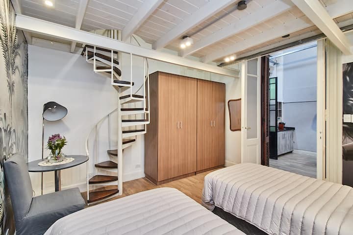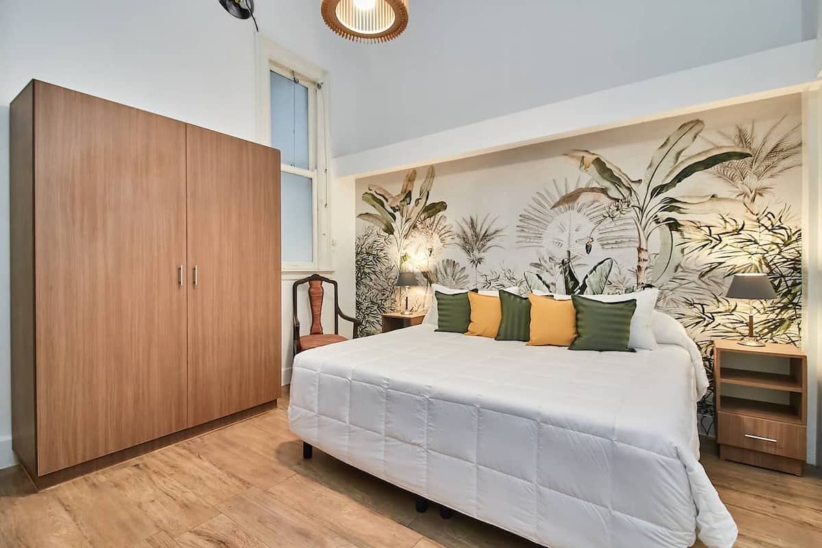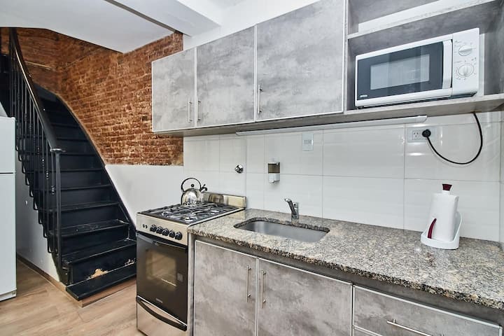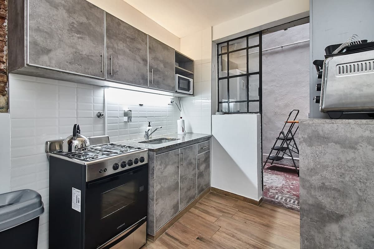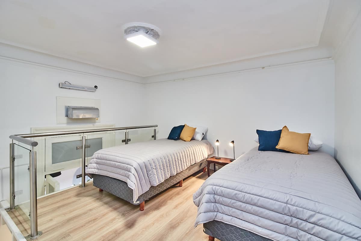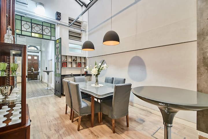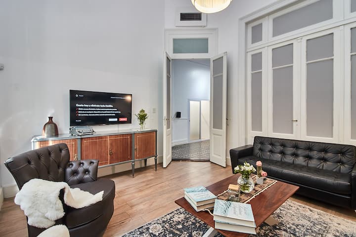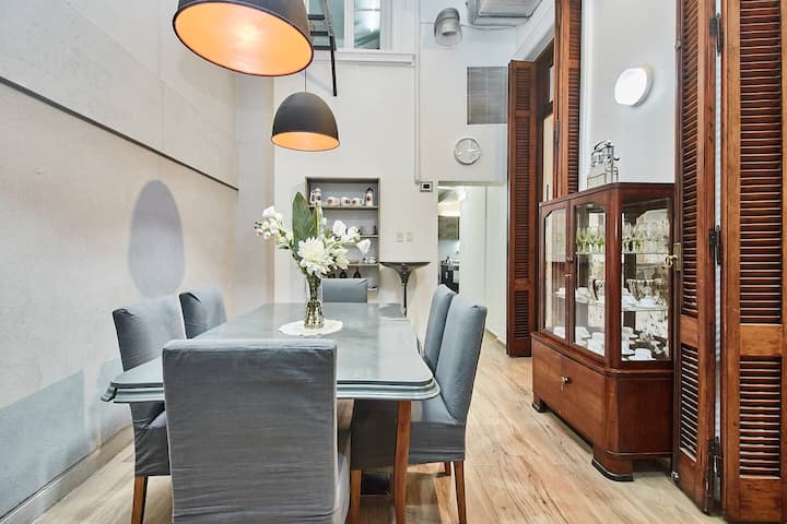 Apartamento em Palermo com 4 quartos. O imóvel foi adaptado a partir de um antigo salão de beleza e conta com duas camas king-size, além de um quarto com duas camas e uma escada que leva a mais duas camas. A sala comporta até 8 hóspedes. O ar-condicionado é central e há sistema integrado de alarme. Há Wi-Fi. Não é permitido fumar dentro da casa.