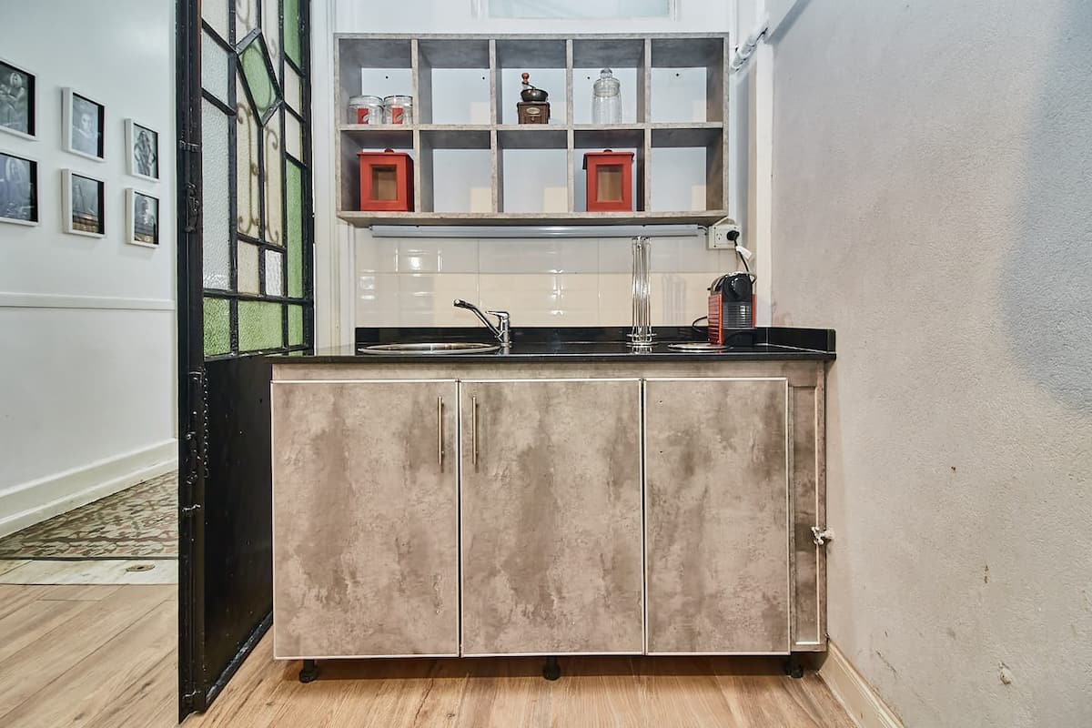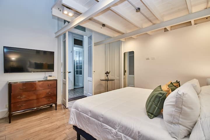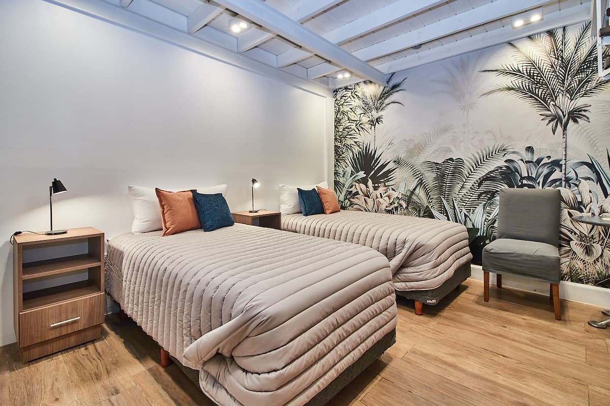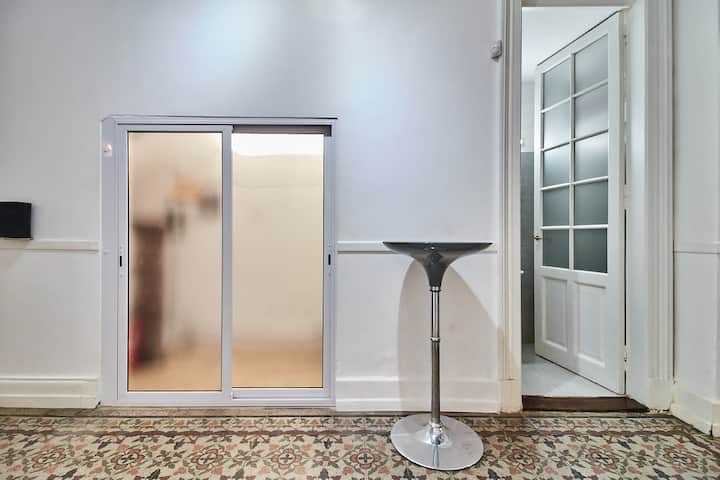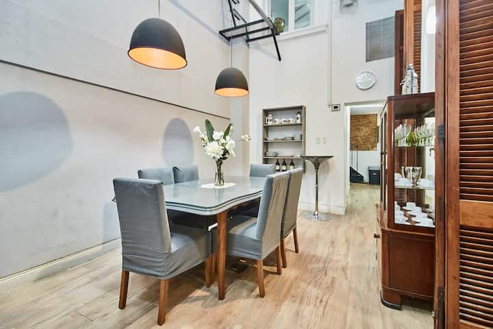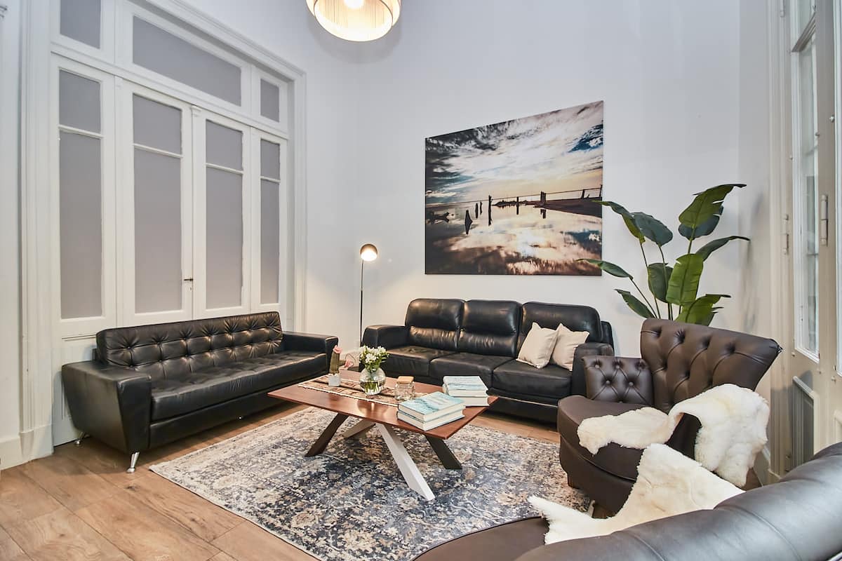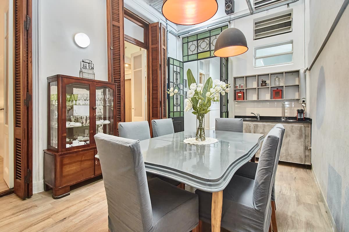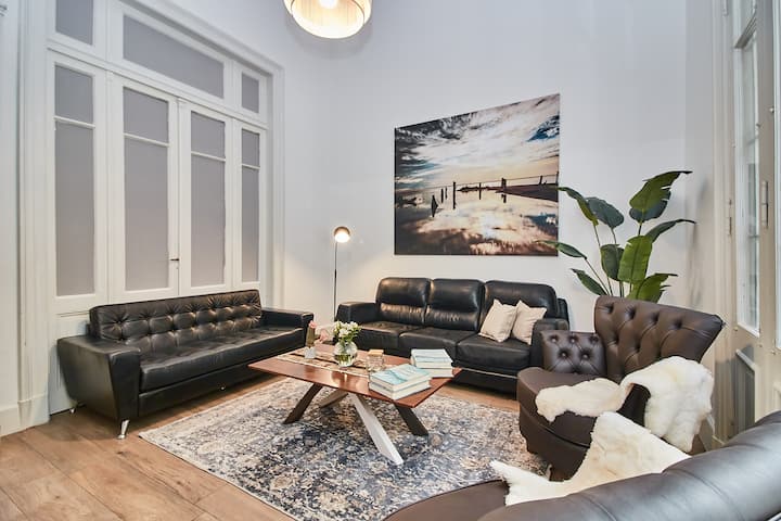 Apartamento em Palermo com 4 quartos. O imóvel foi adaptado a partir de um antigo salão de beleza e conta com duas camas king-size, além de um quarto com duas camas e uma escada que leva a mais duas camas. A sala comporta até 8 hóspedes. O ar-condicionado é central e há sistema integrado de alarme. Há Wi-Fi. Não é permitido fumar dentro da casa.