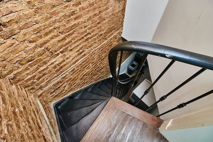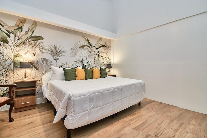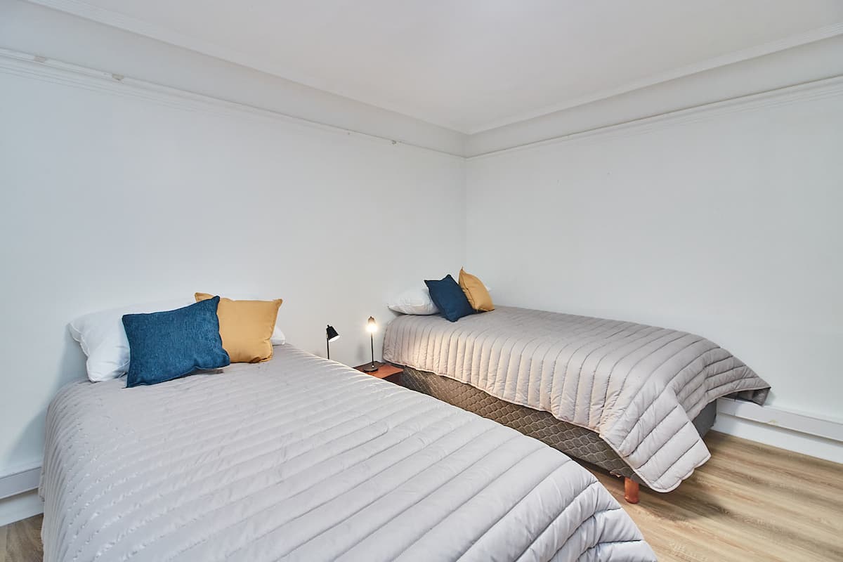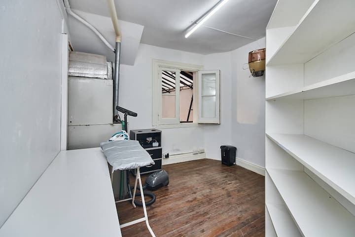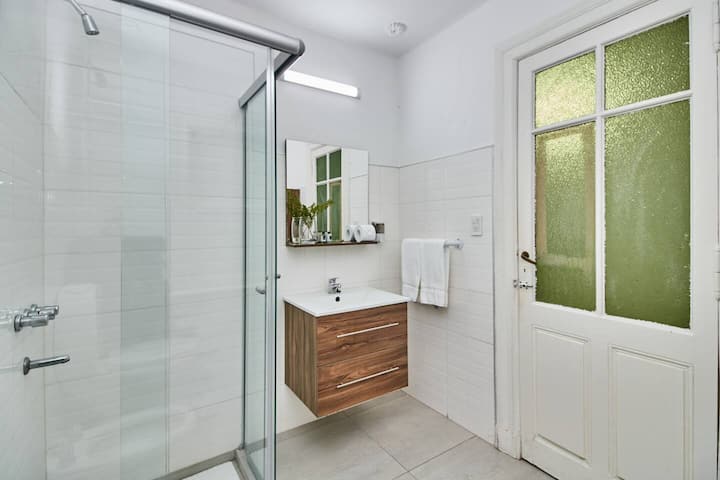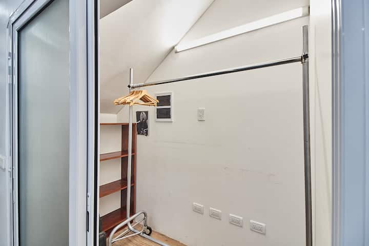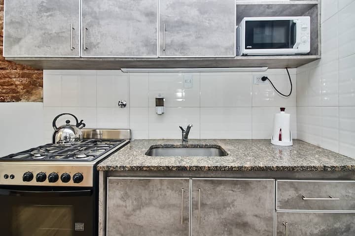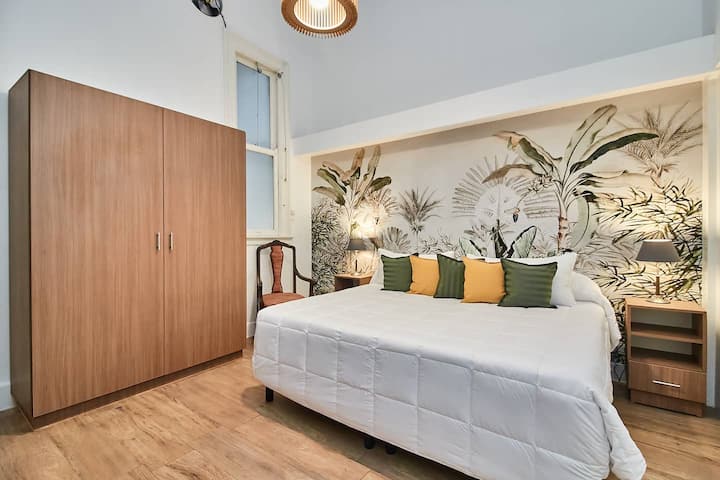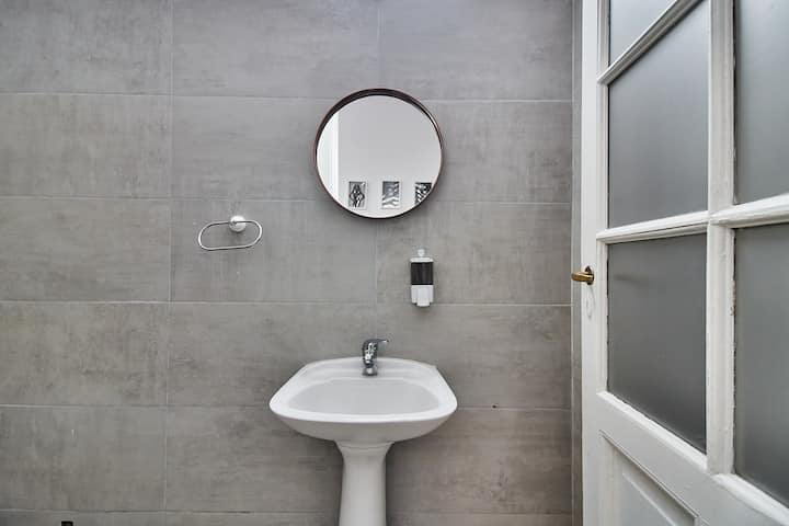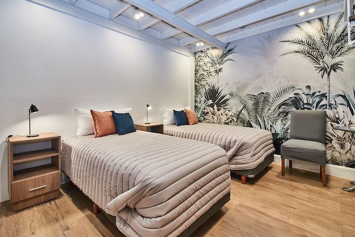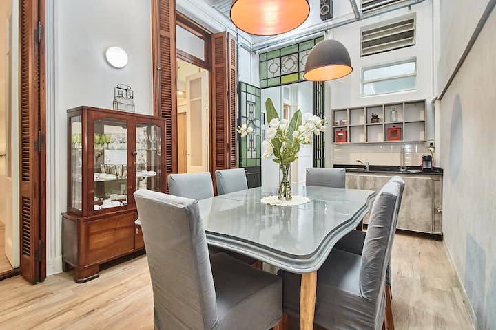 Apartamento em Palermo com 4 quartos. O imóvel foi adaptado a partir de um antigo salão de beleza e conta com duas camas king-size, além de um quarto com duas camas e uma escada que leva a mais duas camas. A sala comporta até 8 hóspedes. O ar-condicionado é central e há sistema integrado de alarme. Há Wi-Fi. Não é permitido fumar dentro da casa.