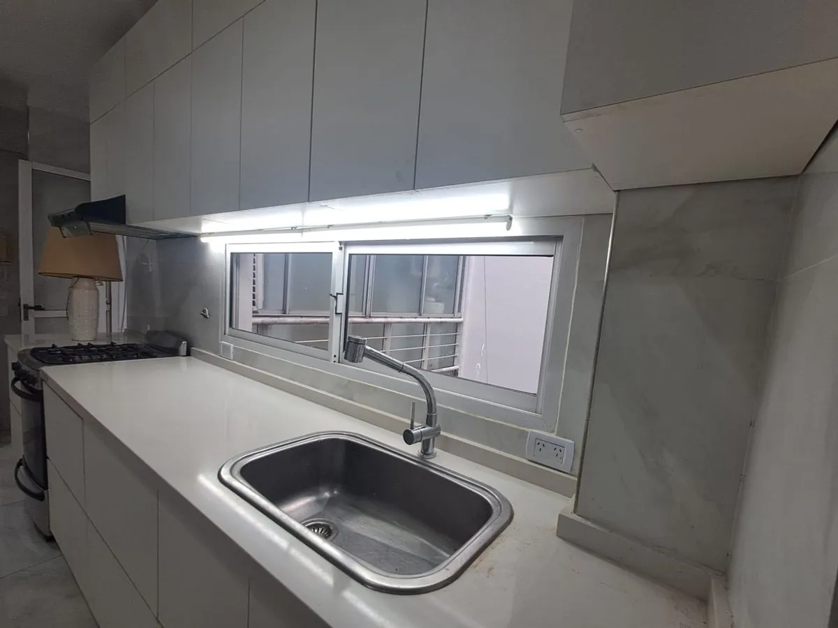 Apartamento com 4 quartos, 1 banheiro completo e 1 lavabo em Palermo, no 7º andar, de frente para a rua. Possui 95,80 m² cobertos e 111,89 m² totais, sala de estar/jantar com varanda corrida e vista aberta, além de cozinha reformada com fogão a gás e exaustor. Inclui quarto de serviço e área de lavanderia acessíveis pela cozinha, bem como banheiro com banheira e lavabo; todos os ambientes têm iluminação. O aluguel inclui um espaço de garagem (guardacoches). O prédio tem 2 elevadores, encarregado